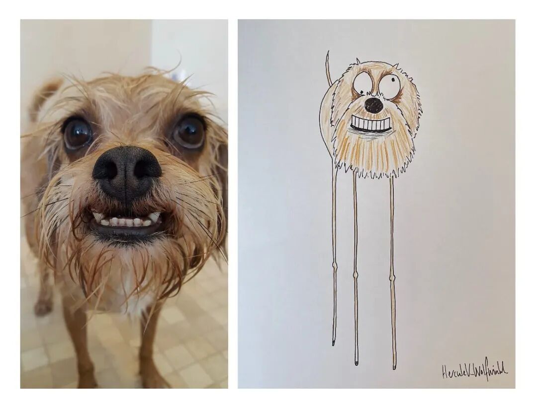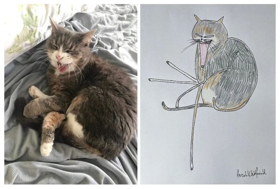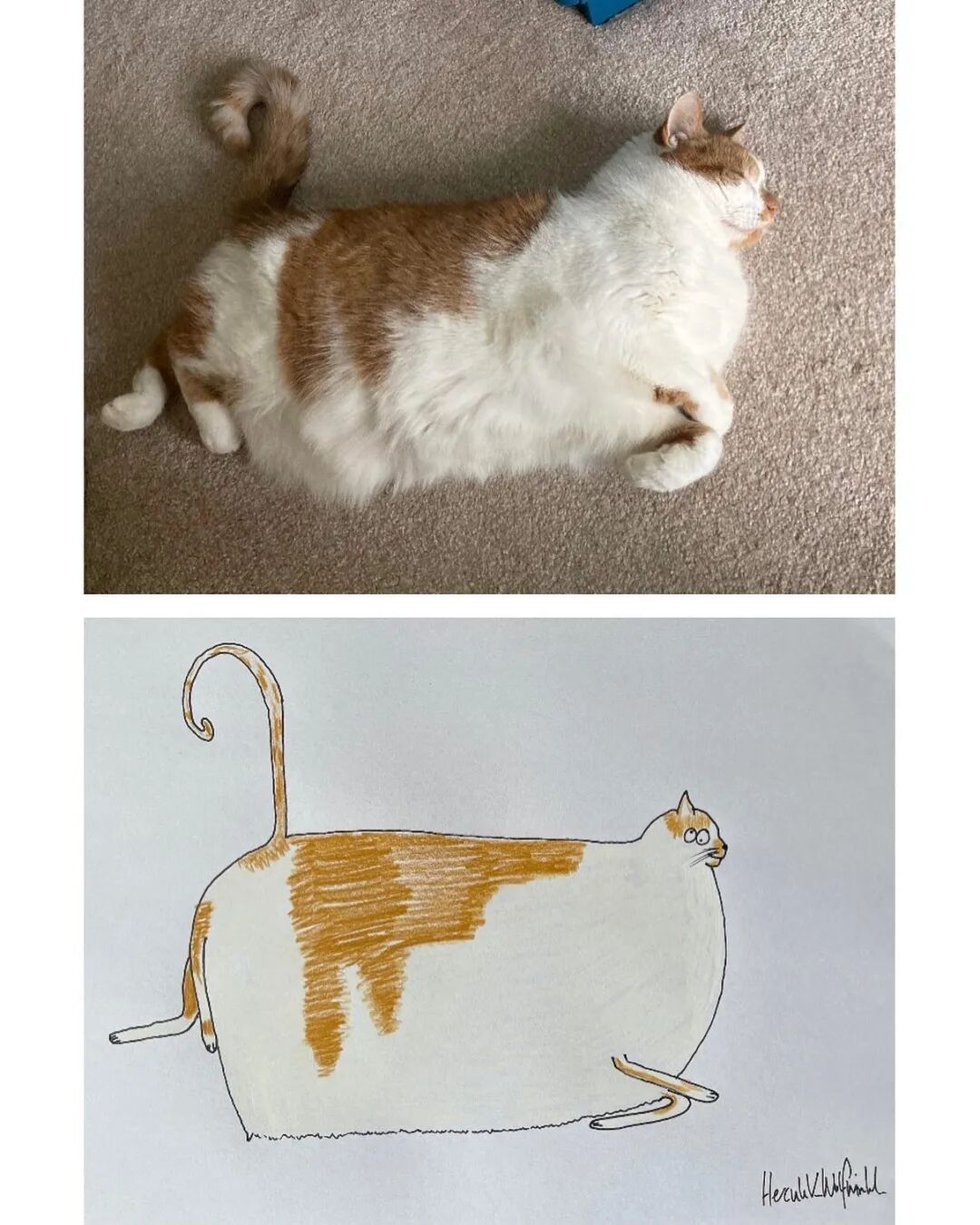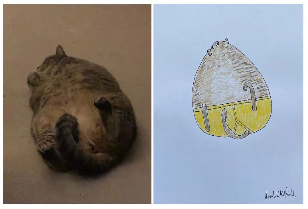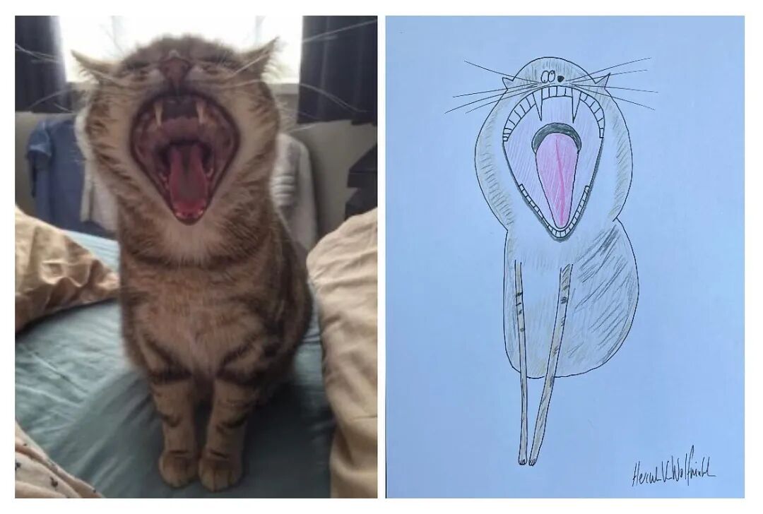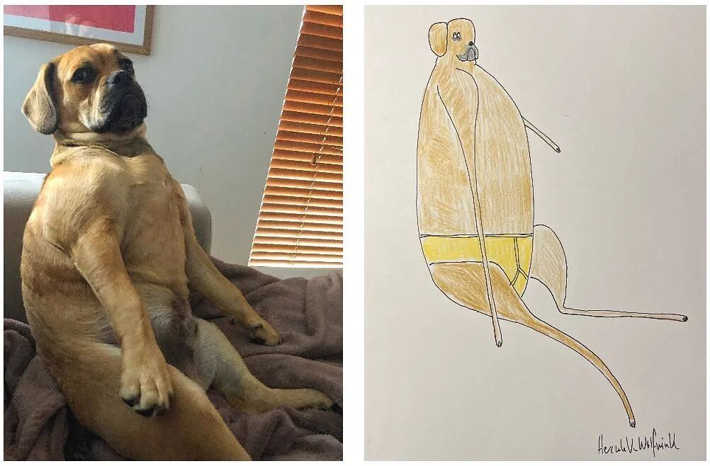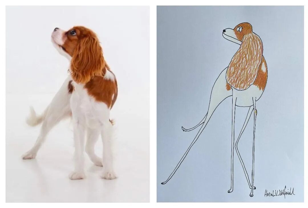 宠物是人类最好的朋友,一些喜欢宠物的人,更是把宠物作为自己的家人一样去对待,为它们拍摄有意思的照片,很多人就是拿着自己拍摄的宠物照片来让菲尔·赫克斯画成一幅画,可是,在他这里,即便是很漂亮的照片,也会被画得面目全非,被拉长的身子和大腿,呆呆的表情眼睛......画风一下就变得爆笑起来。