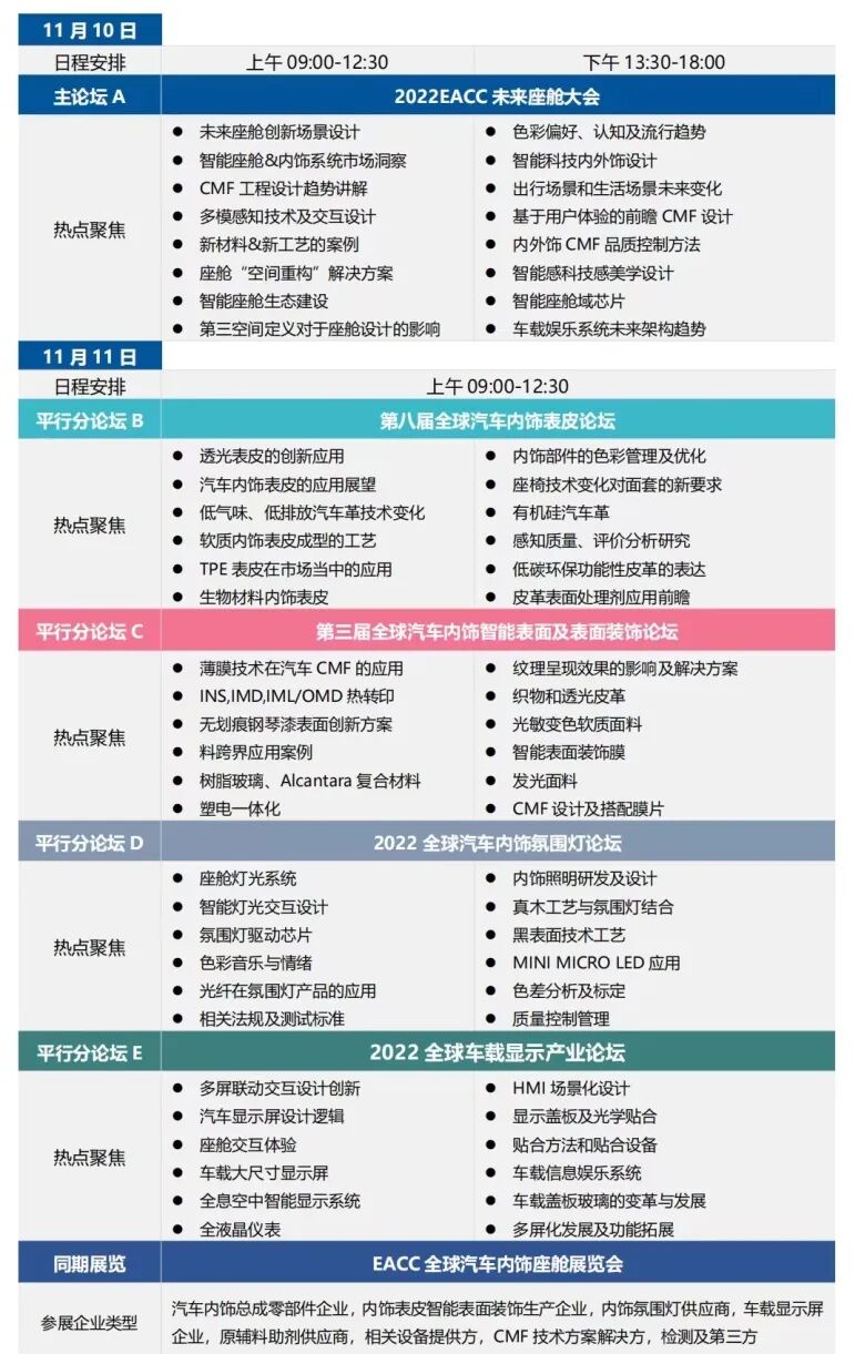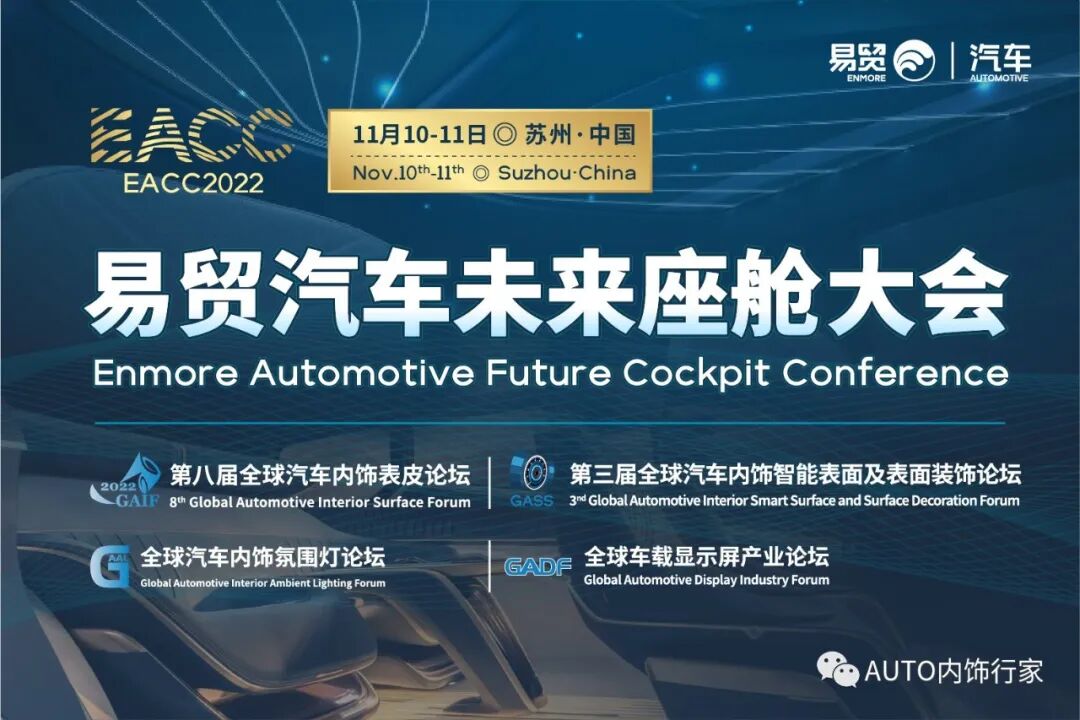 由易贸汽主办的EACC2022易贸汽车未来座舱大会将于2022年11月10-11日,在苏州举行,同期将举行第八届全球汽车内饰表皮论坛、第三届全球汽车内饰智能表面及表面装饰论坛、全球汽车内饰氛围灯论坛、全球车载显示屏产业论坛,邀请超过千位的全球汽车内饰座舱领域的专家一同探讨交流。