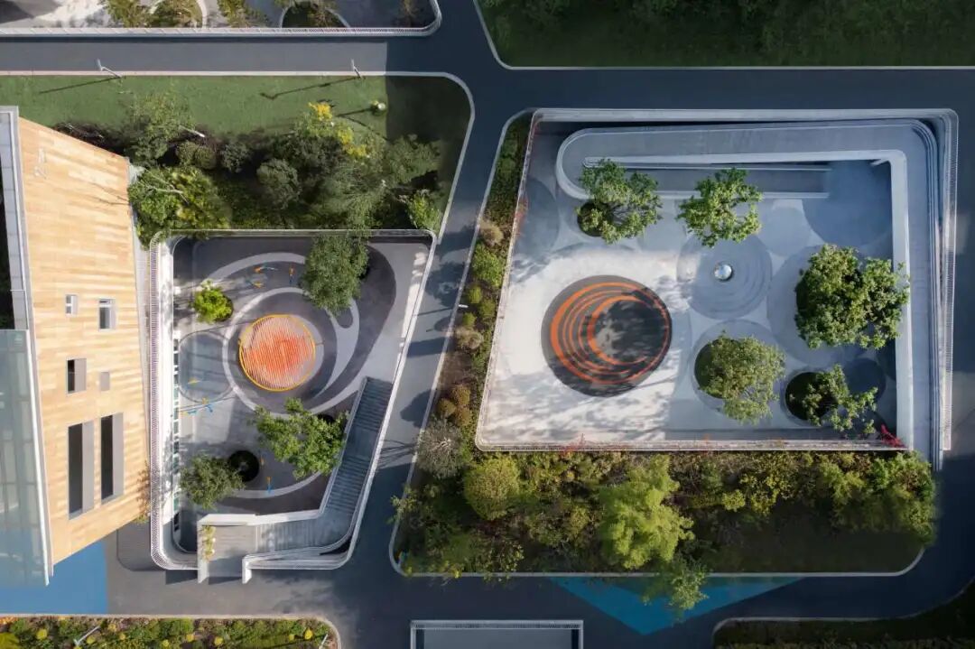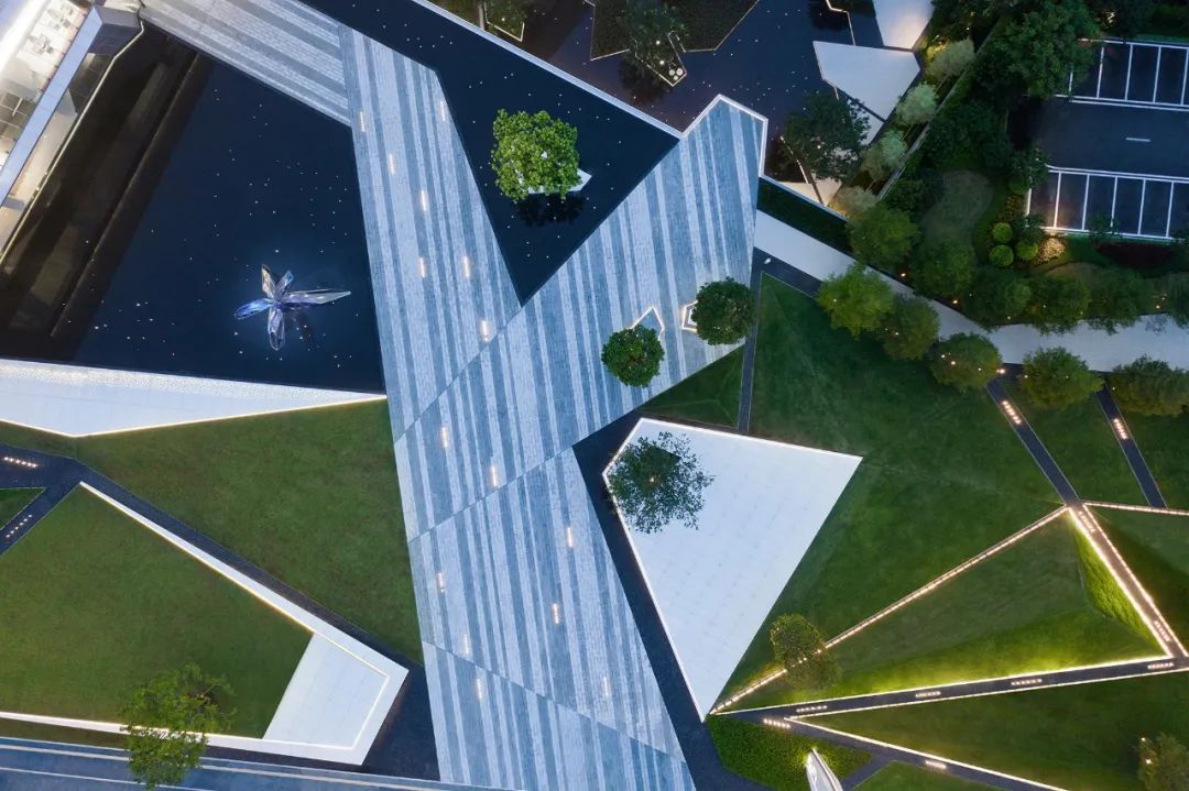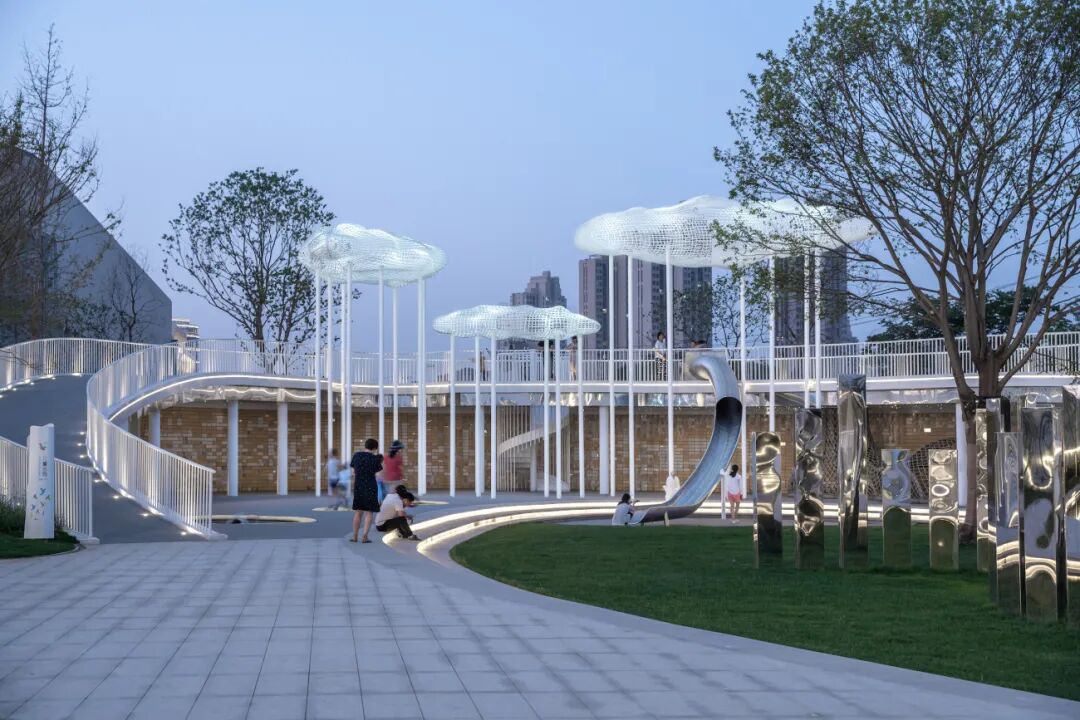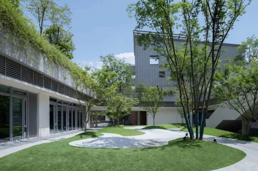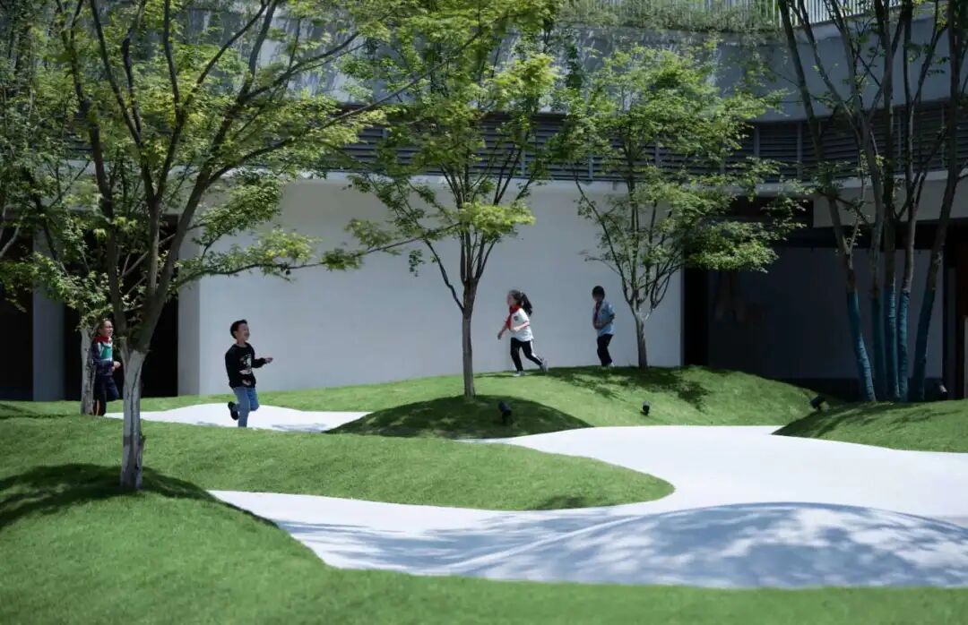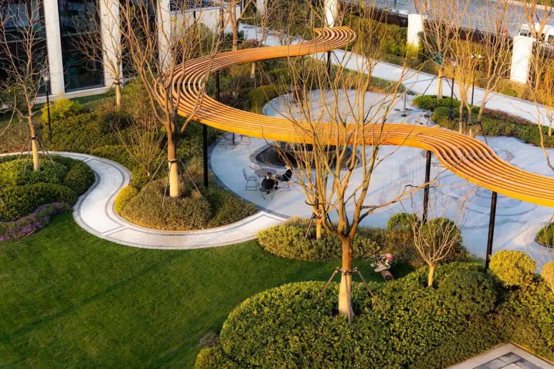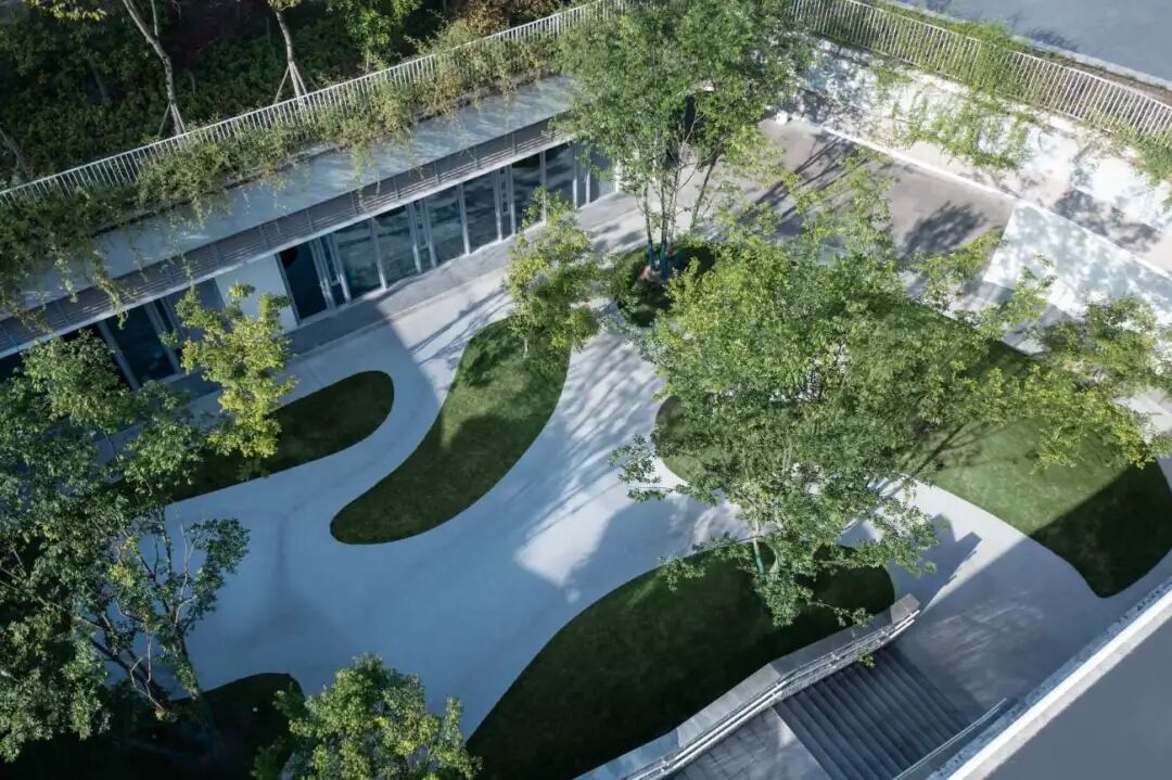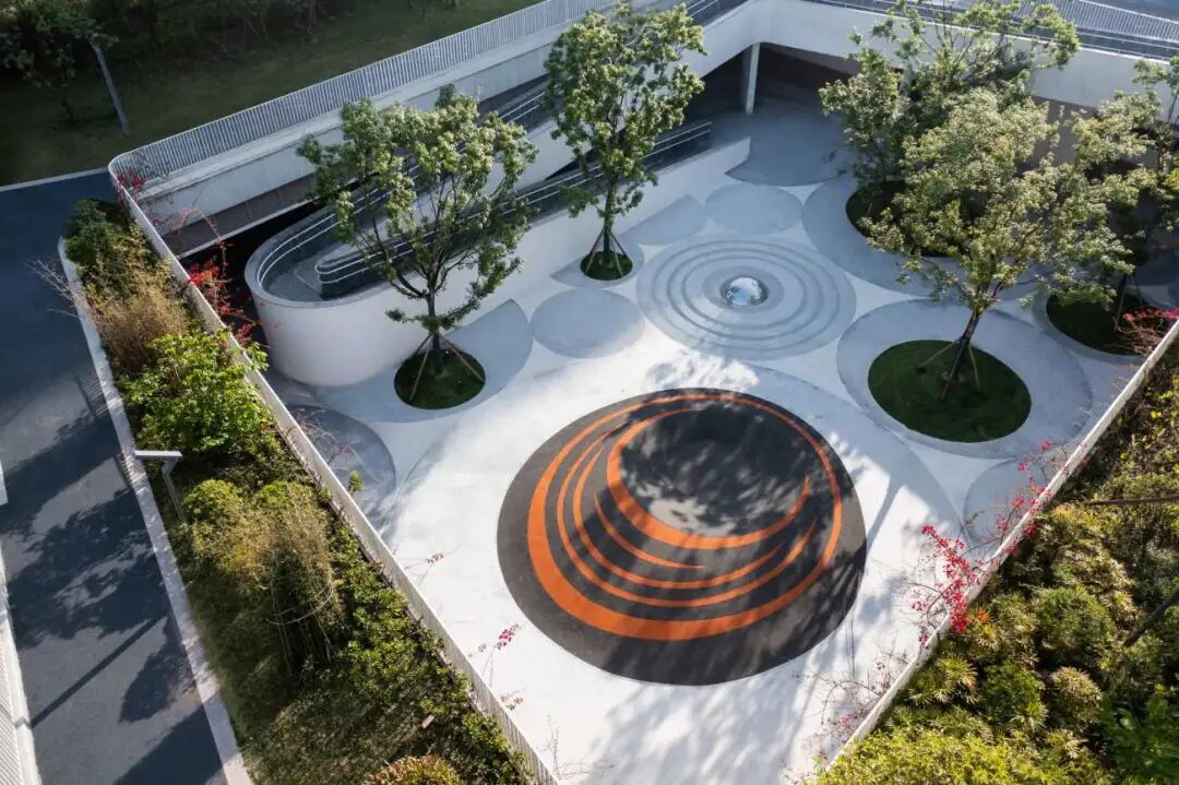 休闲廊架延伸至场地中心,一汪清水、一尊雕塑、绿色掩映下创造一个诗意的对话场景。