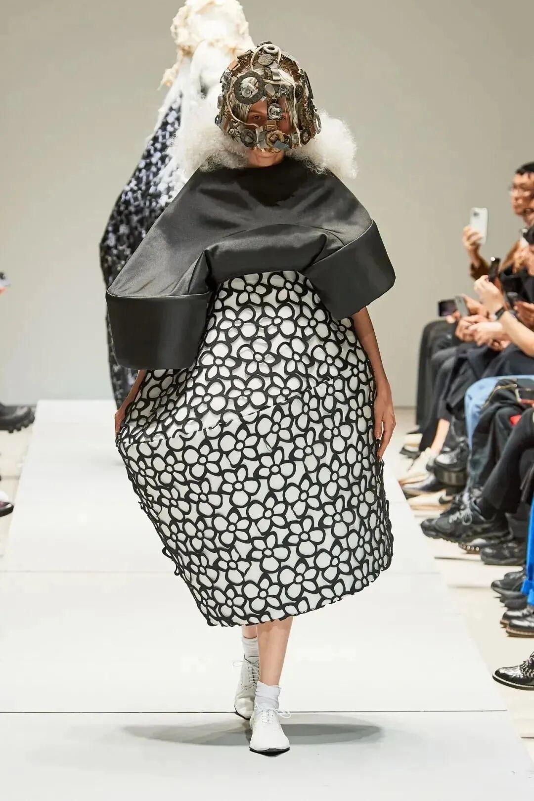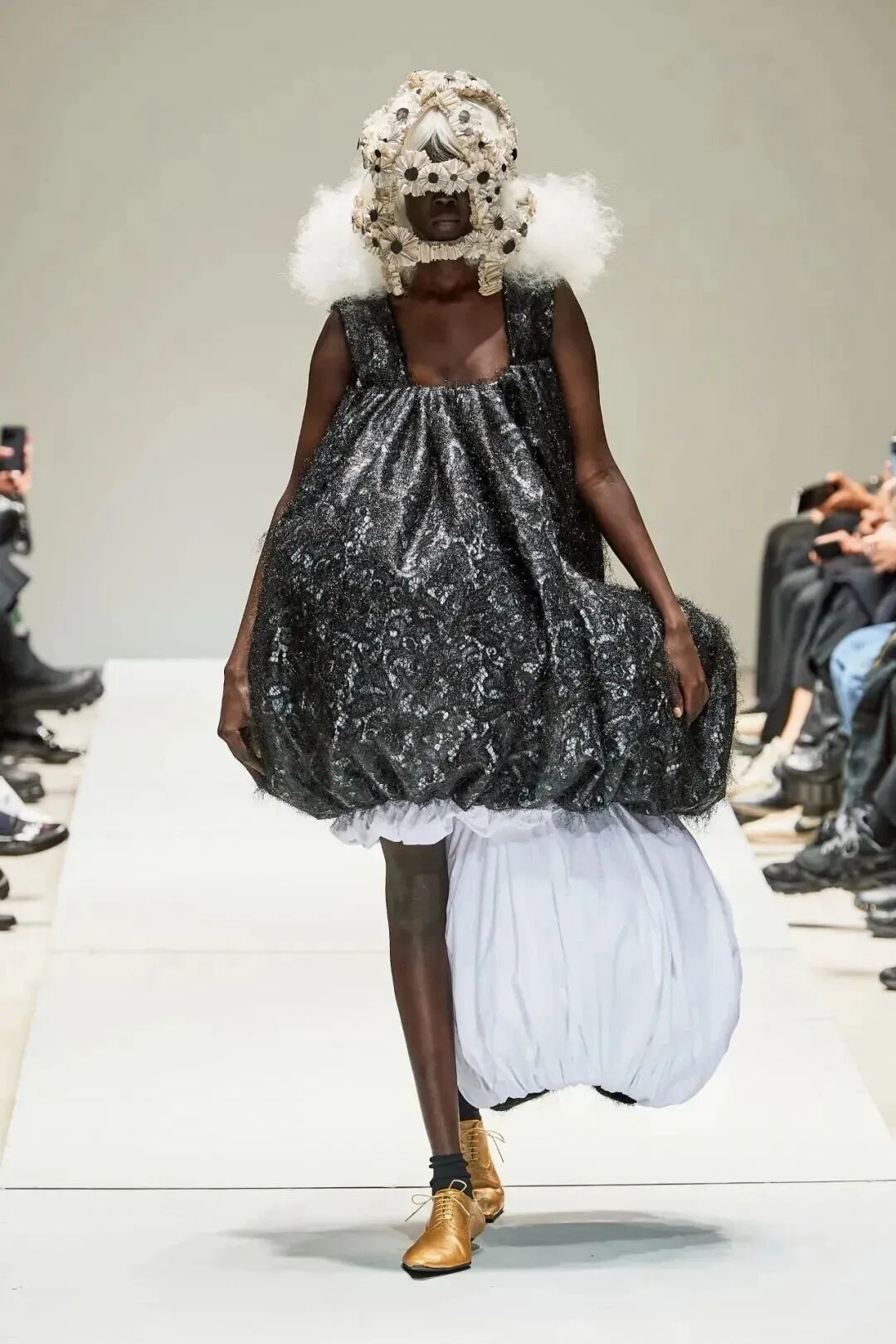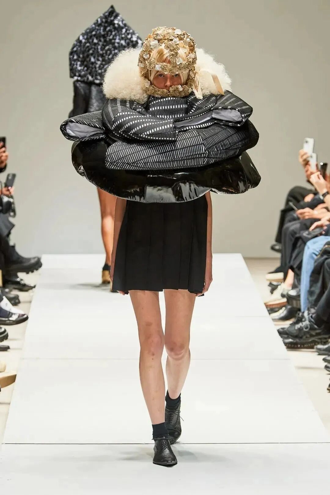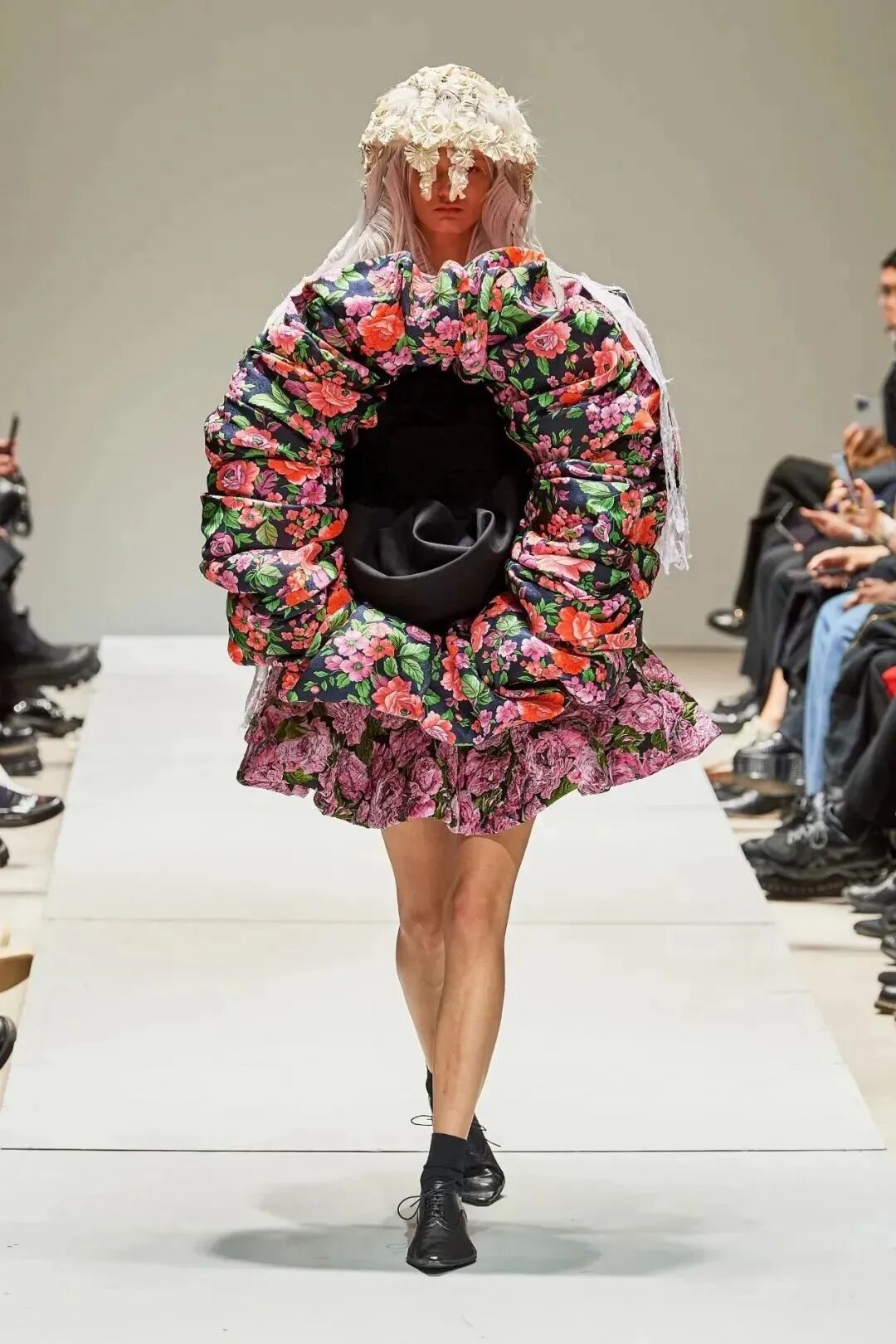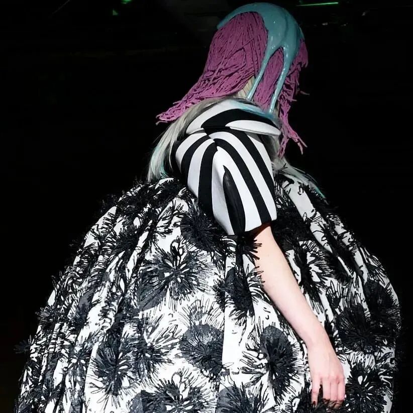 廓形随着想象的曲折和聚合而膨胀、扭曲、炸毁或缩小。除了鞋子,都不是常规尺码,面料由光滑的亮漆蕾丝过渡到甜美的彩色花卉提花,配合复杂的头饰,仿佛行走的雕塑,你永远无法琢磨透彻。