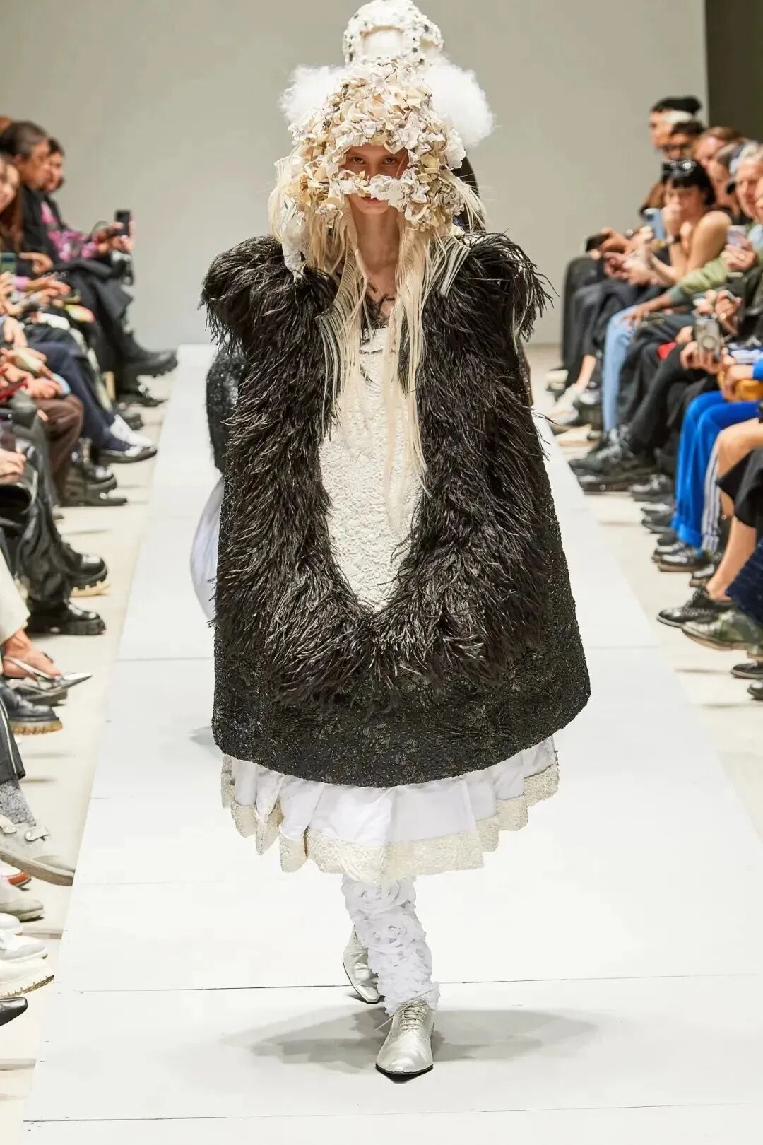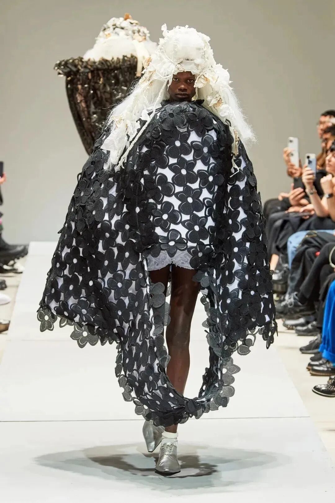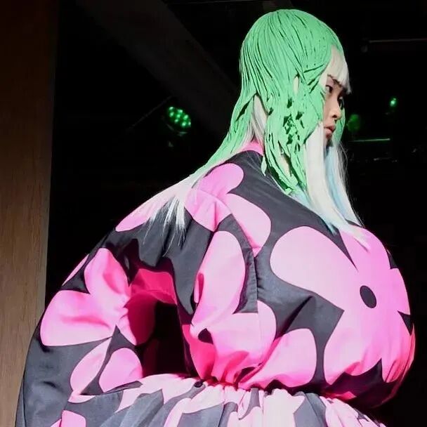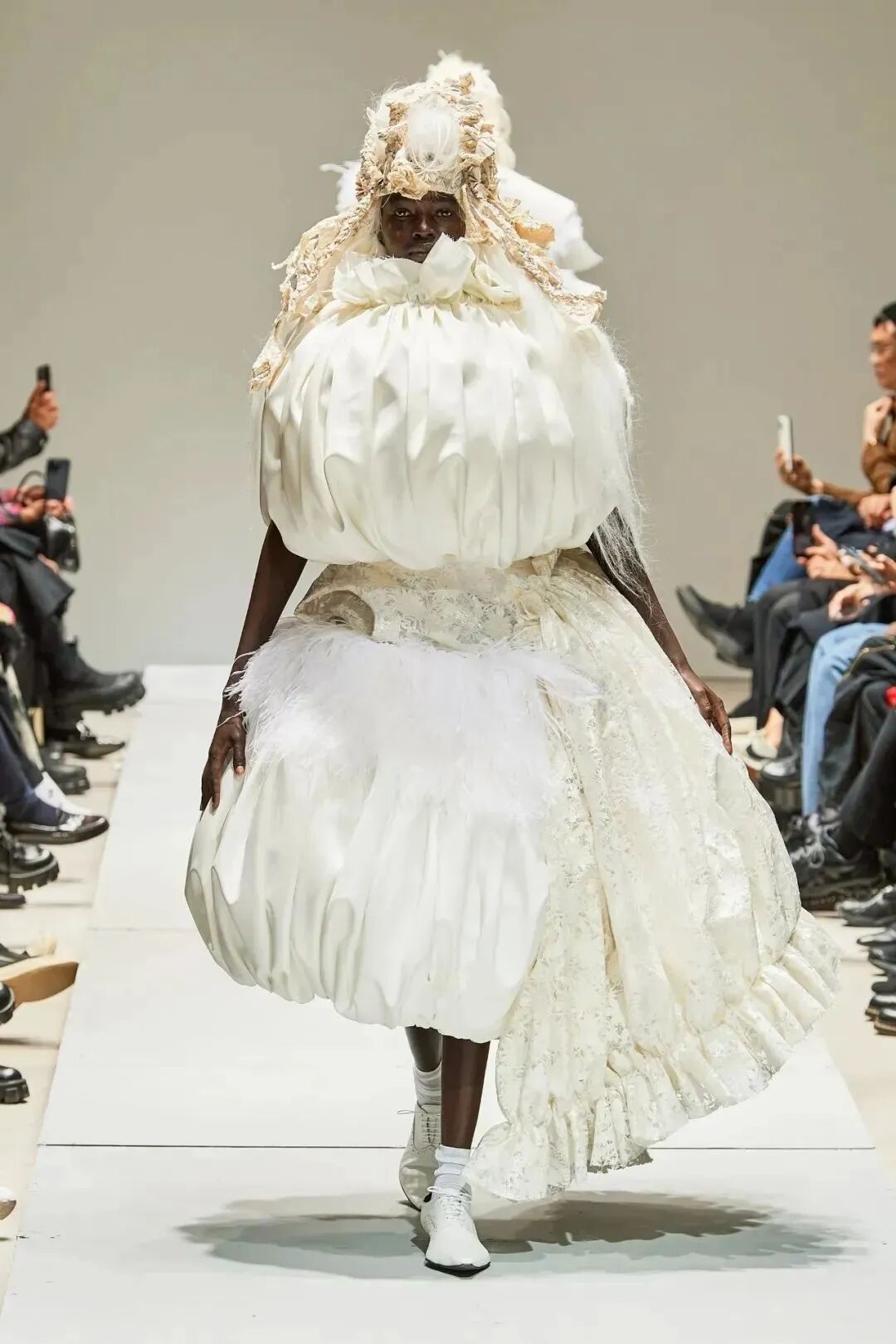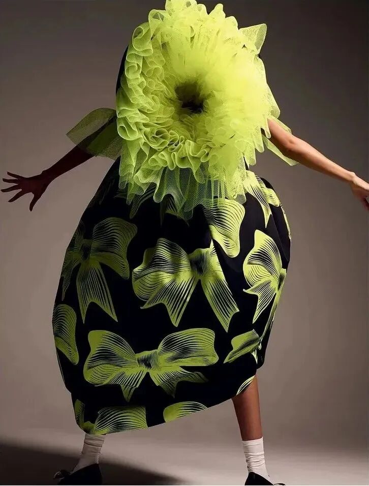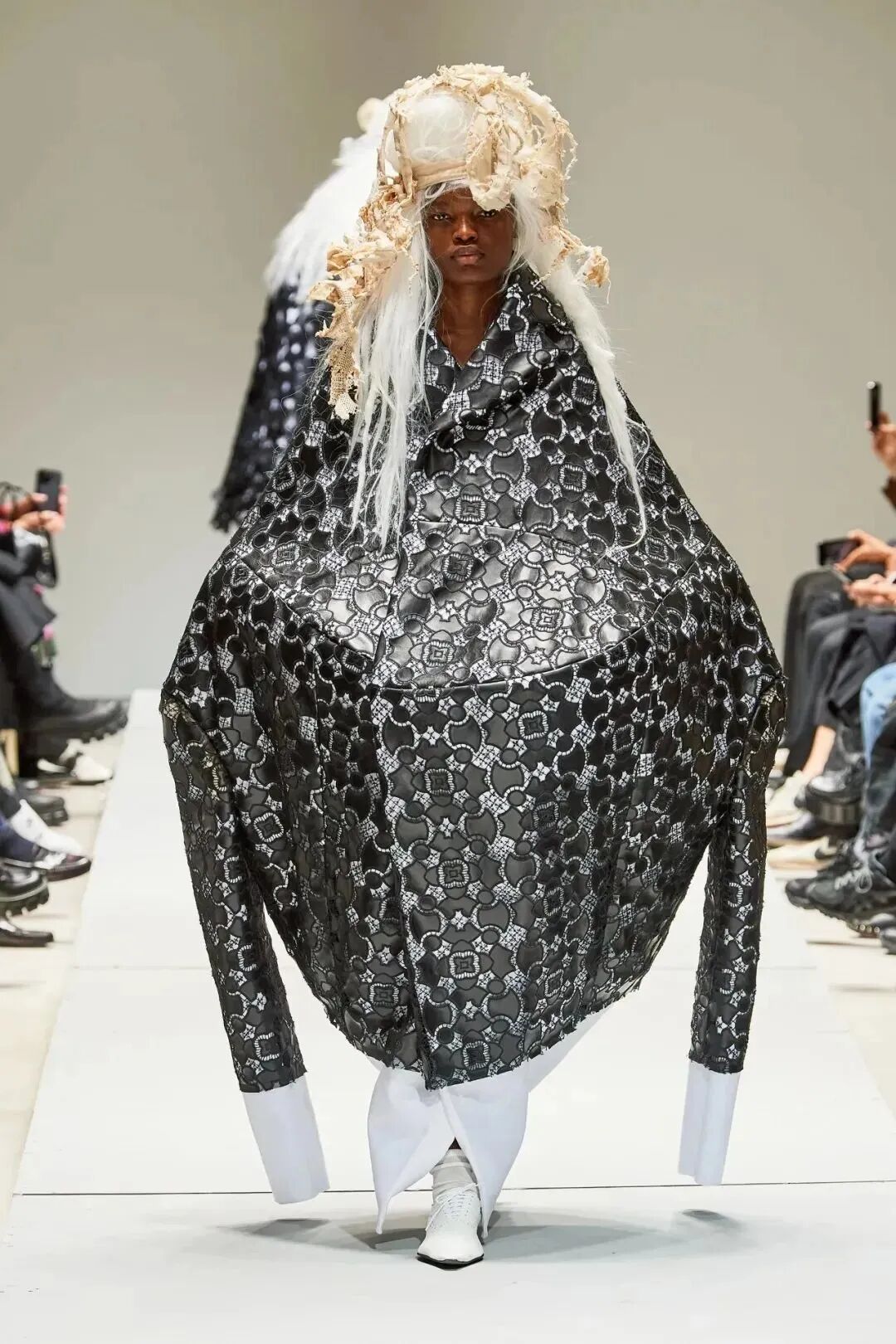 廓形随着想象的曲折和聚合而膨胀、扭曲、炸毁或缩小。除了鞋子,都不是常规尺码,面料由光滑的亮漆蕾丝过渡到甜美的彩色花卉提花,配合复杂的头饰,仿佛行走的雕塑,你永远无法琢磨透彻。