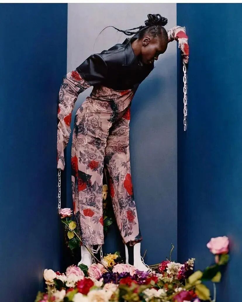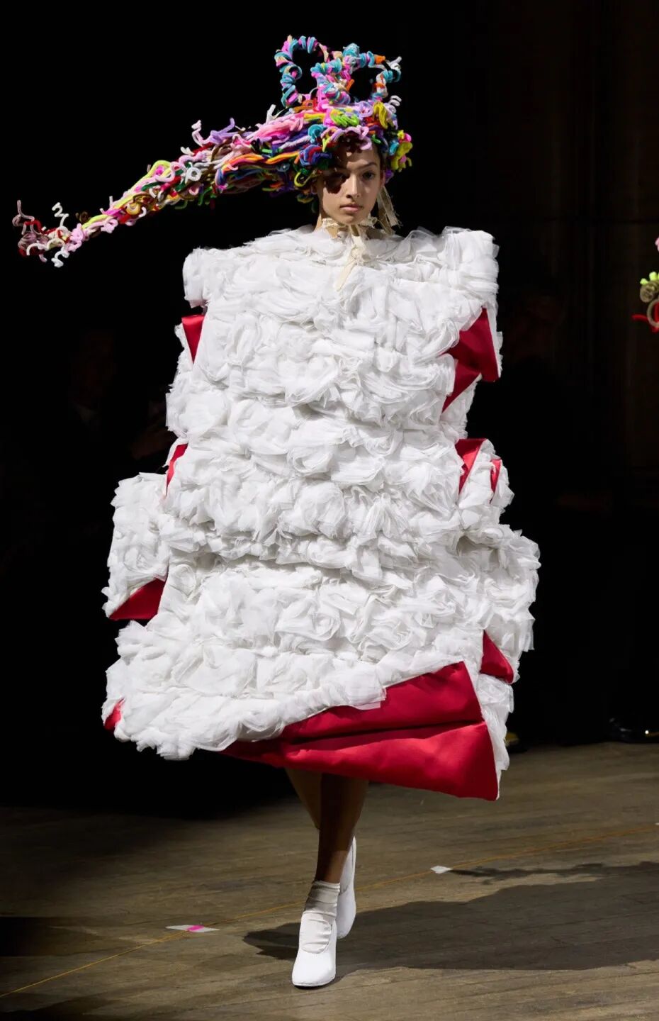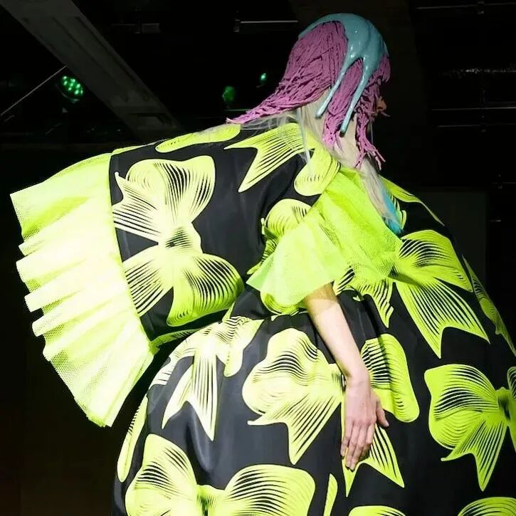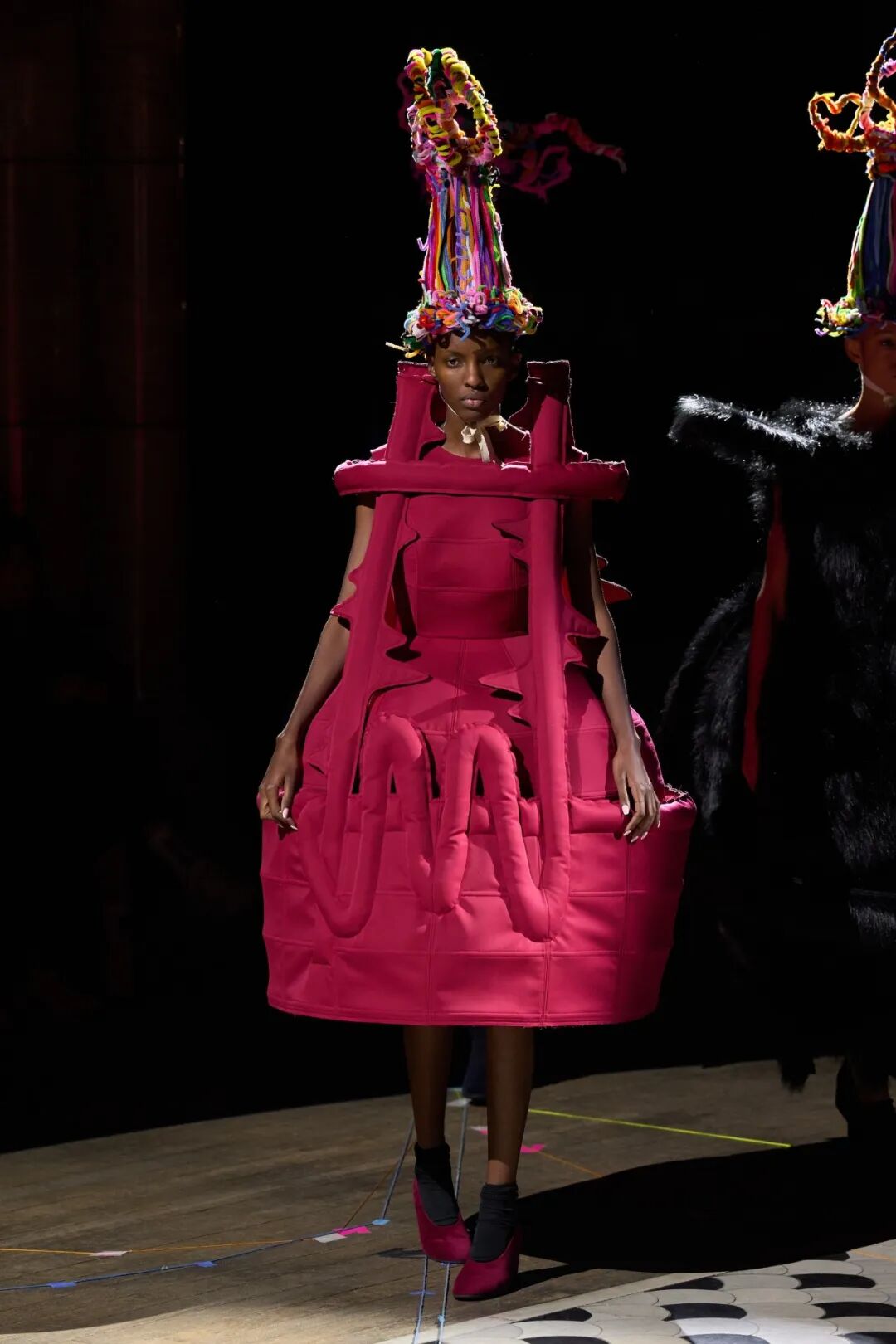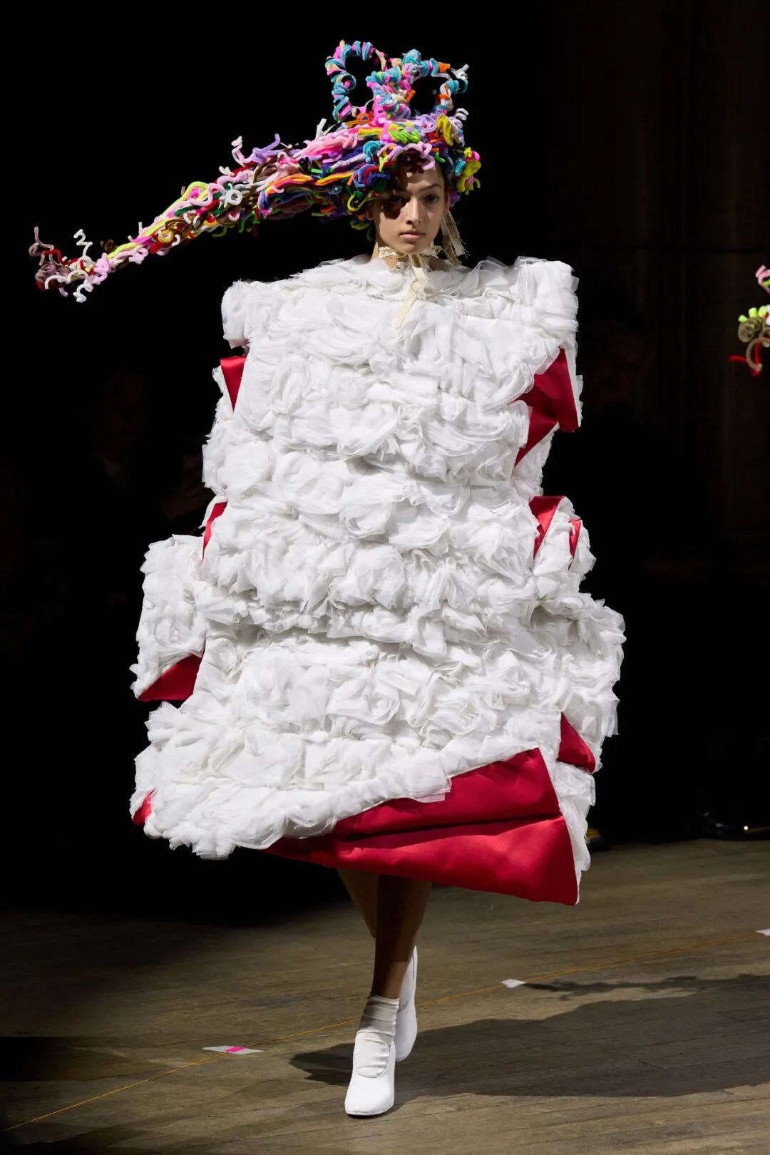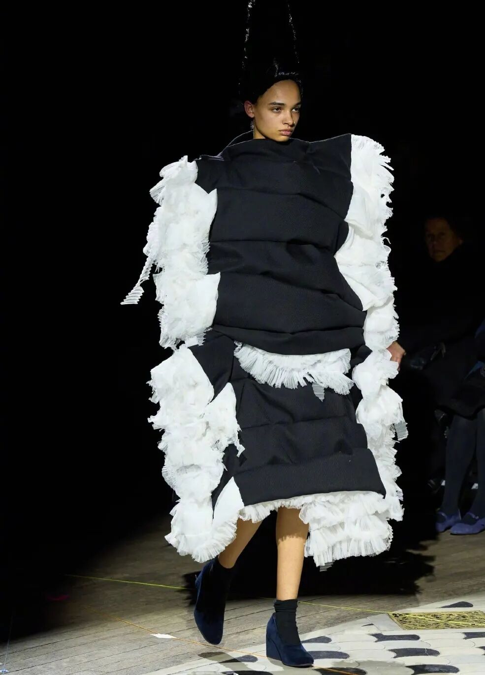 廓形随着想象的曲折和聚合而膨胀、扭曲、炸毁或缩小。除了鞋子,都不是常规尺码,面料由光滑的亮漆蕾丝过渡到甜美的彩色花卉提花,配合复杂的头饰,仿佛行走的雕塑,你永远无法琢磨透彻。