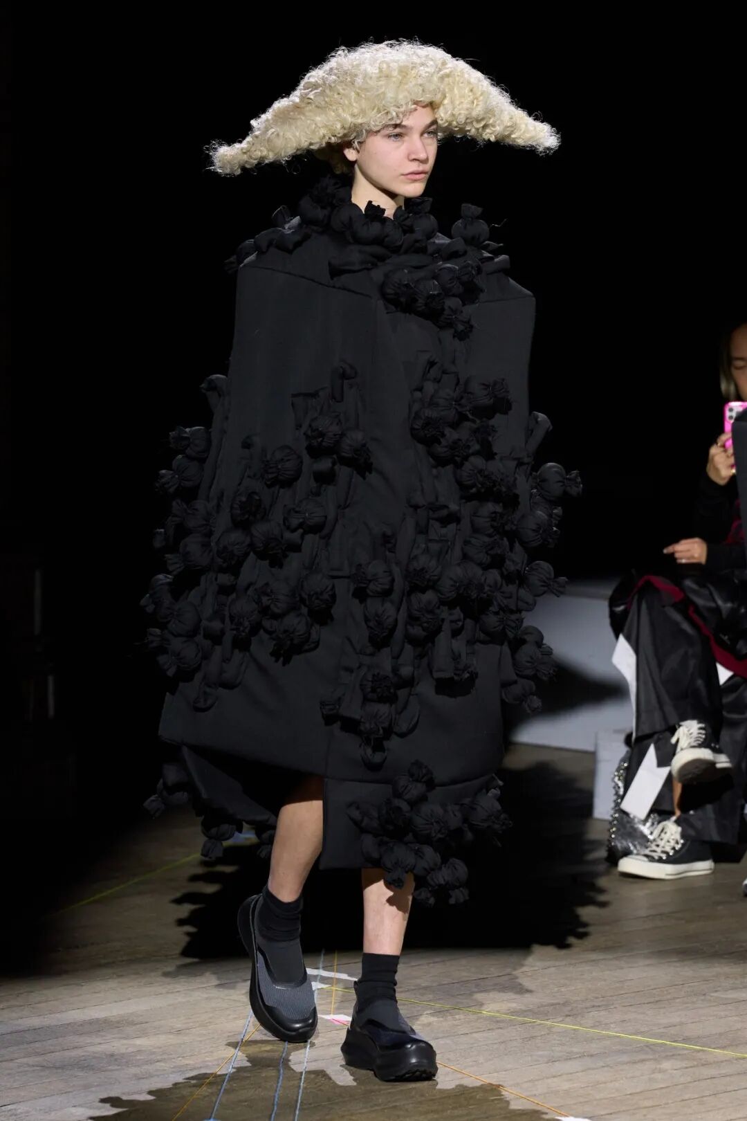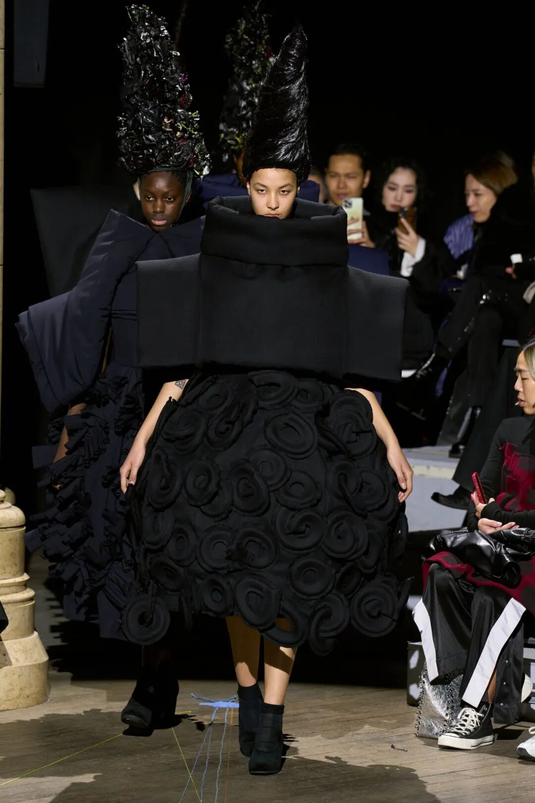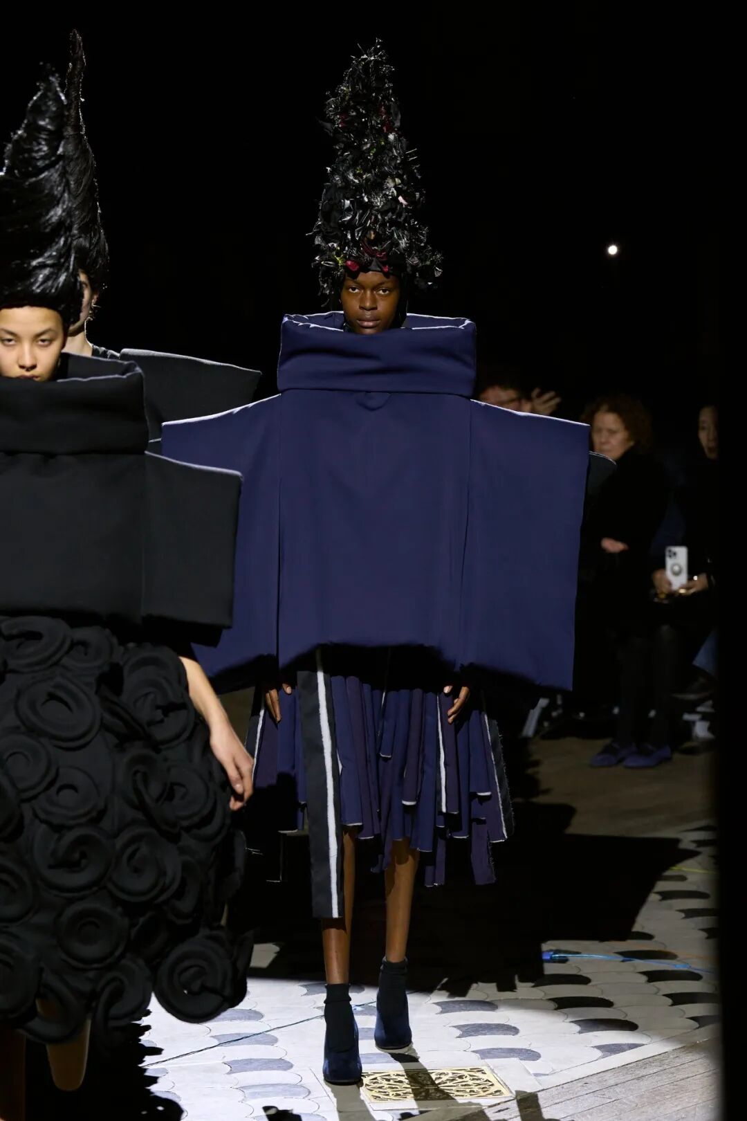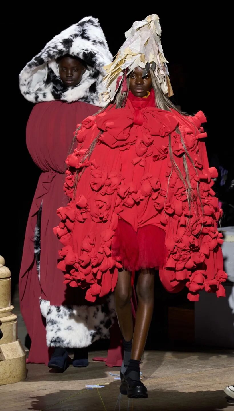 2023 秋冬系列大秀,承袭一贯的反叛时尚,80+川久保玲带来更加drama的戏剧张力和前卫时尚。扭曲的烟斗清洁帽、碎布条拼贴、立体装饰的黑色斗篷,如同宇宙大爆炸般集合服饰,模特们宛如行走的雕塑,23AW更drama。
