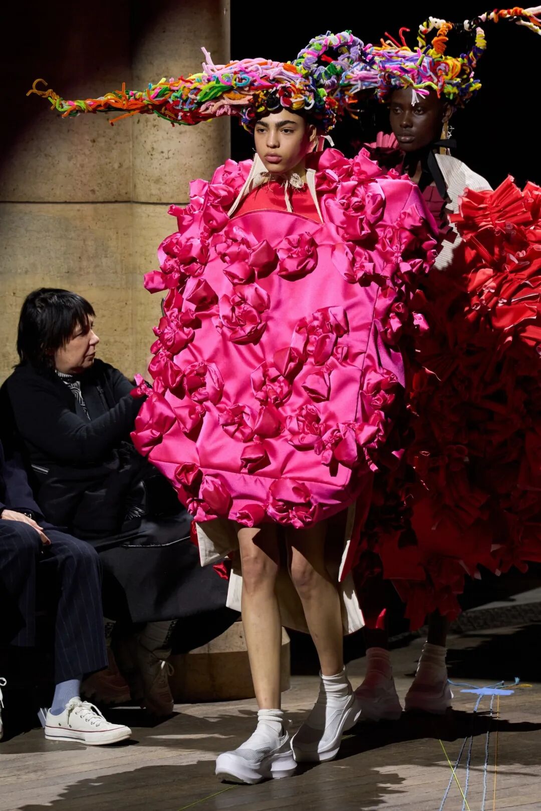 继2023 春夏经典黑白套装后,本季度选址于巴黎美国大教堂,伴随11个不同的音乐片段,不同颜色线的装点的地板,就像太阳系的轨道。模特们宛如行走的雕塑,再次展现了品牌反叛前卫时尚,果然有趣的灵魂万里挑一,而本季80+的Rei奶奶坦言要回归初心,重新出发。