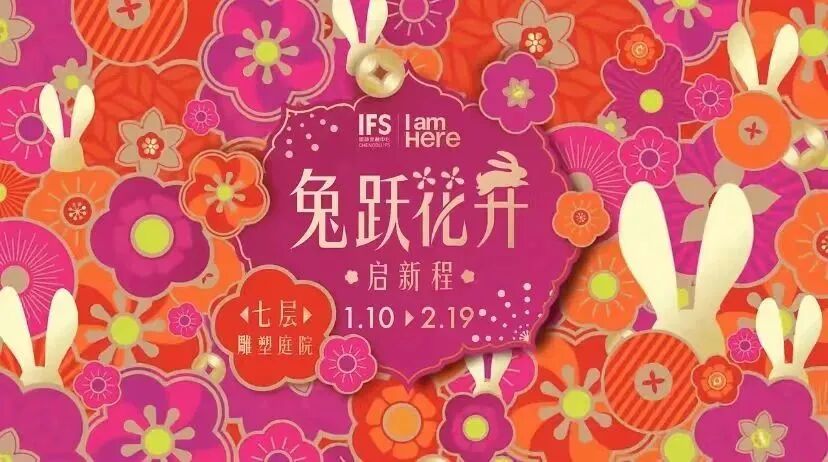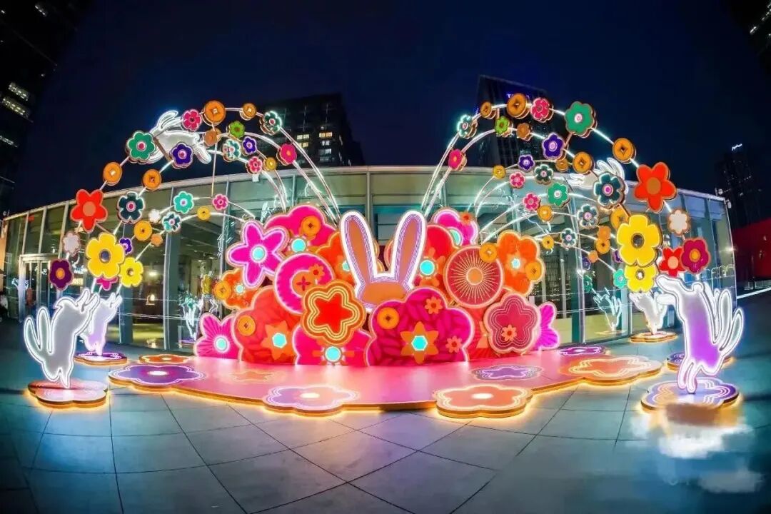 对方新年装置的主题:兔跳花卉