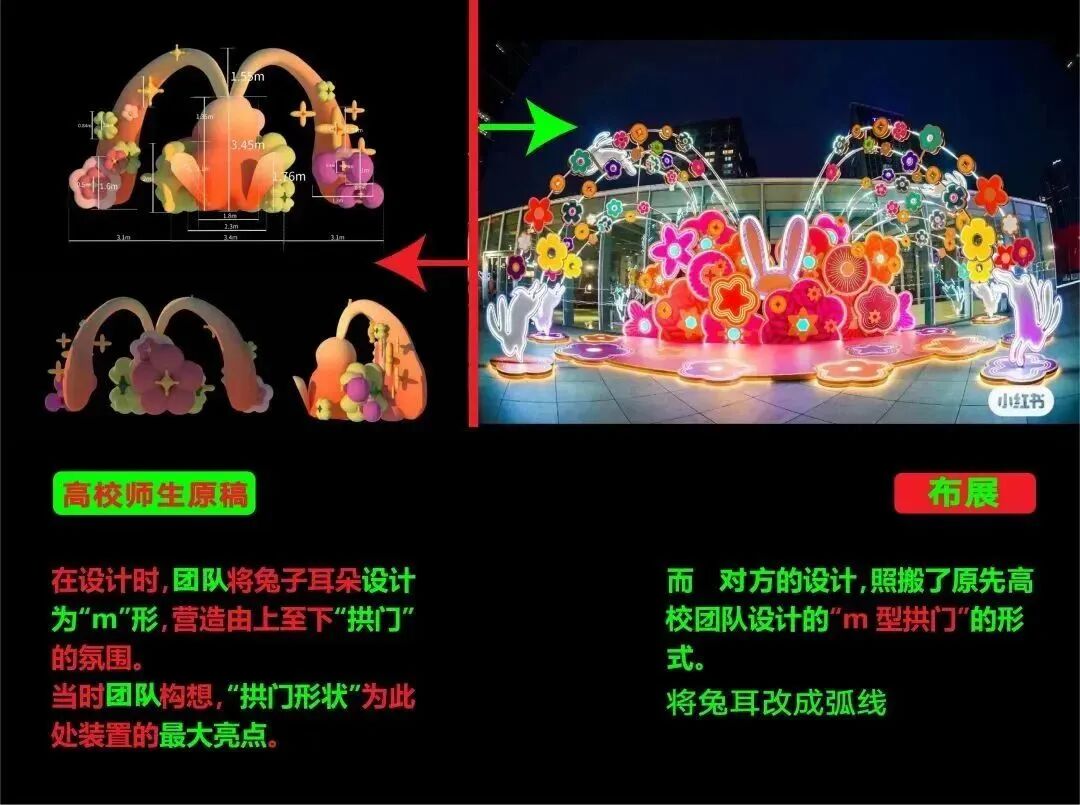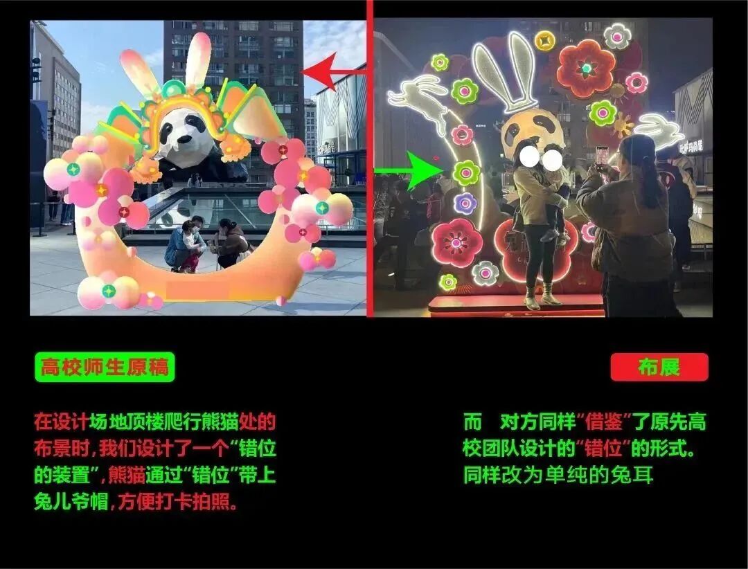 但前几天(2023春节期间),高校设计团队发现某熊猫今年落地的灯组从概念、点位、结构、造型和元素上,都和团队之前的设计方案高度相似,尝试沟通后无果。团队认为,对于这种无视在地文化,跳单不尊重知识产权的行为,应同时将其公之于众。