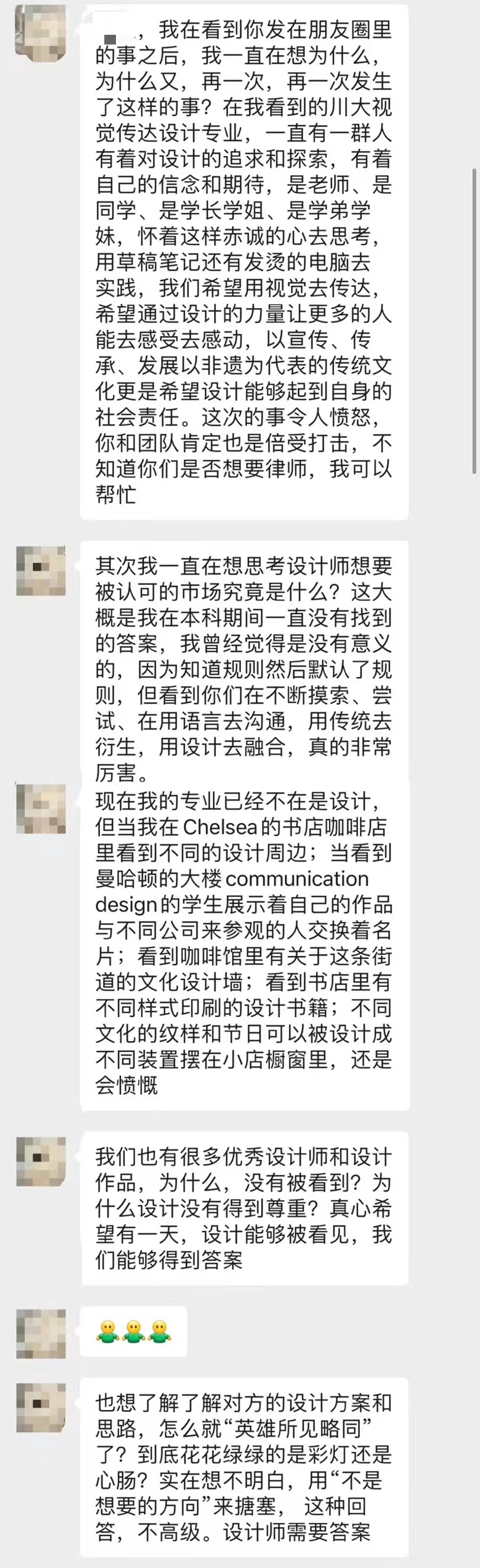 团队导师说,“你要说我不怕是假的,但我非常难过,因为同学们现在还没有毕业,还处在正在建立专业价值观的时候,然后遇上这样的事情非常愧疚,不知道这会不会对我们对这个专业、对设计专业的想法和感受产生变化,我非常歉疚”。