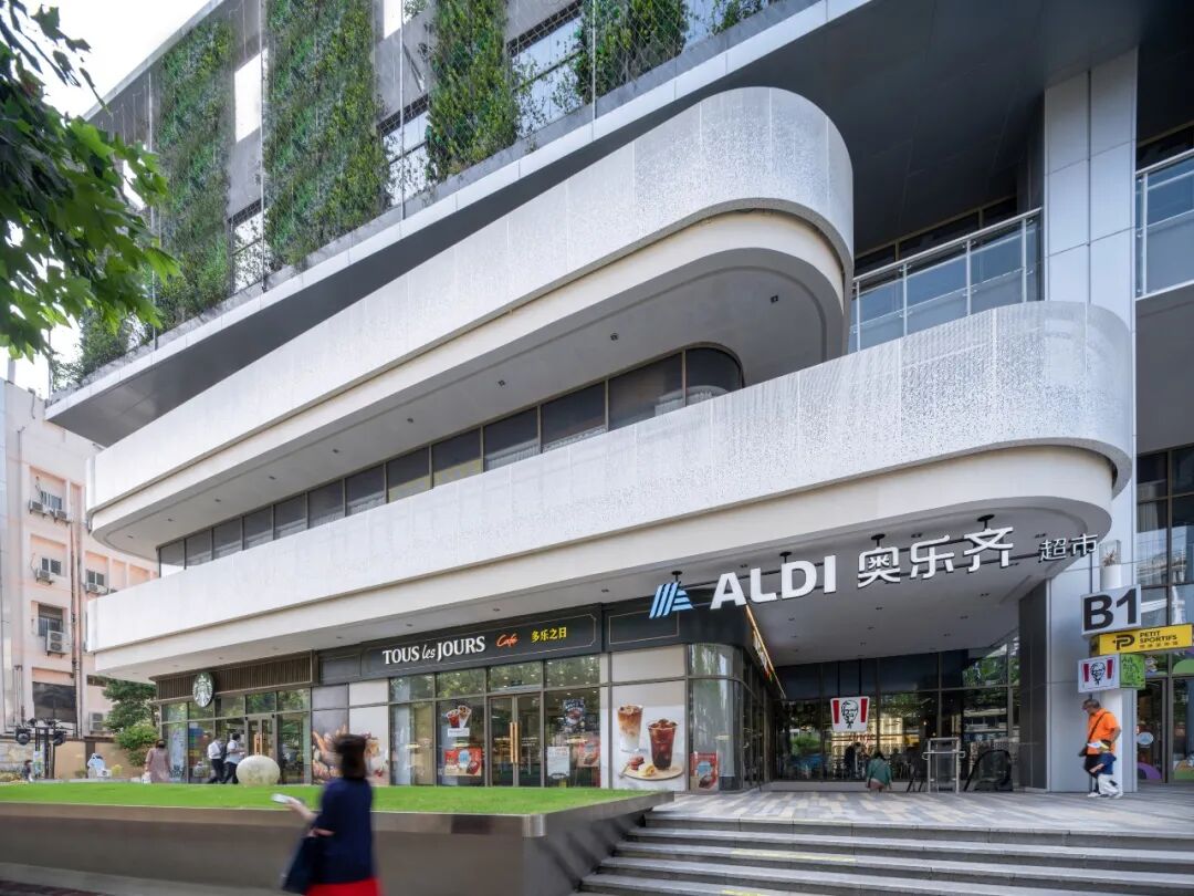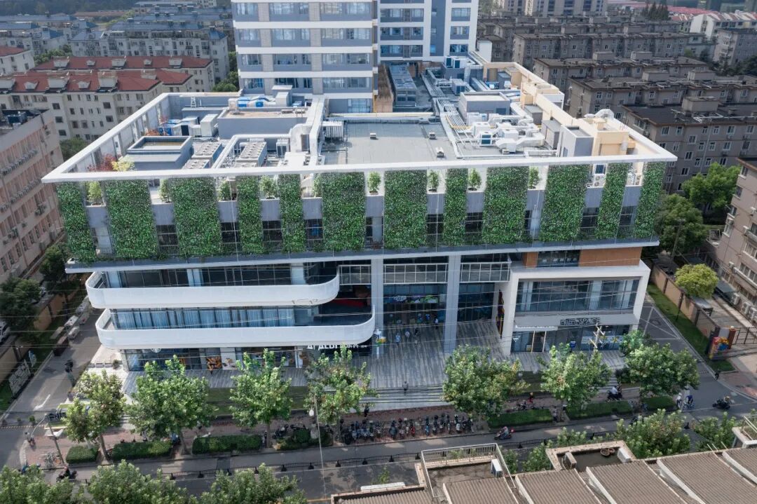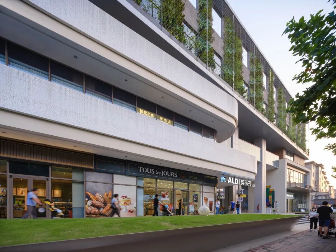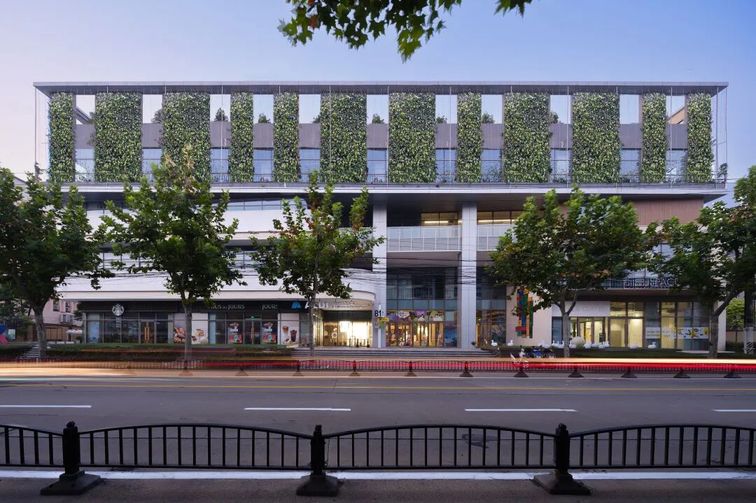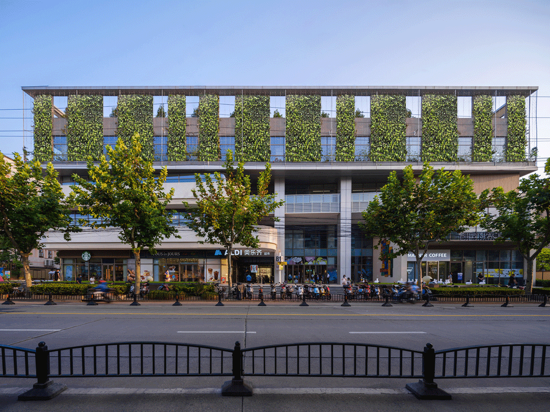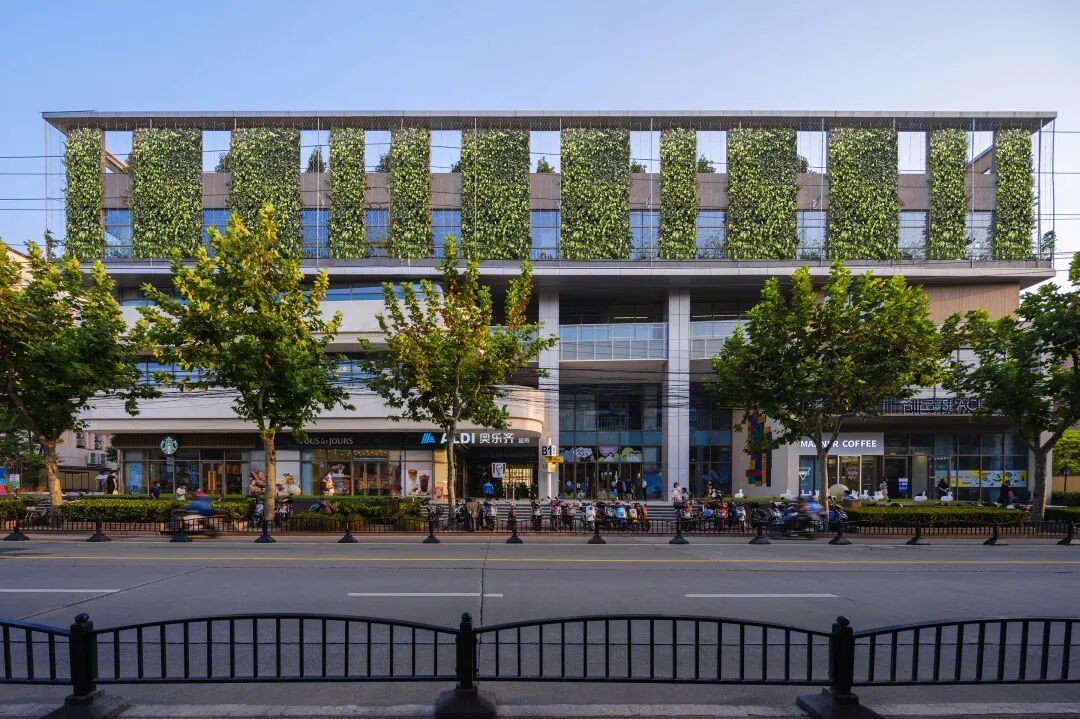 商业上部的办公空间,建筑师则在沿街部分设置了竖向垂直绿化,采用钢丝网+绿植的方式,呈现出轻盈的“绿盒子”效果,标志性的植生绿墙为城市带来新的面貌,也强化了城市界面完整性和标志性。