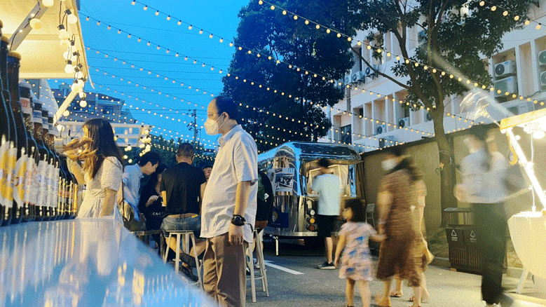 除了商业空间内的业态规划,创邑MIX·罗秀路还积极运用户外空间,以唤醒城市活力为期许,重塑周边街角,打造了“云下市集”,呼应“上海夜生活节”的主题活动,以霓虹灯点亮浪漫氛围,以吹糖人、冰淇淋、咖啡美酒、公益跳蚤市场连接人间烟火,为市民提供休闲娱乐的好去处。