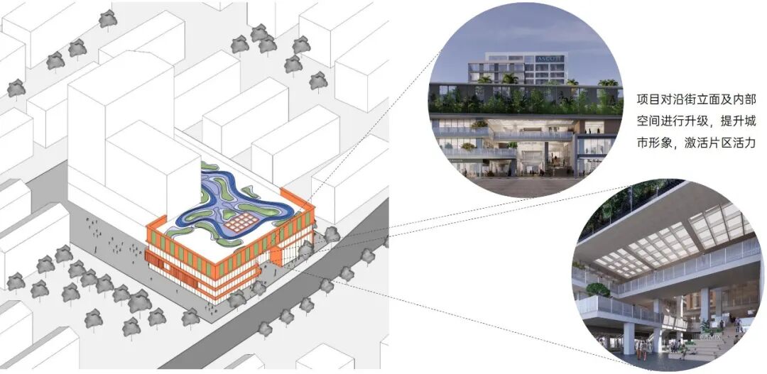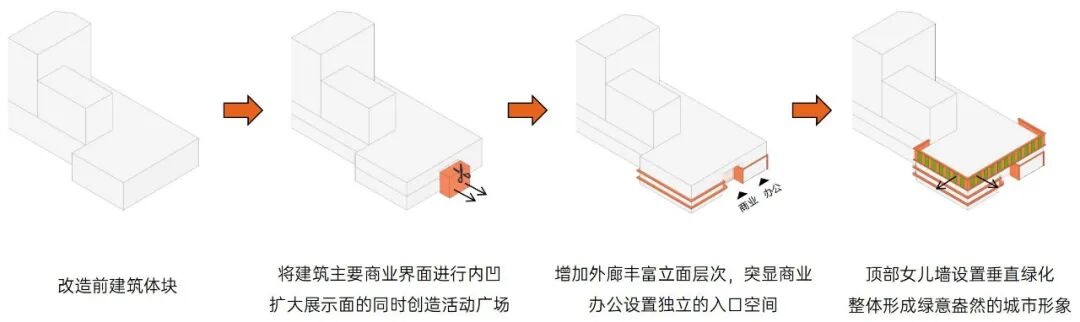 原建筑裙房体块相对封闭,且裙房各个体块以及塔楼的颜色、材质、风格各不相同,形成了相互割裂的视觉效果,显得十分死板,缺乏美感。本次改造建筑师首先将各个体块风格、颜色进行了统一,其次沿街立面结合不同功能,重新对建筑进行了比例和形式的分割,形成拥抱城市的商业形态、标志性的办公“绿盒子”以及简约现代的塔楼形象。
