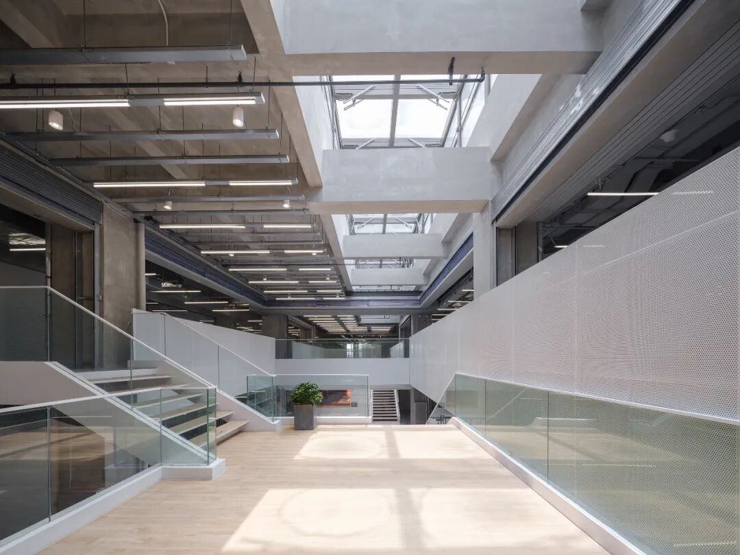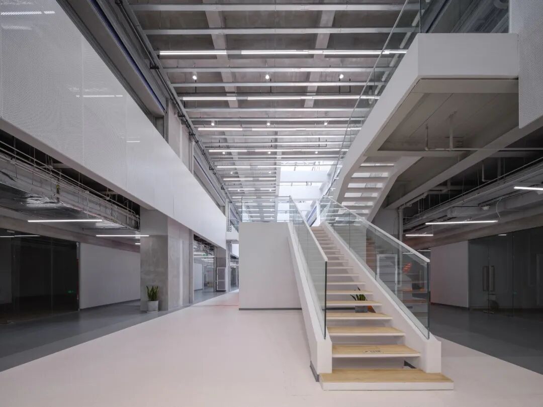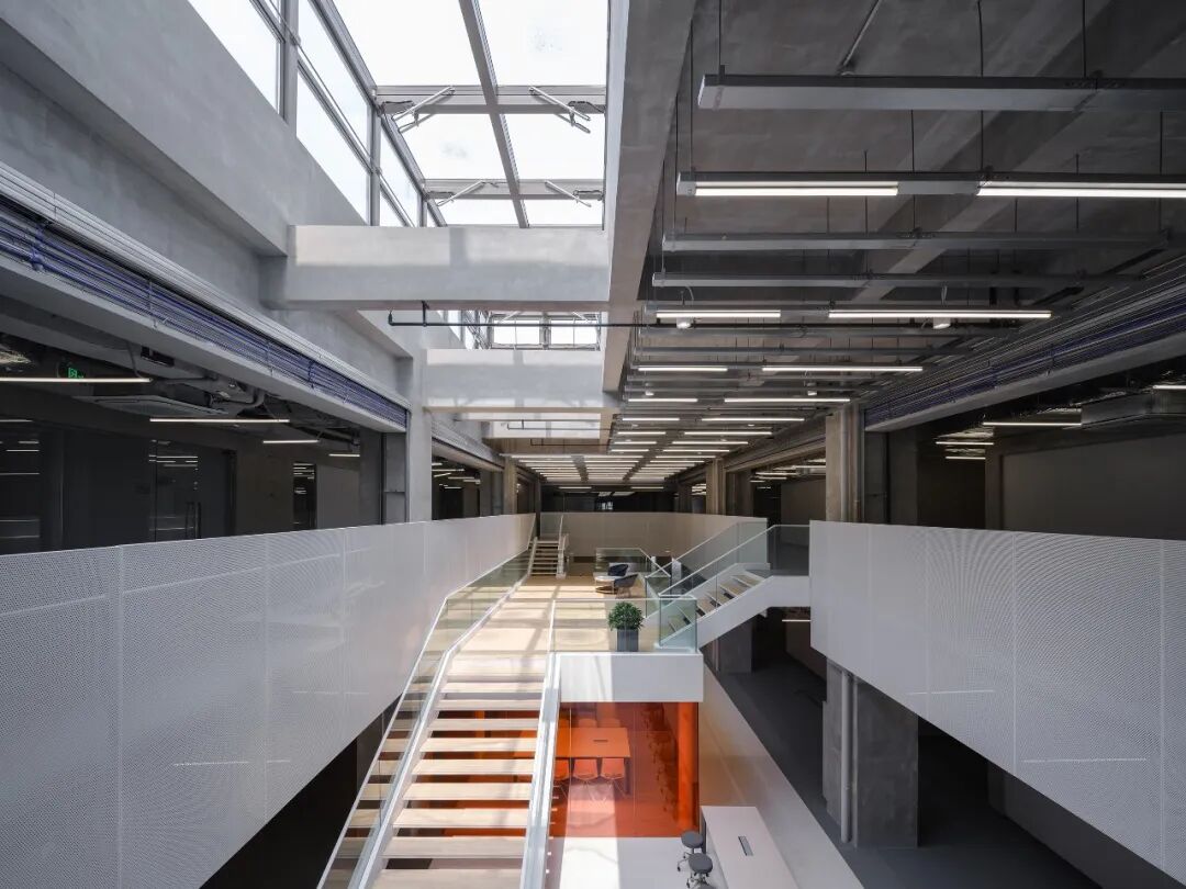 设计以“开放型复式办公空间”为概念,将夹层空间沿四周布置,围合成通高的室内中庭,作为主要的共享空间,四周则划分为相对独立的办公空间,同时面向中庭主要使用玻璃作为空间分隔,从而提高整体空间的通透性、开阔感。