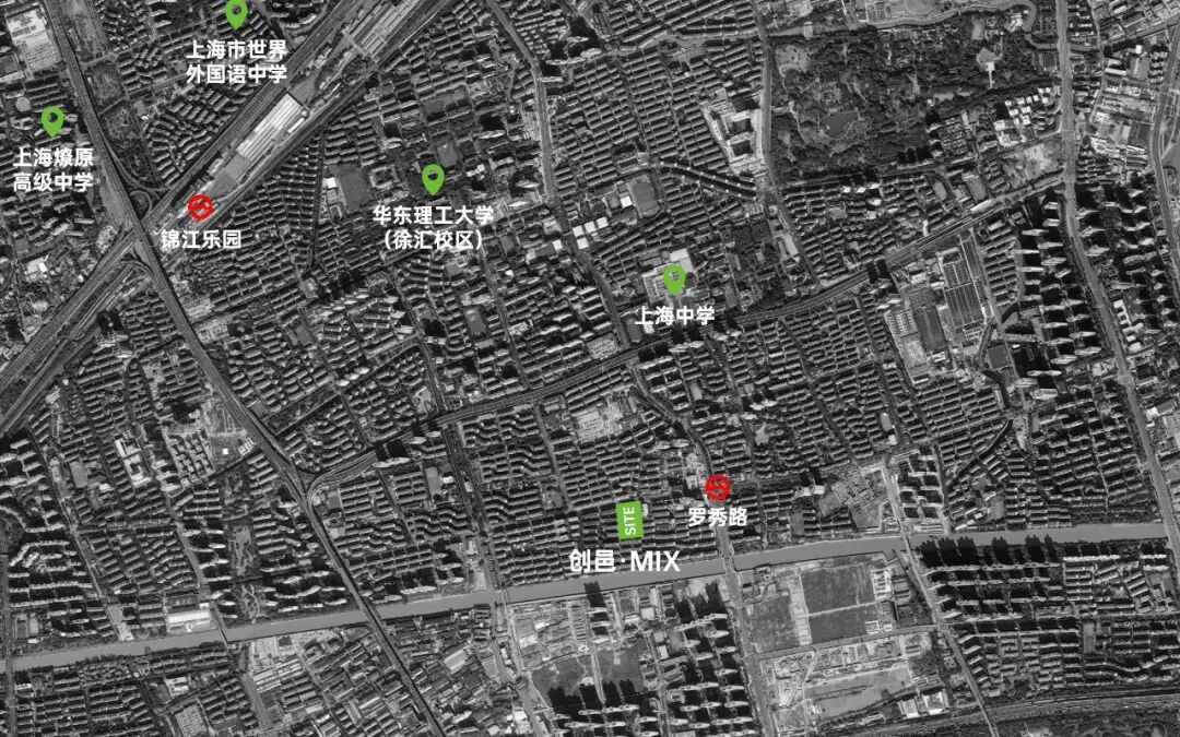 项目距地铁15号线罗秀路站仅300m,周边有众多生活住宅,除当地原住民外,还有众多拆迁户、外来务工者生活在这里,沿街店铺老旧,缺乏高品质、成规模的商业配套和多元的交往空间。由于地处徐汇区凌云板块,伫立国家级科技创新产业带,项目周边华东理工大学、上海中学等名校环伺,高等教育资源丰富。