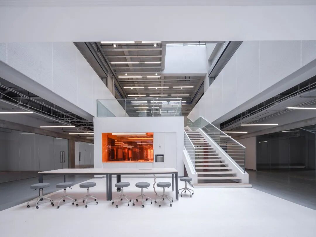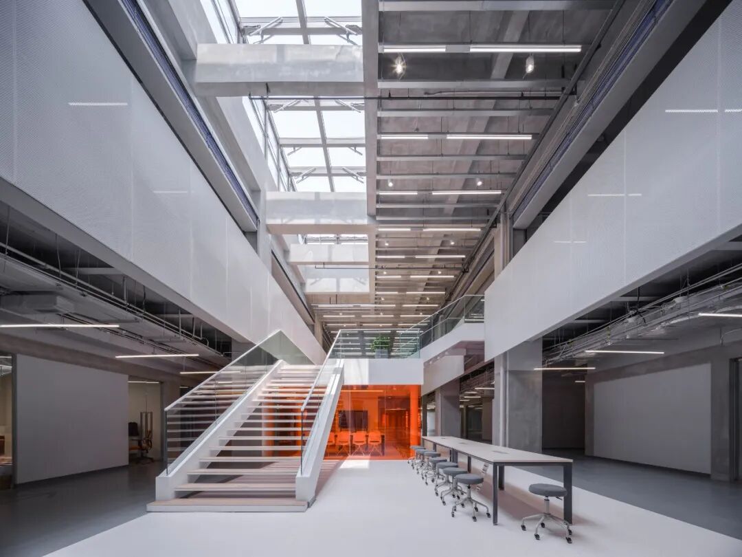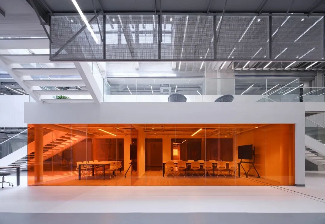 同时在中庭置入让人眼前一亮的橙色玻璃盒子,巧妙的色彩碰撞呈现出充满戏剧性的空间张力,激发创意的氛围。在木面、钢材、大理石、玻璃等搭配温润的材质与色彩的点缀下,使整体空间融合在一起,区域与机能互动被流畅地围塑出来。