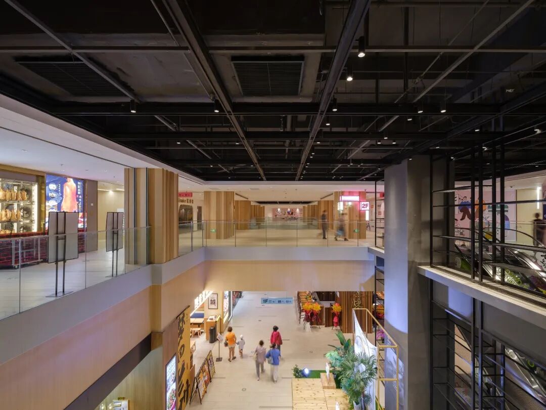 项目在保留罗秀路街区烟火气的同时,打造一系列贴合当地的商业场景。商场一楼的大部分商户都为夜宵商户,因此商场延长营业时间至凌晨2:00,并在晚上9:30以后,将氛围灯光调成暖色,播放年轻人喜爱的音乐,以小酒馆氛围为亮点,营造微醺质感的中庭,回归夜市生活商业形态,打造独一份“罗秀路的夜”。