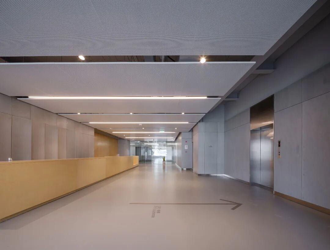 同时立面主要采用窗墙体系,局部入口幕墙,平衡造价与立面效果。办公空间部分,在裙房三层及女儿墙采用钢丝网+绿植的方式,不仅绿色环保,还节约了成本。室内则采用高技派的风格,部分顶棚管线裸露,减少吊顶,形成简约的工业风格。