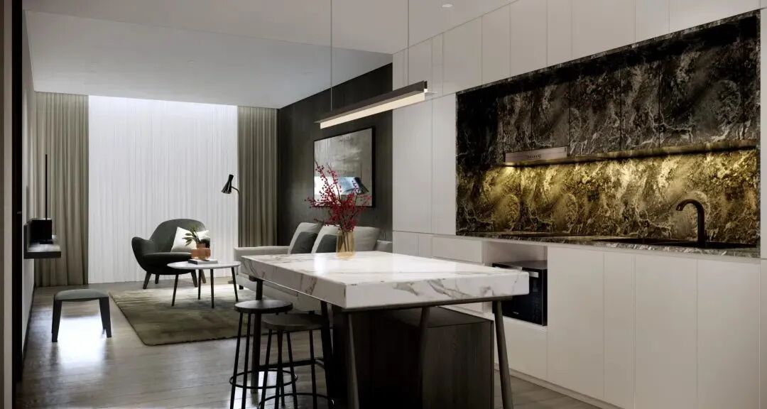 公寓位于建筑塔楼部分,拥有223套精致客房。室内空间设计以木纹与暖灰色调为主调,巧妙运用干净的线条与材质相搭配,风格简约而典雅。每间公寓均设置宽敞的起居空间及用餐区,备有设施齐全的厨房及高品质的家居用品。