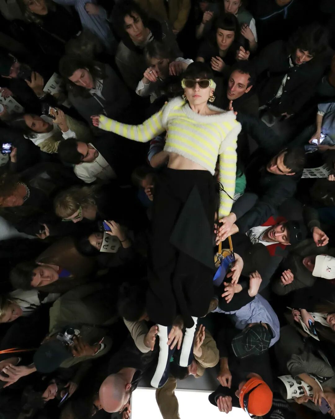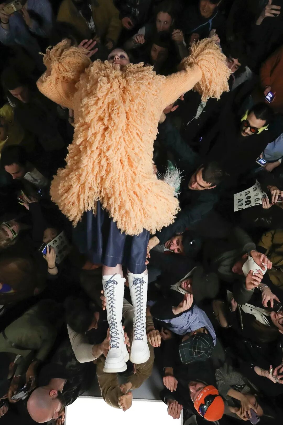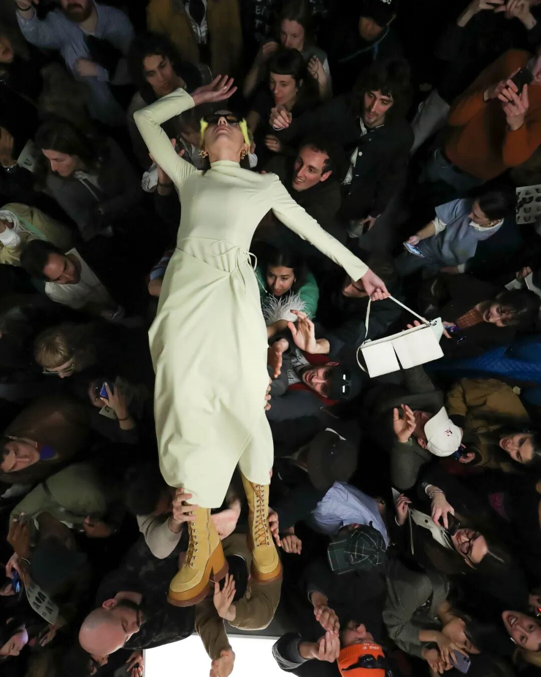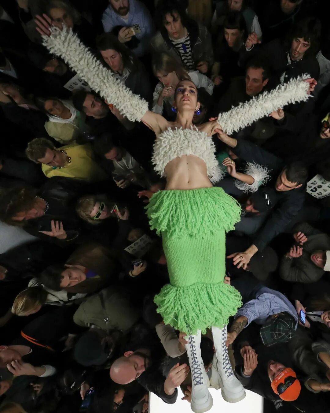 SUNNEI 2023秋冬系列|在Sunnei米兰总部纯白的陈列室里,上演了一场宛如live演出一样的“跳水”秀。观众如沙丁鱼一样挤在高高的T台周围,整个团队变身模特穿着秋季系列服装登场,跃入观众席。Simone Rizzo说:“这是Sunnei主义最伟大的表达,关于自由、信任、信心、冒险,互动、参与。”