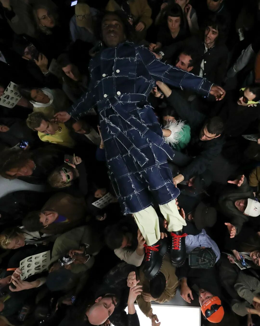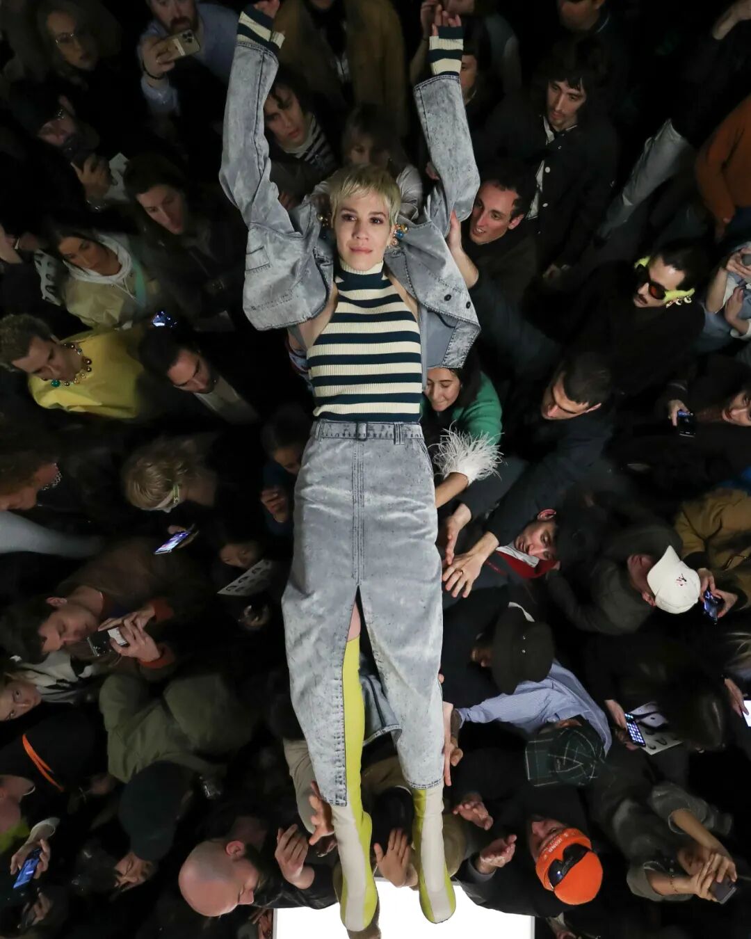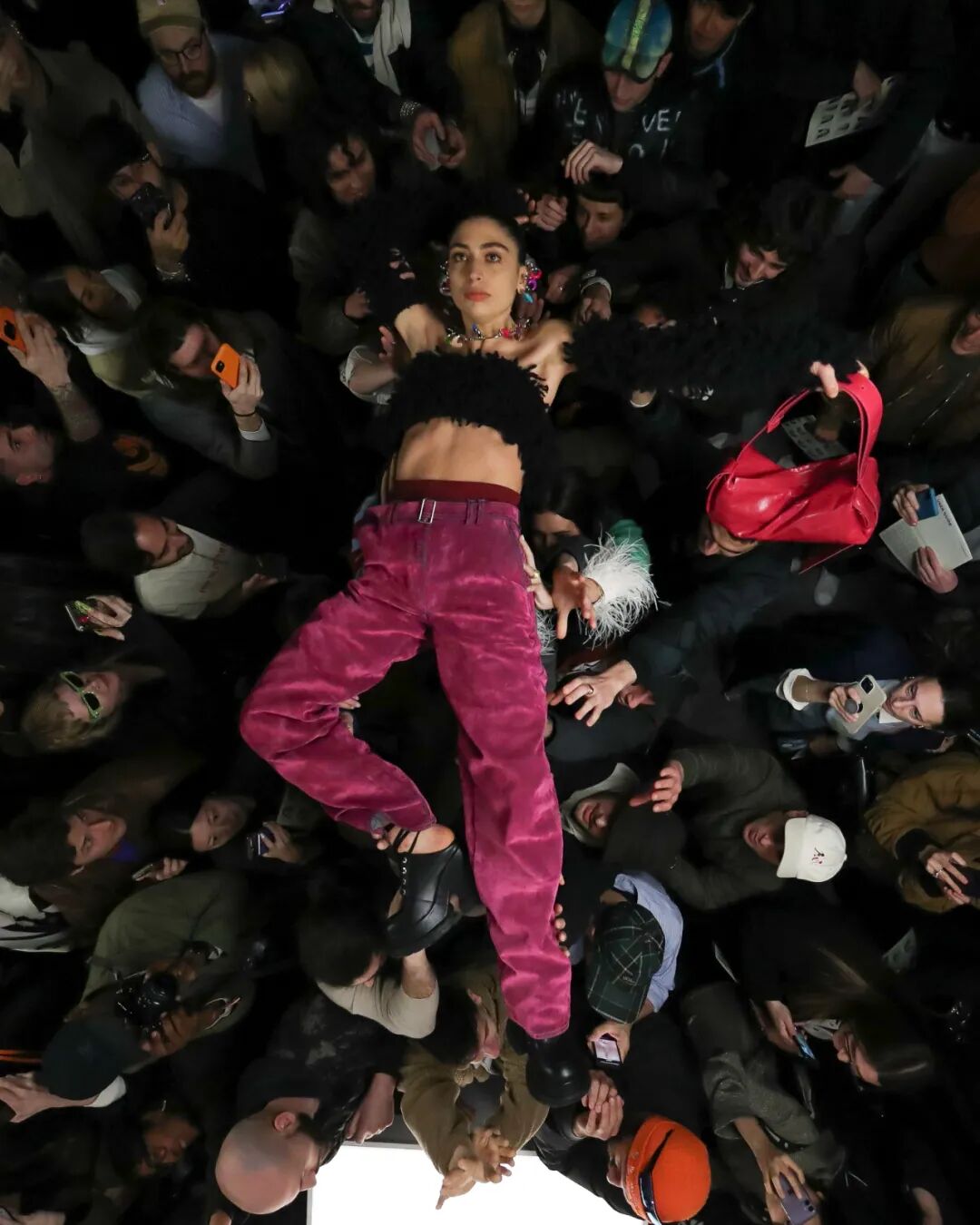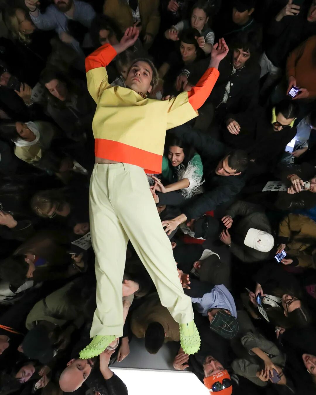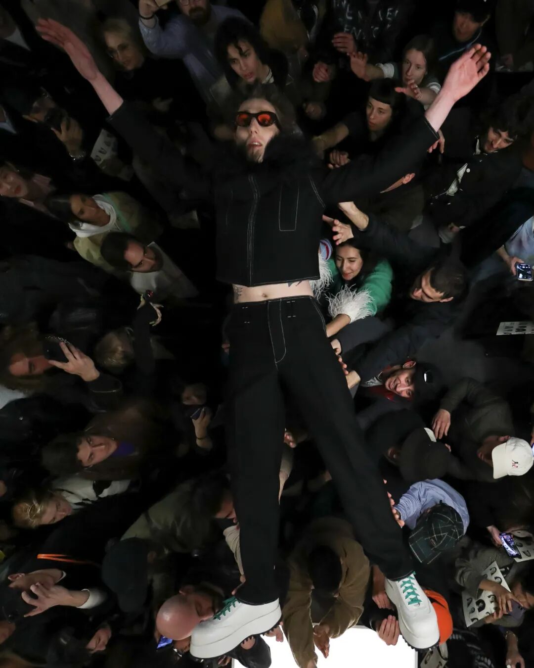 SUNNEI 2023秋冬系列|在Sunnei米兰总部纯白的陈列室里,上演了一场宛如live演出一样的“跳水”秀。观众如沙丁鱼一样挤在高高的T台周围,整个团队变身模特穿着秋季系列服装登场,跃入观众席。Simone Rizzo说:“这是Sunnei主义最伟大的表达,关于自由、信任、信心、冒险,互动、参与。”