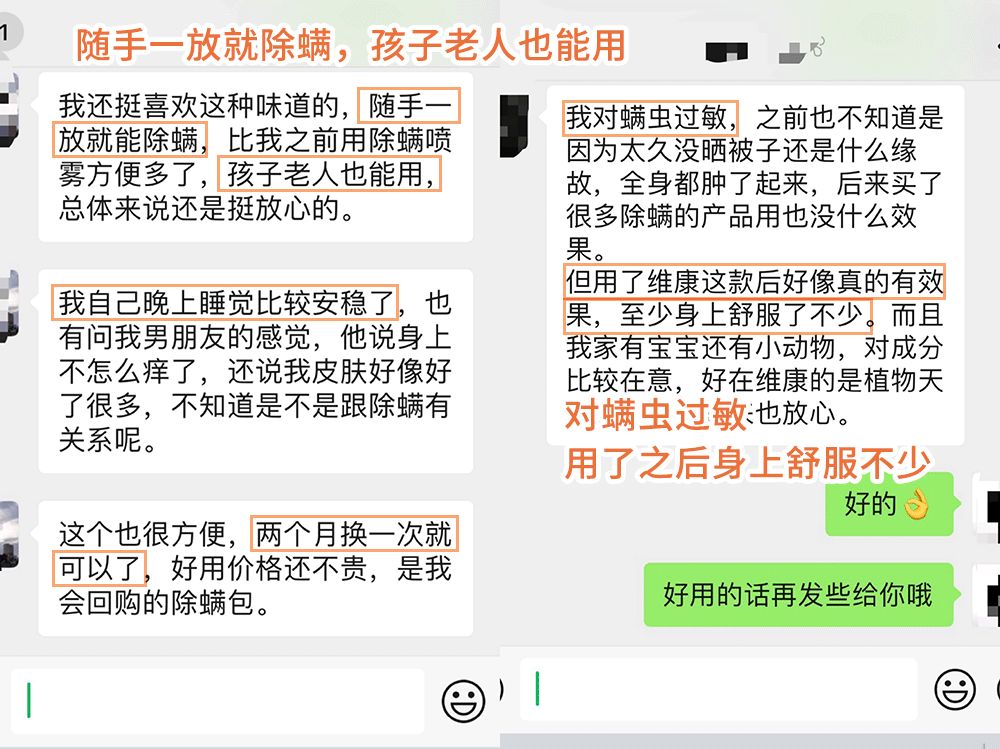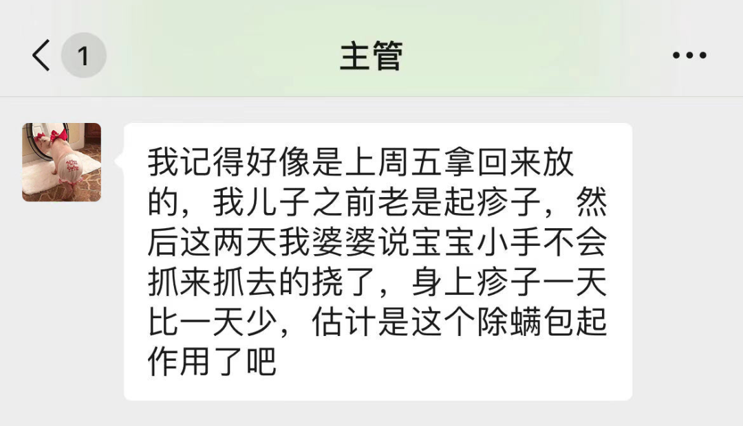 看到这样的效果,主管也拿了几包回家,说宝宝身上起疹子了可能有螨虫。