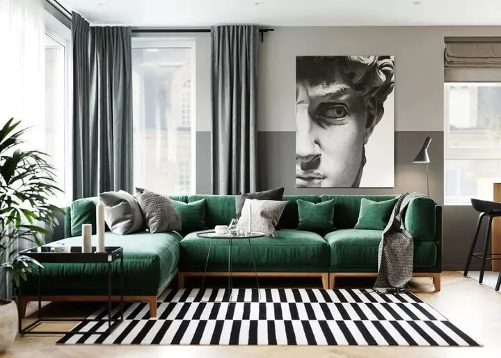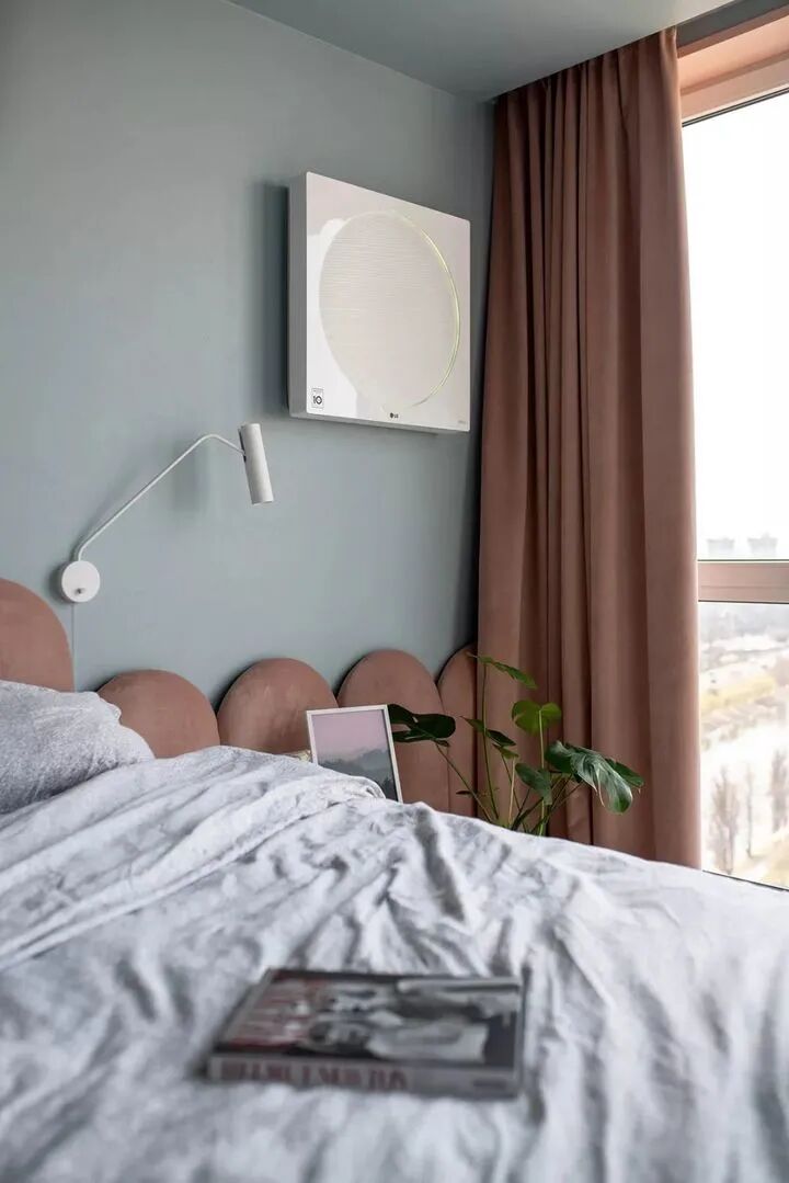 a、墙面+地面=白色,不选择白色窗帘,选择灰色窗帘更美观,搭配带灰度的莫兰迪色系更高级;