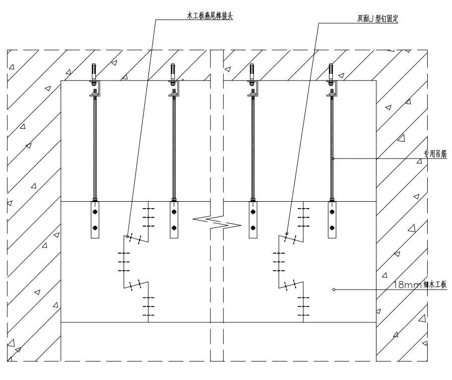 c、按照尺寸切割细木工板基层(细木工板需刷3层防火涂料),与吸顶吊件采用自攻螺丝固定,如果长度超过一张细木工板的长度,应开燕尾榫槽进行拼接处理,以增加窗帘箱的抗拉力。
