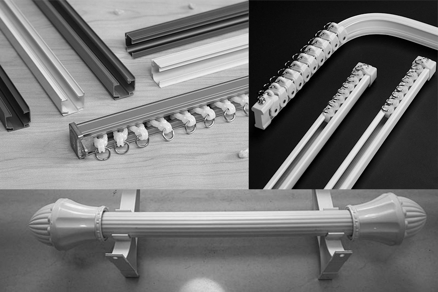 根据安装窗帘的3种形式:直轨、弯轨和罗马杆(明轨),辅料主要有罗马杆、轨道、钩子、布带等。