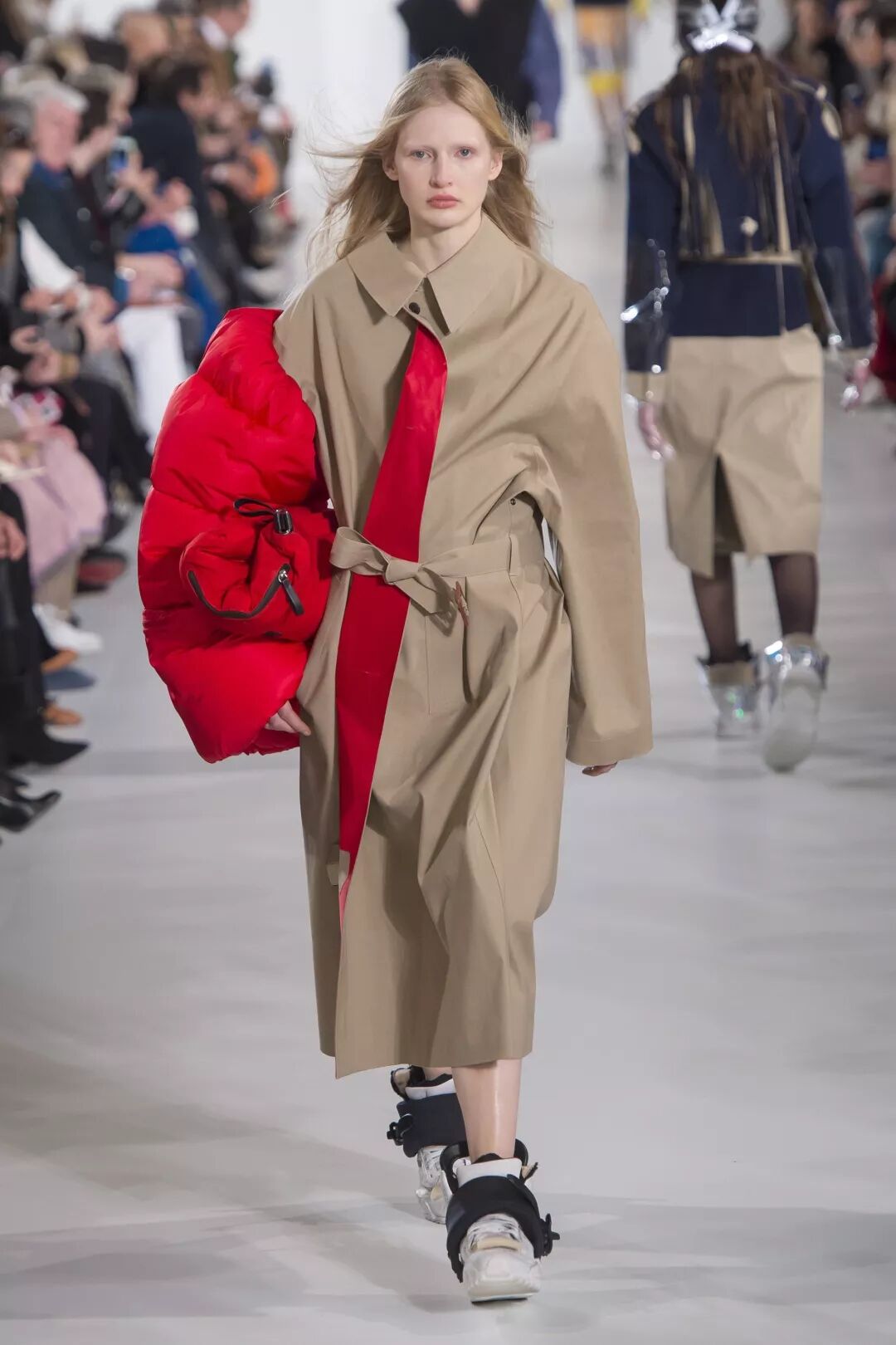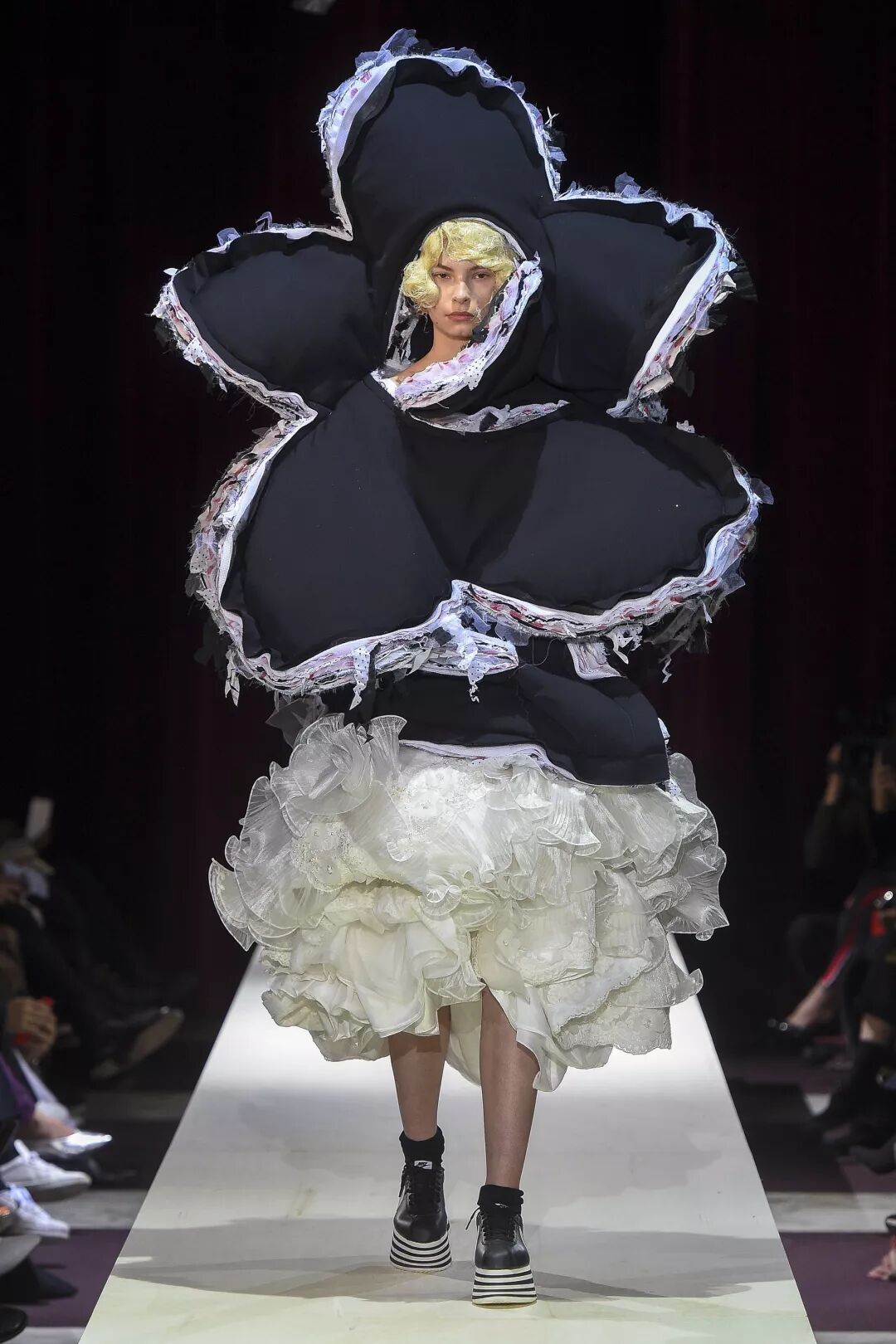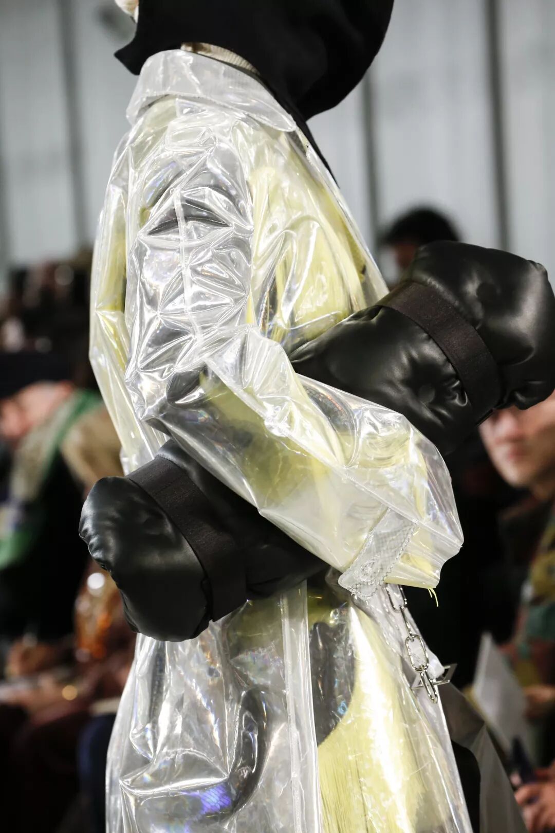 当然这种千奇百怪的设计,肯定是少不了川久保玲的,Comme des Garcons Fall 2018中,也出现了全封闭与半封闭模式混合的供“起床困难户们”随时补觉的装备