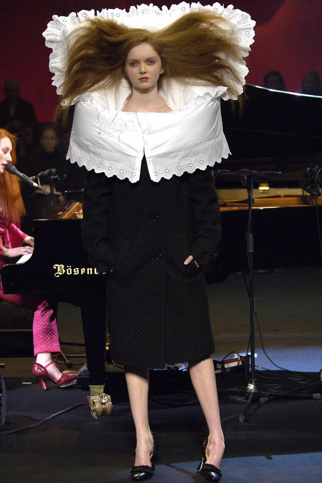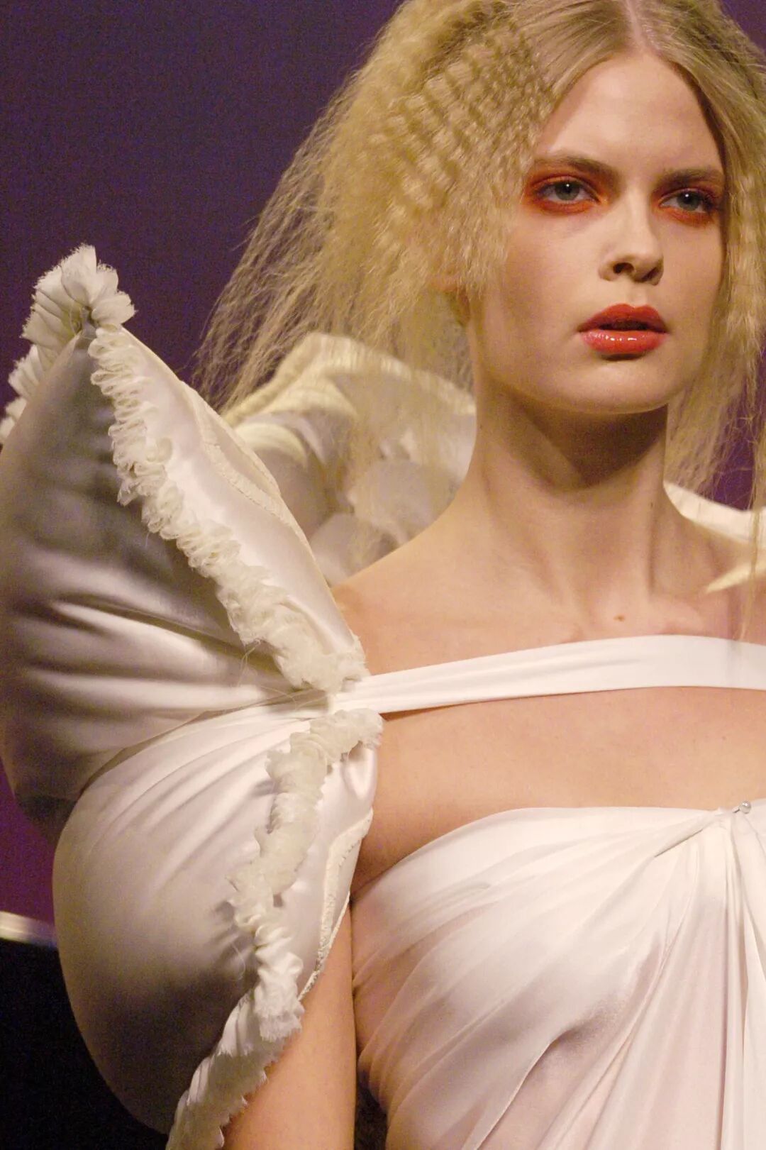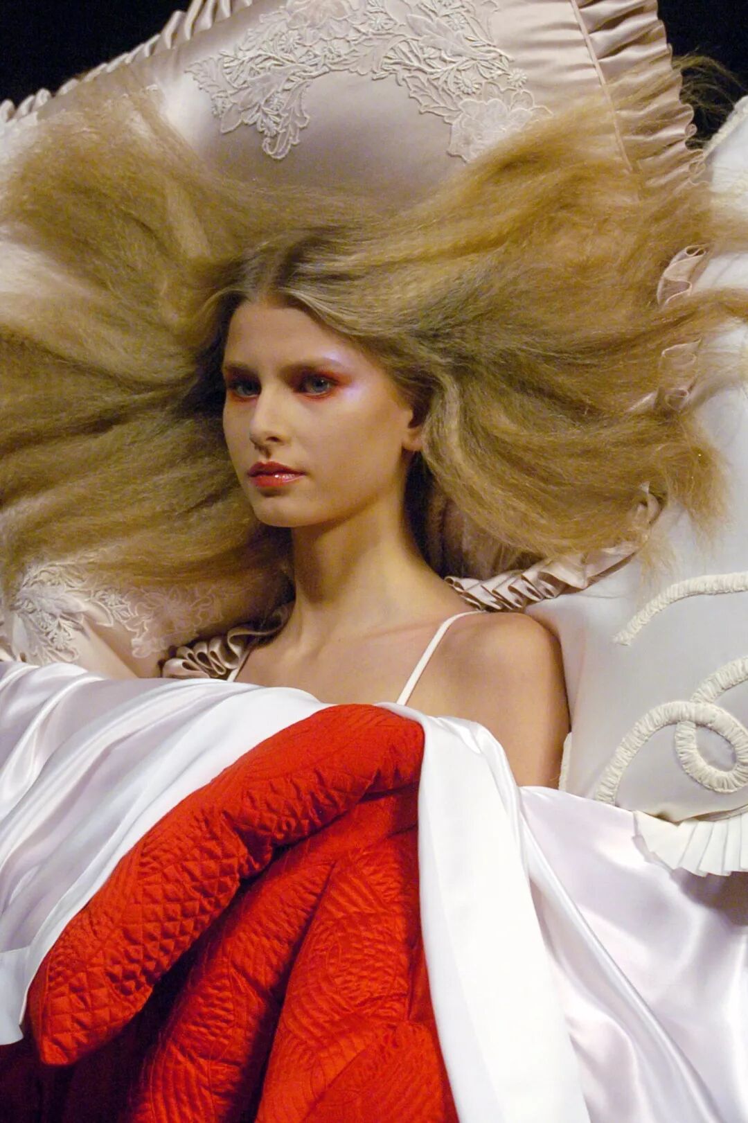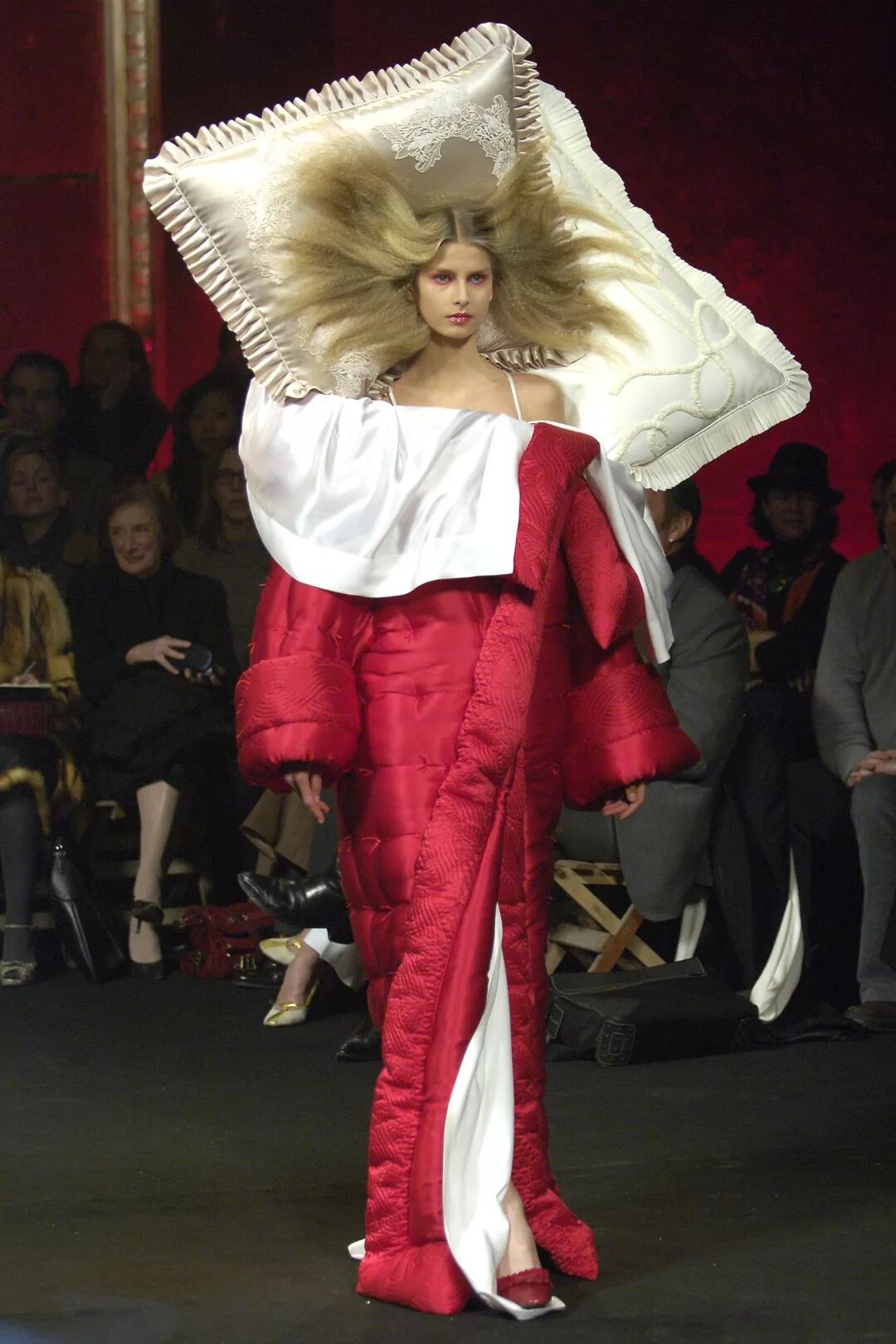 其实,这是Viktor Horsting和Rolf Snoeren为了大众出现“时尚疲劳”而设计的系列。当疲劳出现在时尚中时,他们作出了假设:为什么不躺在床上工作呢?因此蕾丝边的棉质枕头,与叠整齐的床上用品,出现在了一群同样睡眠不足的麻豆的身上。