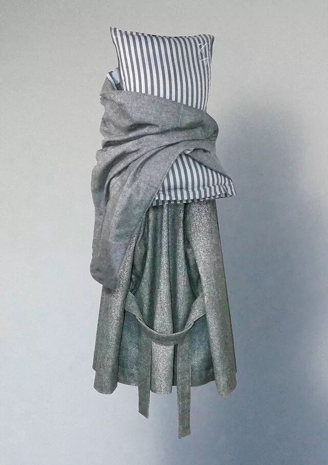 Cunnington&Sanderson设计师将羊毛毯子、枕头和床上的亚麻布被套在一起,作为日常衣物携带和穿着,厚重的衣服会变形,而且会显得错乱、混乱和空洞