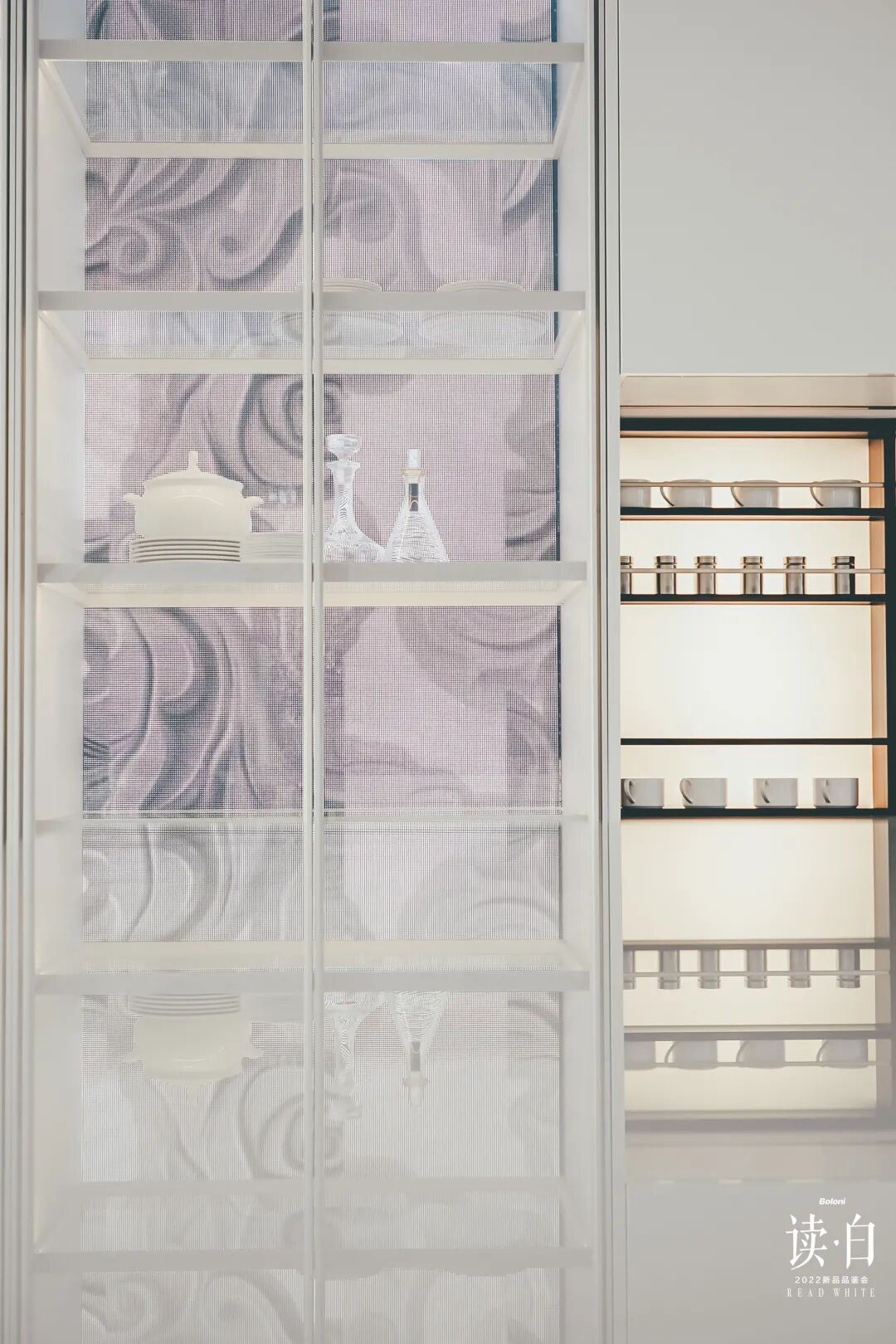 新伯尔尼亚雾化玻璃筒柜结合印花背板,为空间语言注入更多前沿而不失经典的美学意趣。