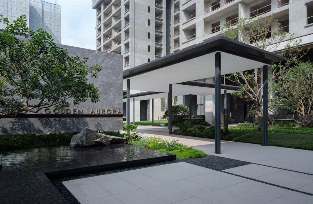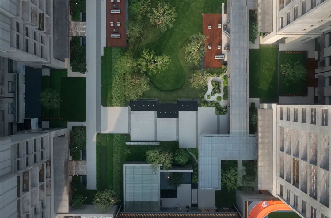 万科 · 金域曦府位于小街区、密路网的规划环境中。为了提高居住舒适度,减少高楼带来的压抑感,采用半围合式布局,将建筑围合成三个串联的庭院,让每一户都能拥有丰富的景观资源。为了给业主提供更多休闲活动空间,每栋建筑首层挑高约9米做到双层架空层,并将裙楼屋面作为屋顶花园使用,与夹层架空层相连通,整个架空层面积达到约10000㎡左右。