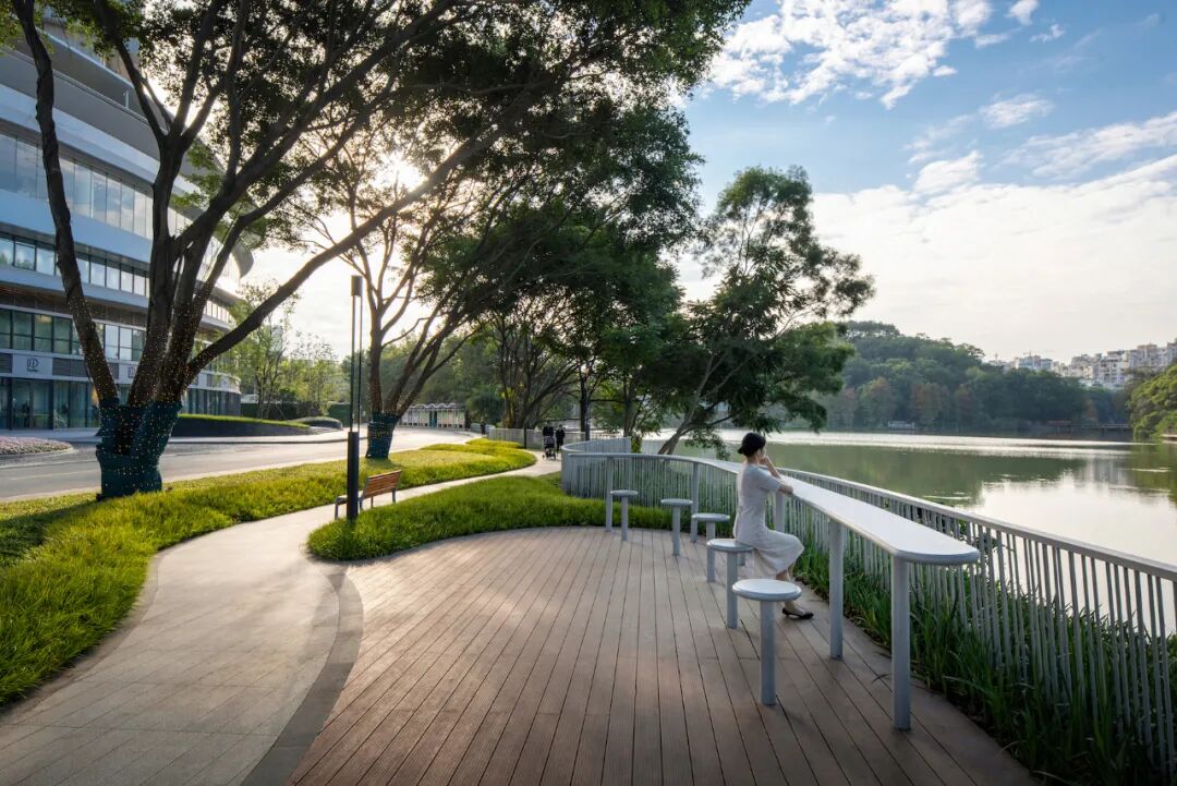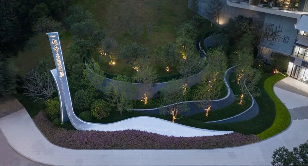 整个设计是以未来为出发点,通过有秩序的几何图形,交错的光影,以极简风格,结合特质材料语言所打造。以此为原点,引领新的灯湖中轴生活方式,讲述新的城市故事。项目最大亮点为采用170万块不同大小尺寸、14种颜色深浅不一的陶砖对建筑、景观、室内进行一体化打造。