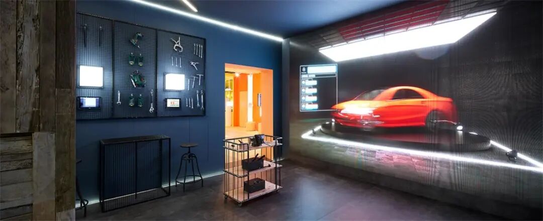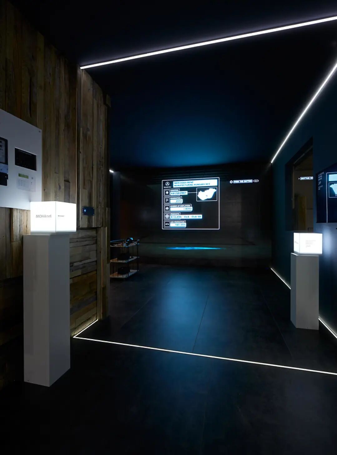 我们在模仿车库的LED墙上,展示了在匈牙利组装的梅赛德斯CLA车型。参观者可以通过按下按钮启动3D动画,查看、旋转在汽车周围的信息图形,从而更深入地了解匈牙利汽车工业的经济数据。