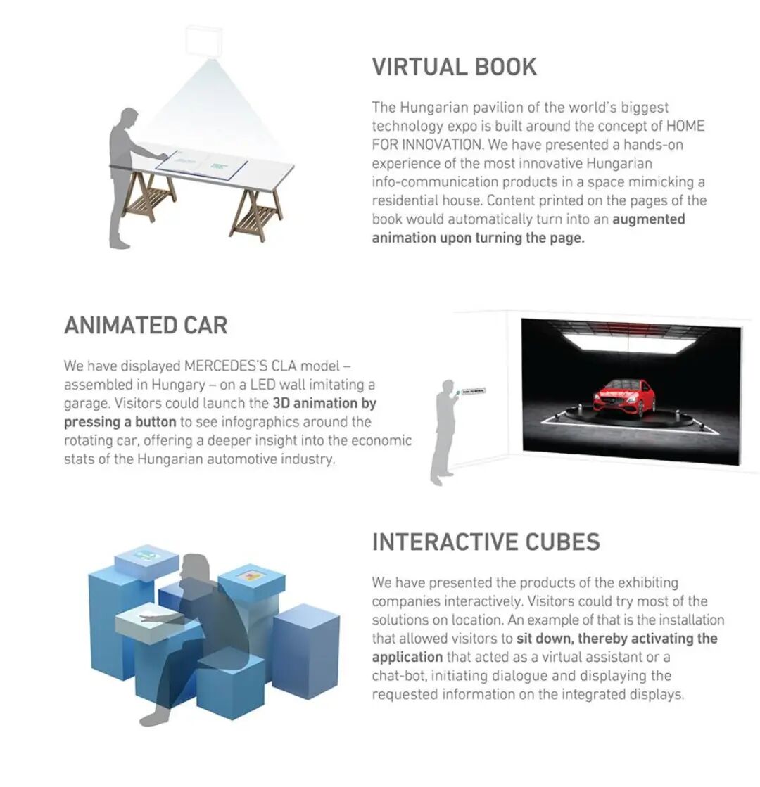 世界上最大的科技博览会匈牙利馆是围绕着创新之家(HOME FOR INNOVATION)的概念建造的。我们在一个模仿住宅的空间里为匈牙利最创新的信息通信产品提供了亲身的体验。打印在书页上的内容会在翻页时自动变成增强动画。