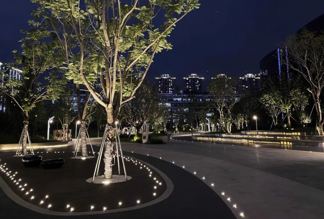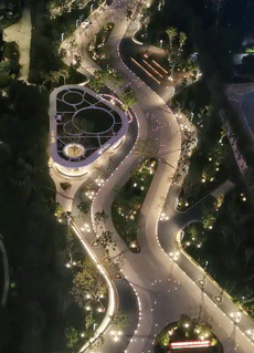 公园内将传感系统技术,信息收集系统,数据管理及分析的智能化板块与景观设施相结合,通过智能化系统来控制夜景灯光,雾森系统以及公园及相应服务建筑的安防监控系统。同时设计了智慧单车和地面的星座灯等景观互动装置,地面的十二星座灯光互动装置可以通过智慧平台联动手机APP,显示某个特定的星座,让人们能够真正地与公园进行互动。