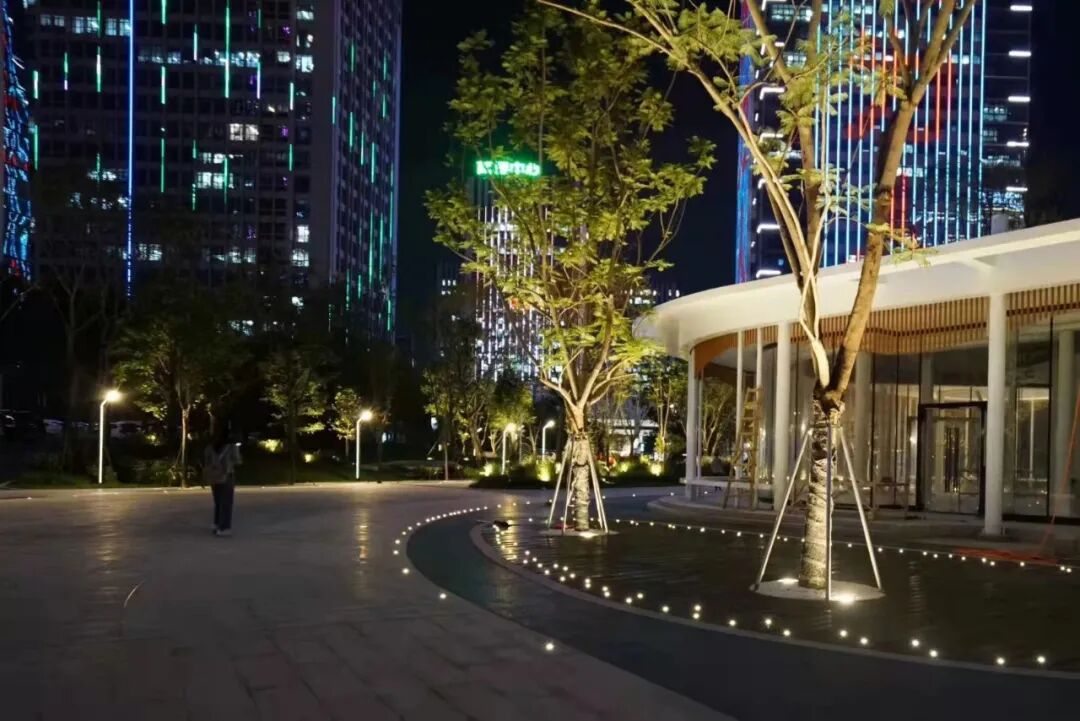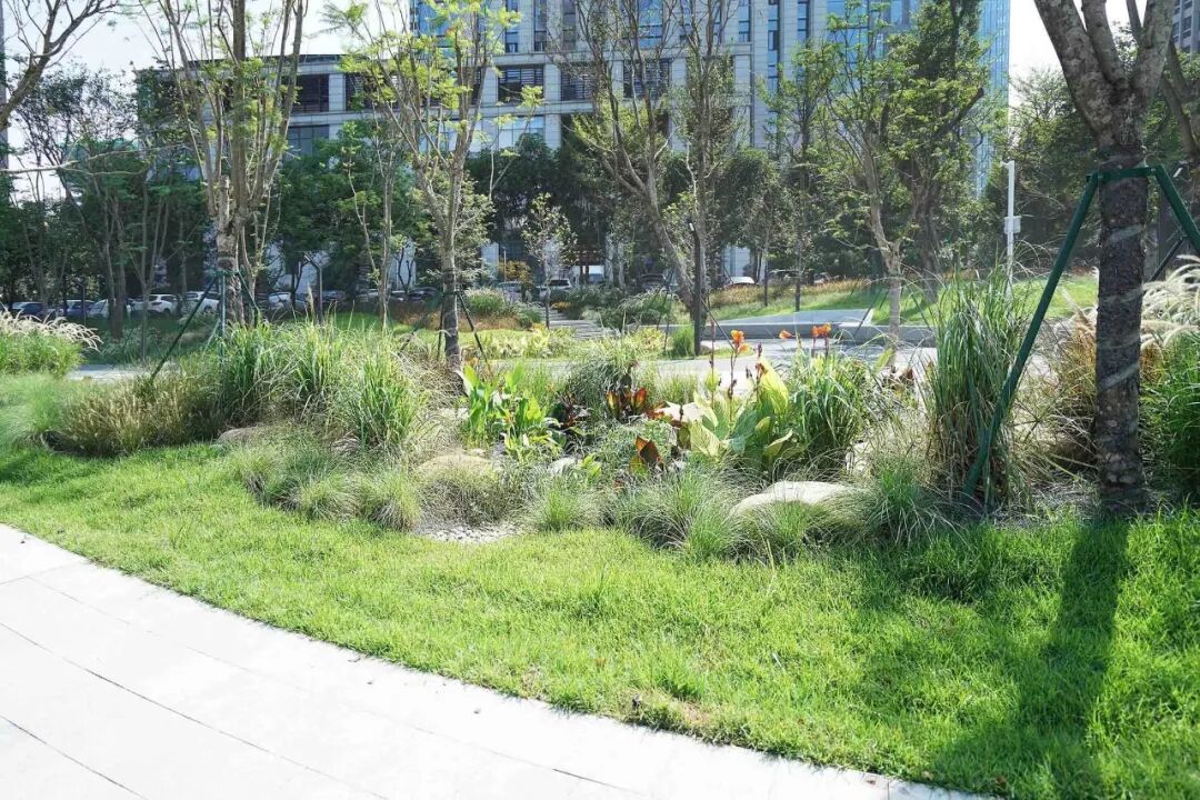 而下沉的广场空间又带来了新的问题,也是近几年讨论最多的问题,城市雨洪管理,如何让下沉广场在承接周围硬质地面大量的雨水?我们在设计中增加了大量绿化中岛,这些中岛就像海绵一样,形成一个个雨水花园,消化了周围不透水界面在雨季的排水需求。