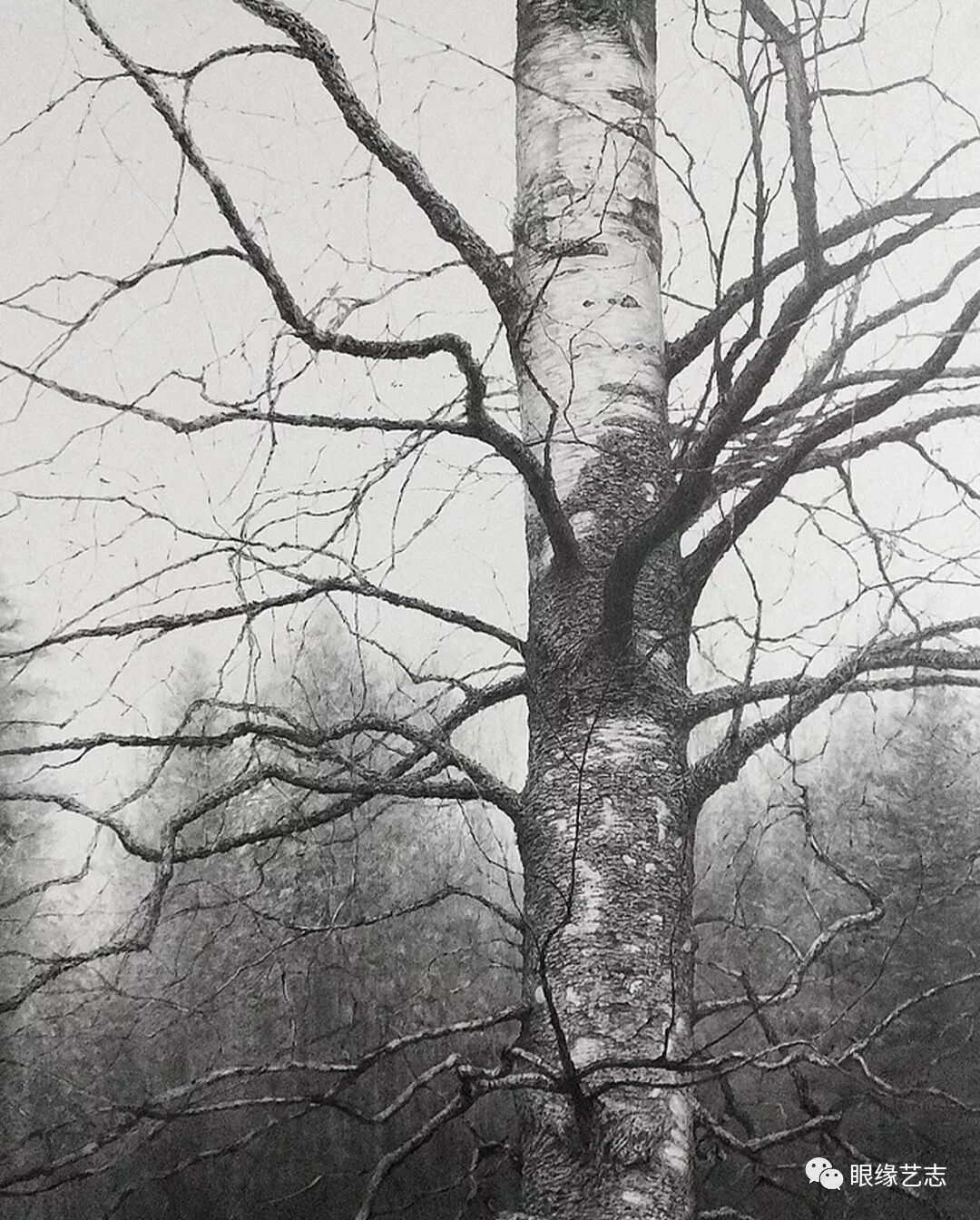 以白桦树干以及共生的苔藓、蕨类植物为中心,以石墨和自动铅笔绘制黑白,以矿物颜料和日本油墨表达明暗、干湿。四季更迭,画树之人也跟随季节轮转的步伐感受着雕刻其中的文化与历史,四季之后,又是另一个四季……尽管日本传统绘画艺术构成了佐藤的大部分创作思想和绘画方法,但这个身在北欧的日本人却在一年又一年的欣喜中,寻求着仅属于他自己的表达方式,至今仍未停歇。