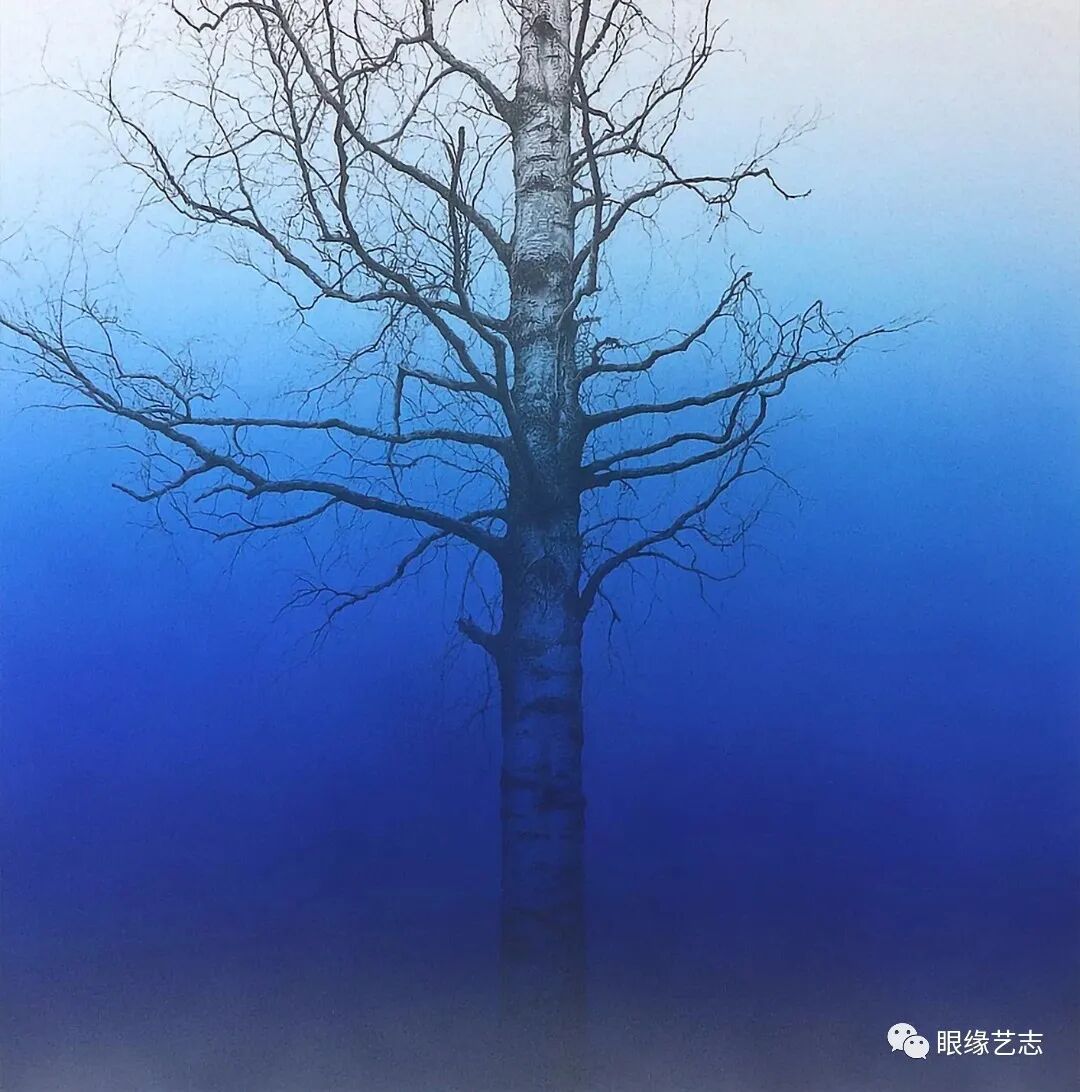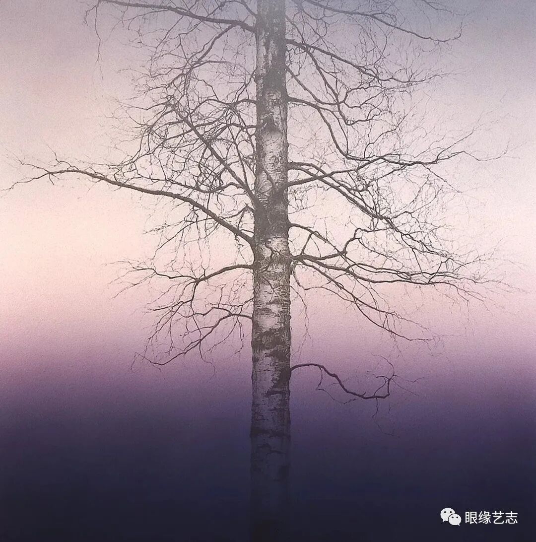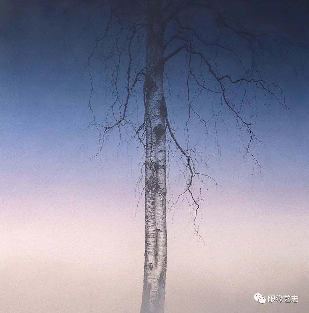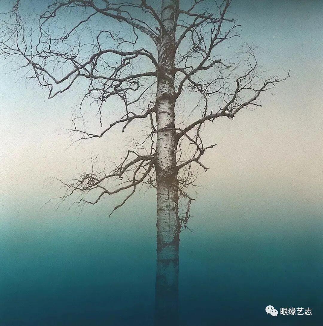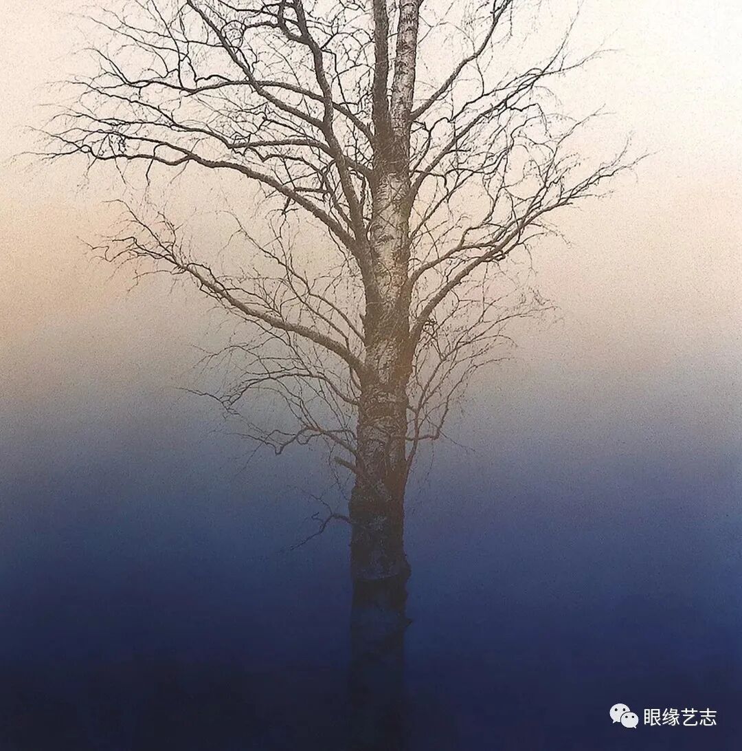 三棵年迈的桦树,矗立在浓雾弥漫的湖边。雾气冻结了偶尔闯入的阳光颗粒,仿佛沙漏里滑落的沙瞬间停止了流淌。宁静而刺骨的寒气中,时间也在为即将到来的凝固而祈祷——虽然是一幅画,但那里一定有一个完全不同的世界……