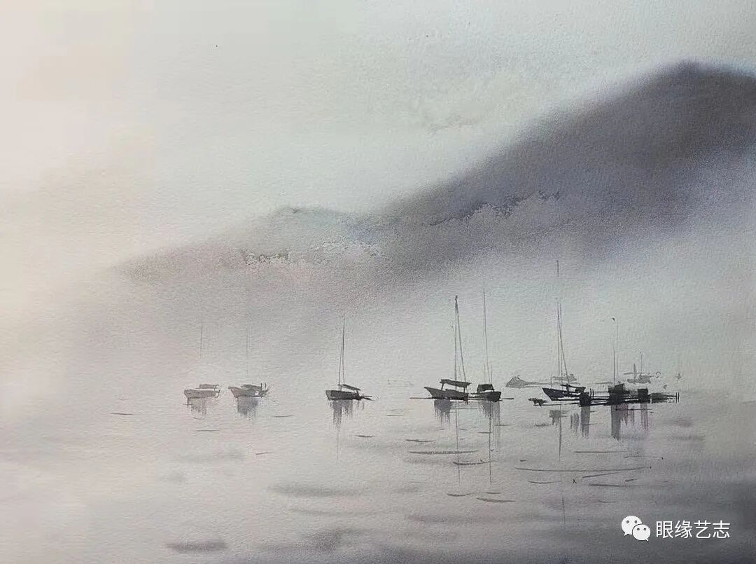 剪影,隐现于景色中的几点墨色,似是情愿待在这份淡淡的意境中,略去了色彩的侵扰,默默地追随着远山近水。在“他”的眼中,又是怎样的一片视野呢?