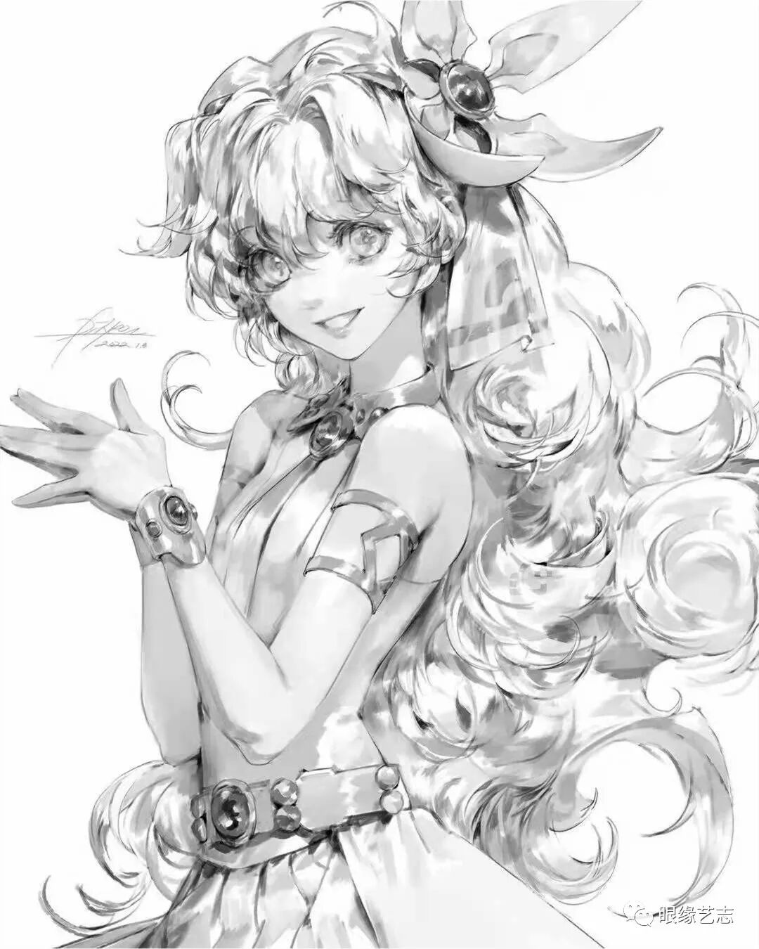 除去已着色的原画作品,Pilyeon高完成度的线稿也非常受欢迎。他的线稿作品繁复而不凌乱,适当的黑白明暗铺色,使画面在线稿阶段也可以呈现出不输于着色作品的立体感与完整性,成为其很多粉丝用来练习上色的绝佳底稿。