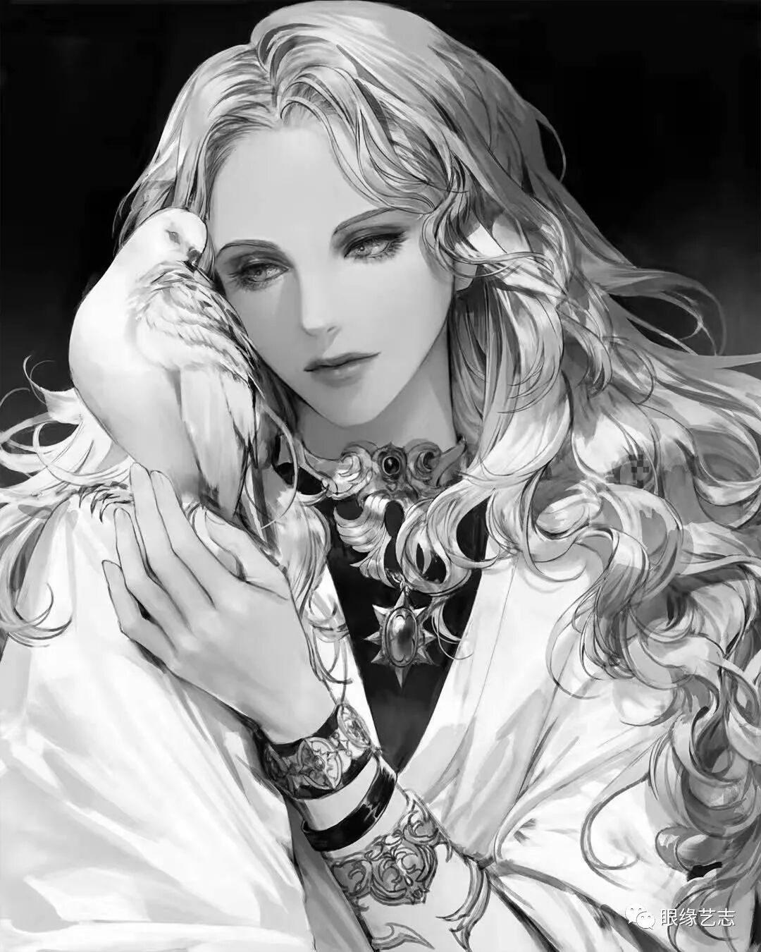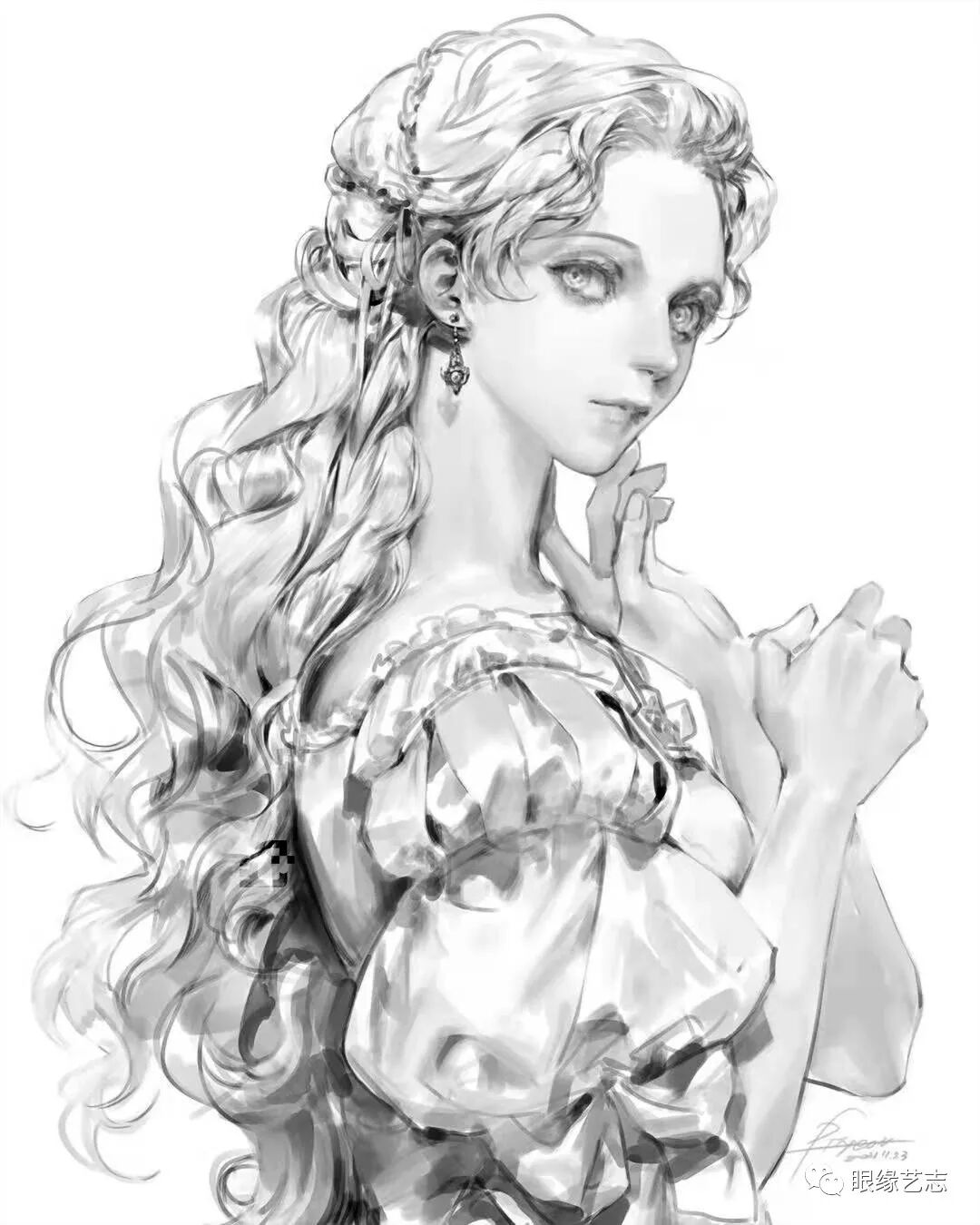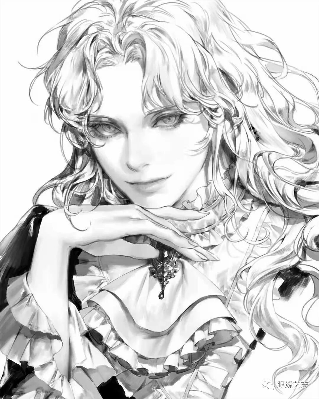 通过作品再现中世纪的欧洲宫廷,Pilyeon的作品更多强调的是人物神情与服饰的展现。他使用了大量细腻柔软的线条来表现人物的阴柔与邪魅,虽然大部分作品以线稿呈现,但简单的黑白灰色却足以使画面整体疏密得当。华丽的画风加之精致绝伦的勾勒,在复古与幻想之间,观者便完成了一次次的次元之旅。