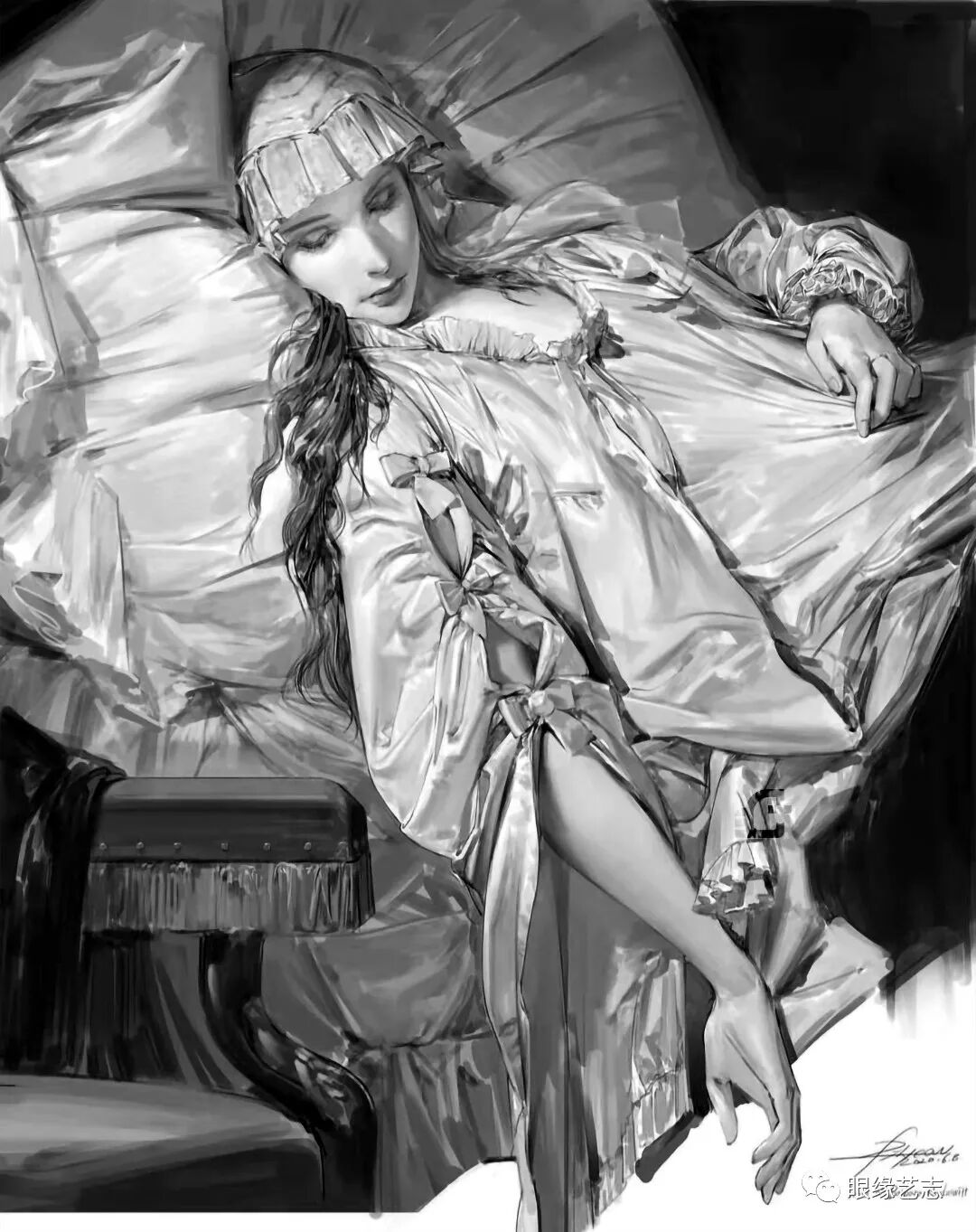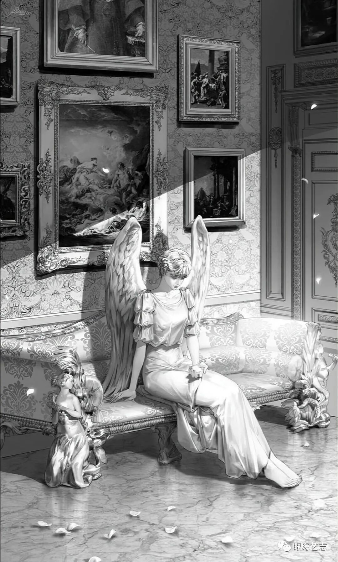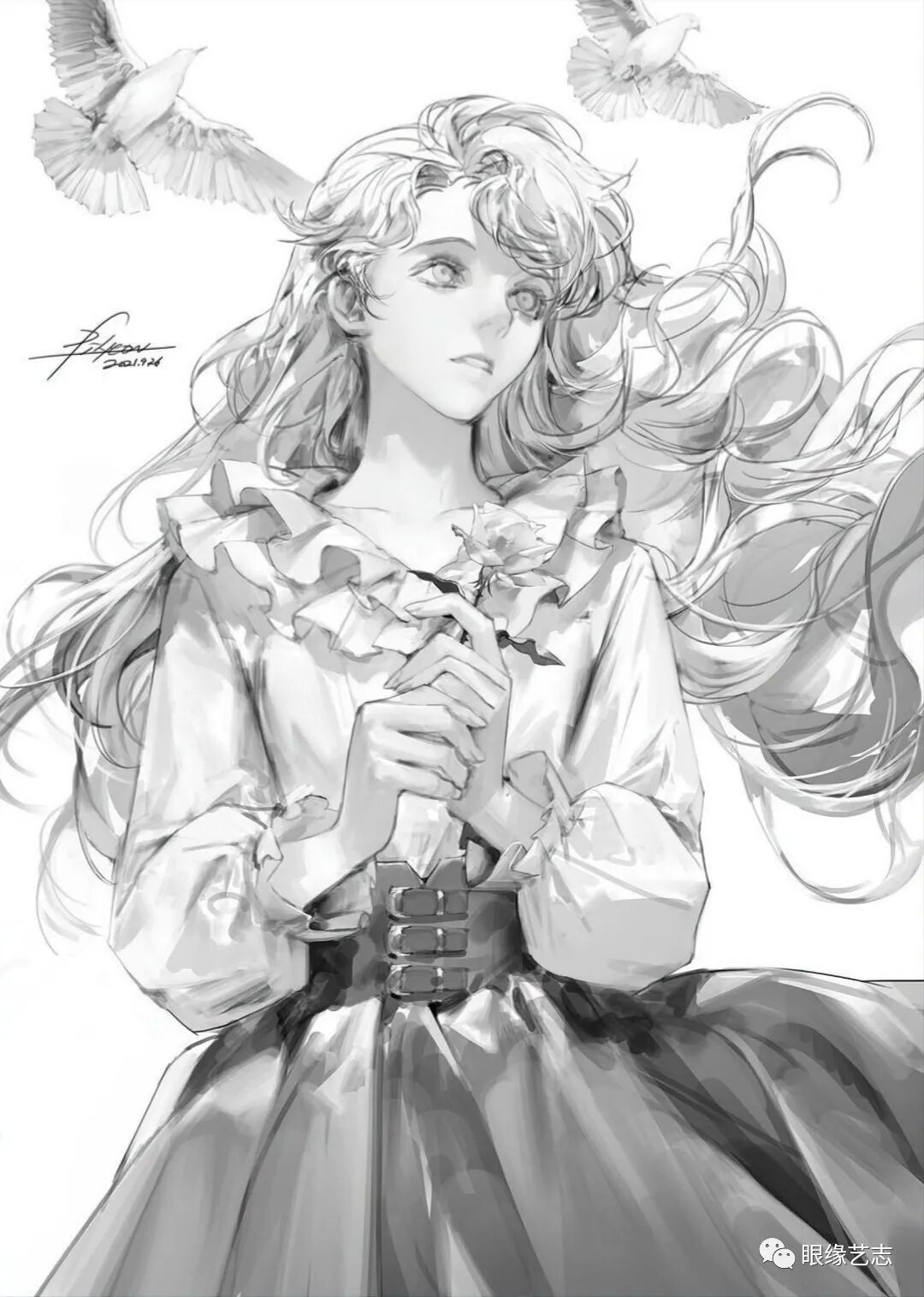 通过作品再现中世纪的欧洲宫廷,Pilyeon的作品更多强调的是人物神情与服饰的展现。他使用了大量细腻柔软的线条来表现人物的阴柔与邪魅,虽然大部分作品以线稿呈现,但简单的黑白灰色却足以使画面整体疏密得当。华丽的画风加之精致绝伦的勾勒,在复古与幻想之间,观者便完成了一次次的次元之旅。
