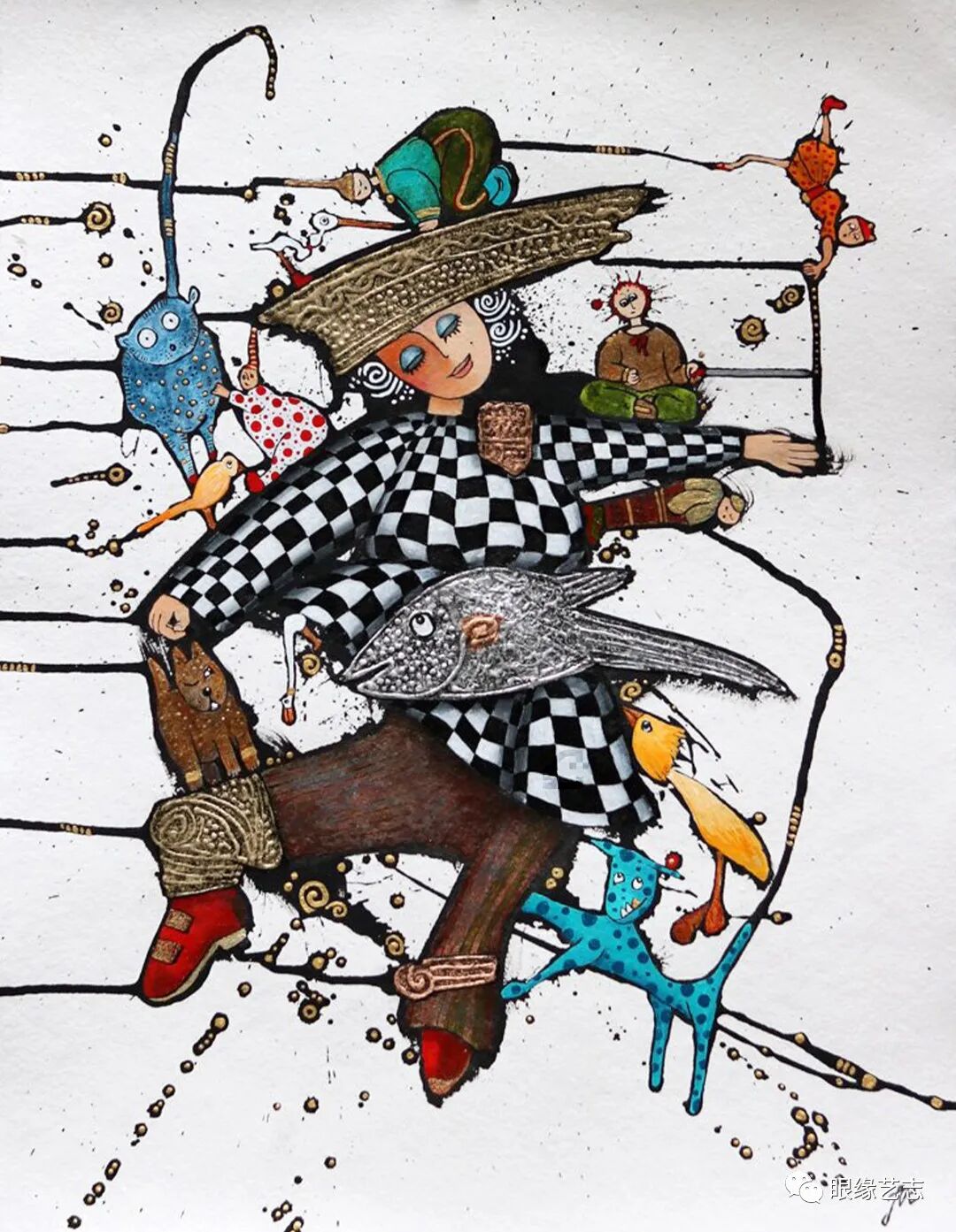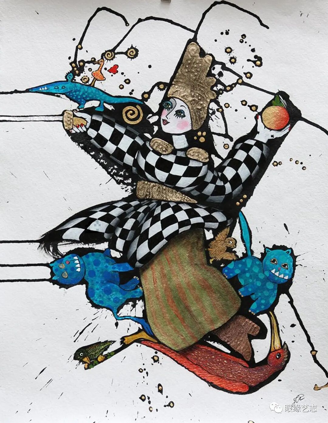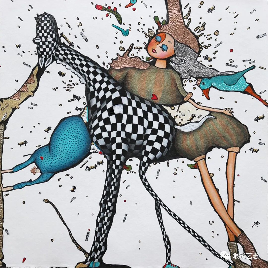 从无形的混乱发展到完整的图像,在无比葱郁的想象空间里,杰特·莱纳特让我们遇见了宇宙舞者、太空骑师以及一众古灵精怪的角色。在棉质纸张或者亚麻帆布的表面、平和且中性的背景色调中,几乎跃动而出的人物与动物是无拘无束的、想象力盛放的枝芽。而那一再出现的格子图案必然是画者执拗的情结,且已然成为她标志性的视觉符号,固执地彰显着一种和谐的韵律、一种动感的平衡、一种旨在点燃快乐的美感。