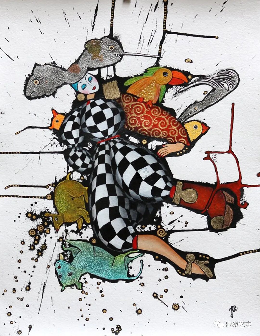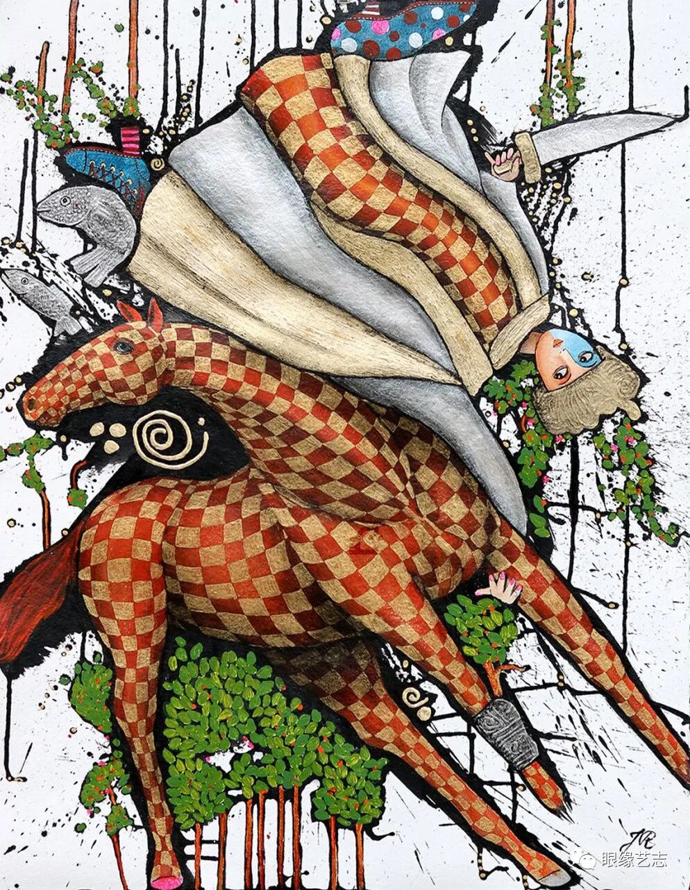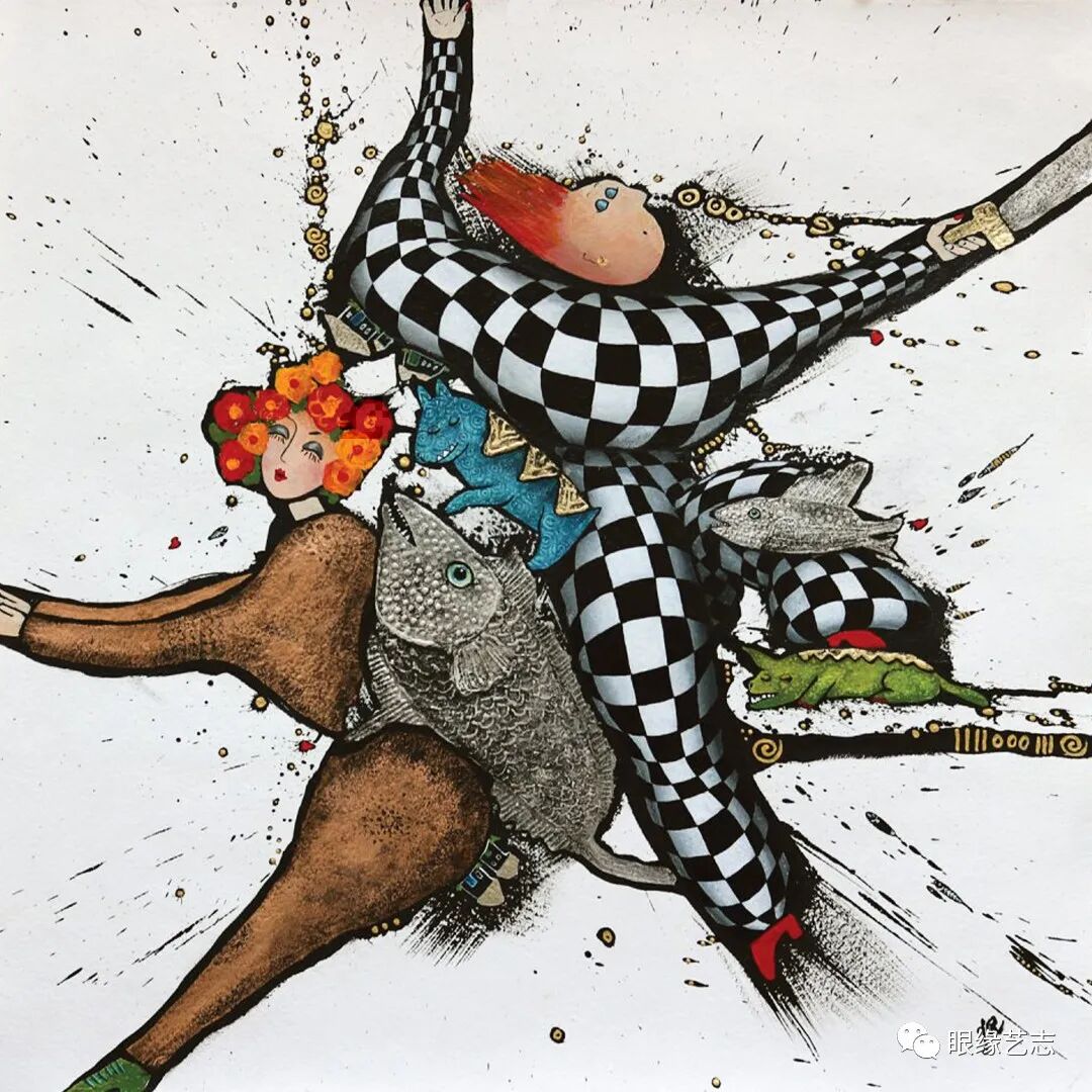 从无形的混乱发展到完整的图像,在无比葱郁的想象空间里,杰特·莱纳特让我们遇见了宇宙舞者、太空骑师以及一众古灵精怪的角色。在棉质纸张或者亚麻帆布的表面、平和且中性的背景色调中,几乎跃动而出的人物与动物是无拘无束的、想象力盛放的枝芽。而那一再出现的格子图案必然是画者执拗的情结,且已然成为她标志性的视觉符号,固执地彰显着一种和谐的韵律、一种动感的平衡、一种旨在点燃快乐的美感。