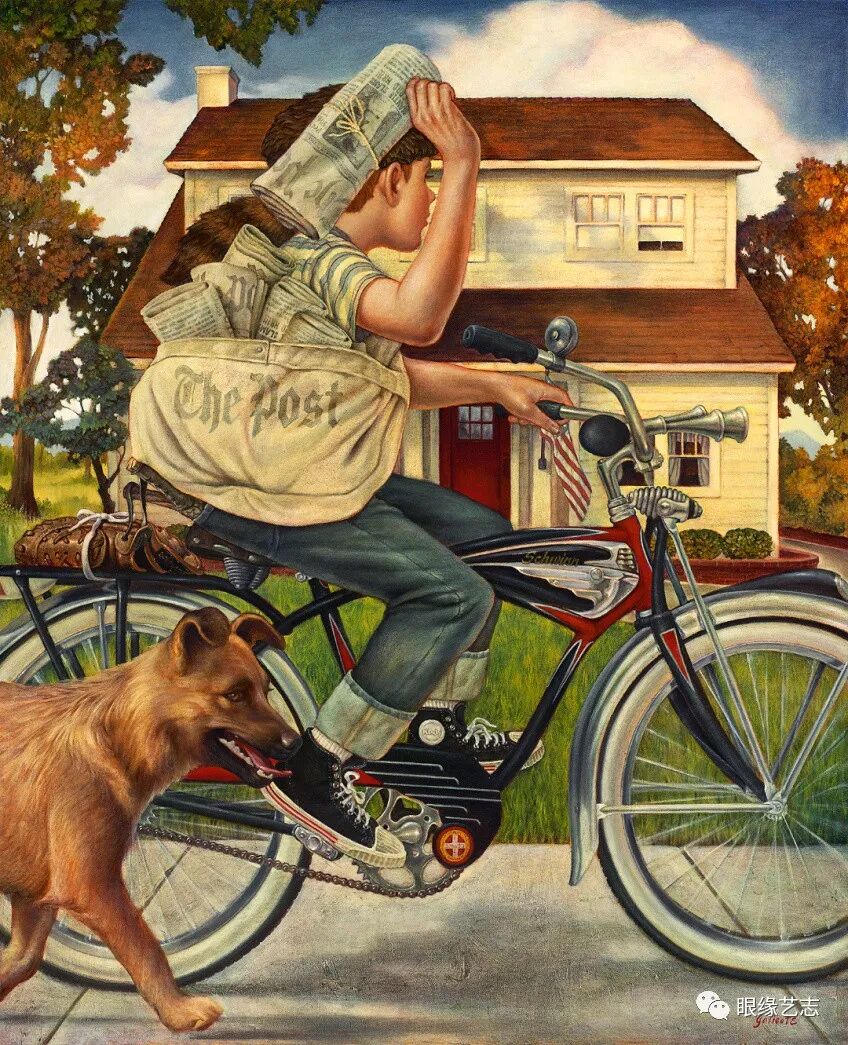 在昔日的一个时间框架内,一个典型的美国小镇通常会有几家食品店、杂货店、小酒吧、电影院以及各家分散的农场,那里居住着努力工作赚钱的男人与女人,他们的生活游走在热狗、棒球、甜点、咖啡与雪佛兰皮卡之间。我知道直到现在仍有一些小镇延续着这种传统的美国生活方式,但并不多见。好吧,那个时代已经过去了,但至少的我的画里,那些印记仍然存在。