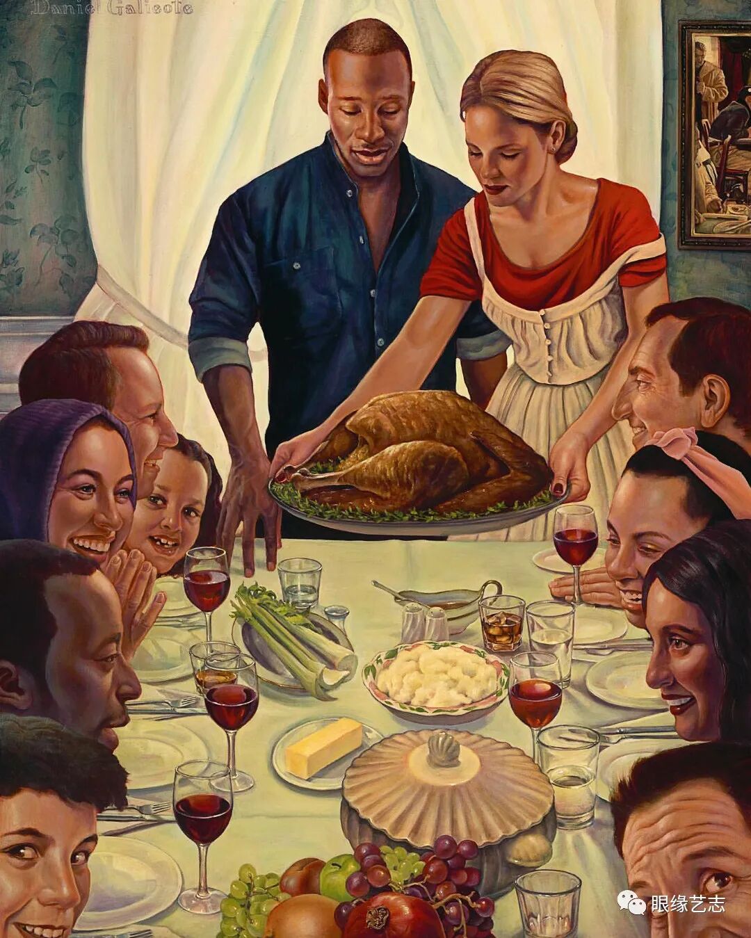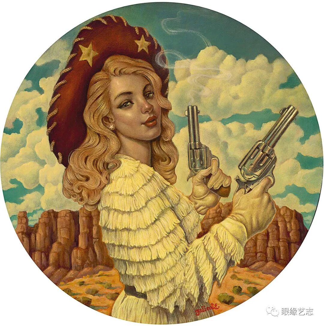 致敬意大利文艺复兴时期的一众戏剧大师,从保罗·卡德摩斯、乔治·贝洛斯、托马斯·哈特·本顿和格兰特·伍德等美国画家的新世界乐观主义中汲取灵感,再以洛克威尔式幽默的险恶转折来完结这一切——虽然加里奥特的作品常常以时尚的旧时场景为特色,但他却将这样的怀旧情感归于对人性普遍与永恒主题的追求。