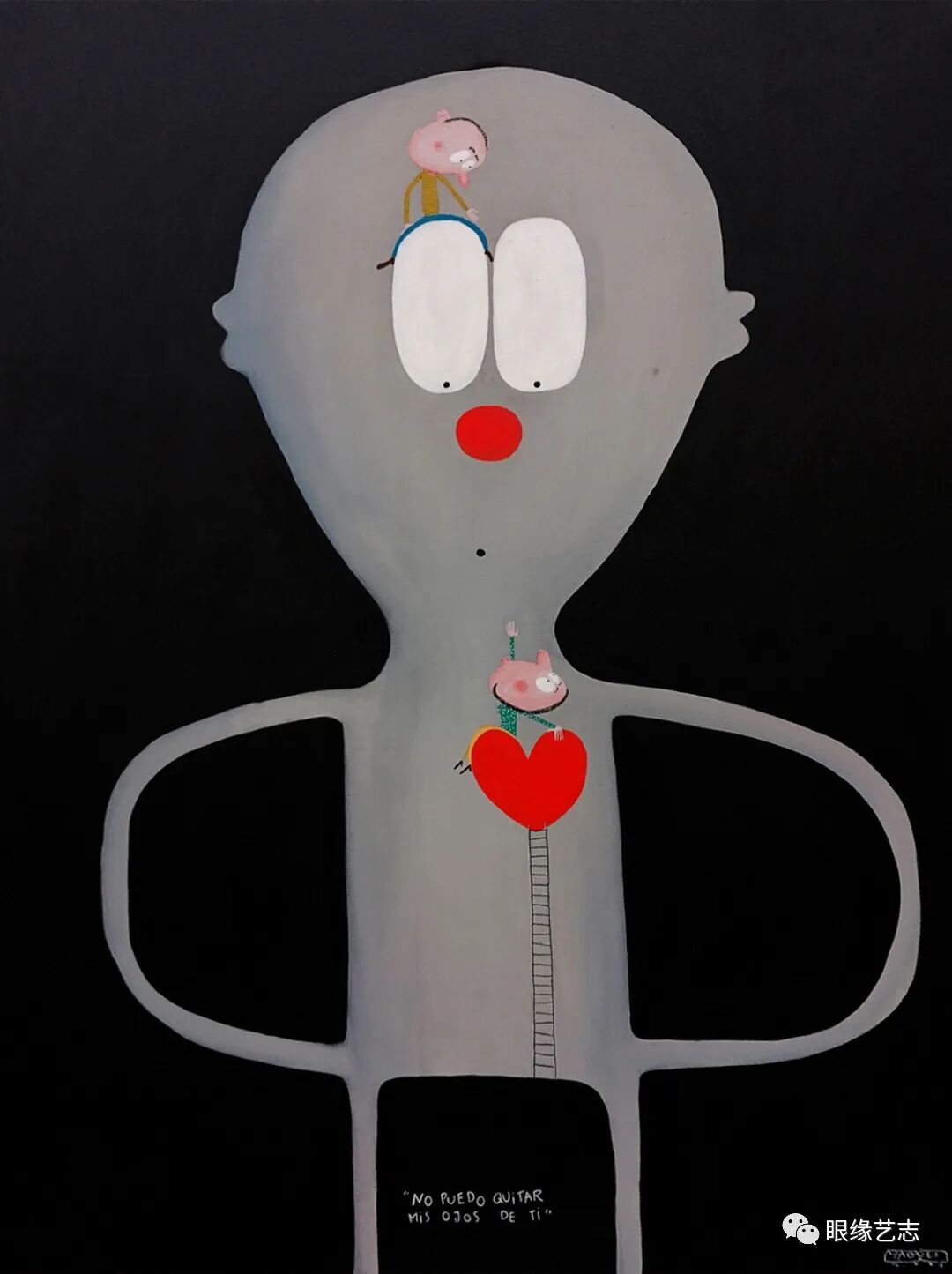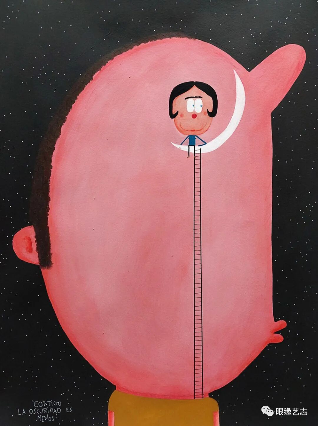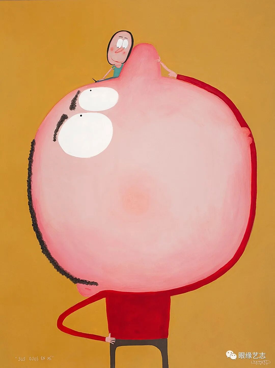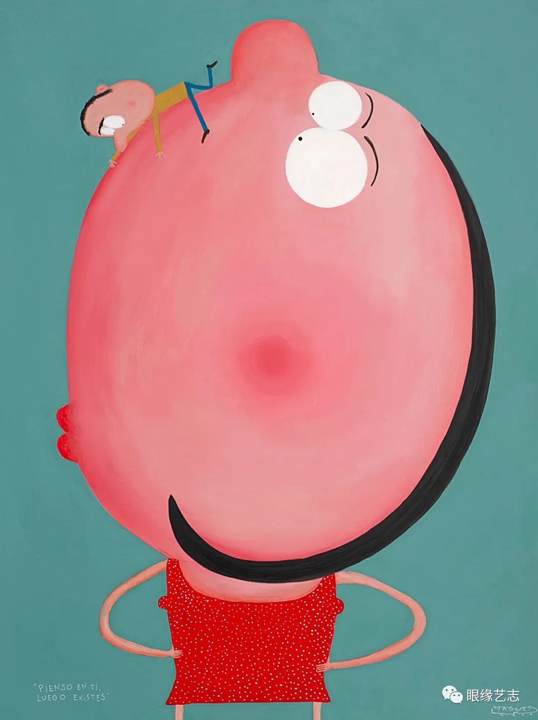 不过显然,莫伊塞斯·亚格斯是个“叛逆的小男孩”,他用硕大的头颅塑造小人物,在戏剧性十足的画面中表达存在主义的脆弱性;再用善意的幽默打造避雷针,在现实之电即将击穿身躯的时候却给予人们一种满含讽刺意味的抵抗力——这是莫伊塞斯·亚格斯遏制现实世界破坏性的方式,当他拿起画笔,便将其转化为创造力的源泉。