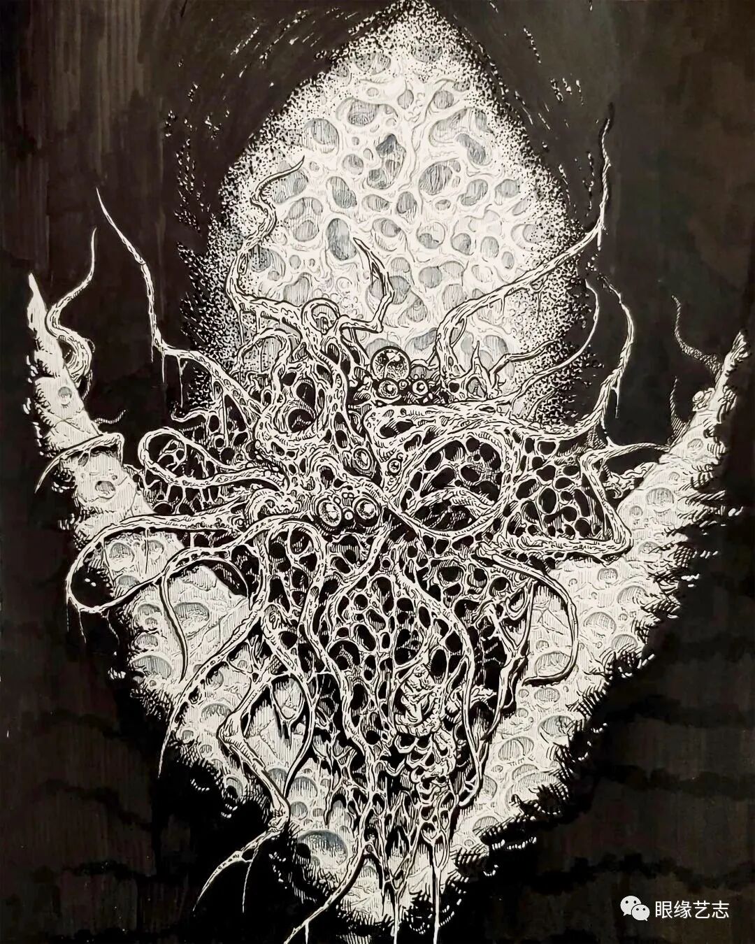 相较于洛夫克拉夫特的宇宙悲观主义,实际上,我对他的宇宙非人文主义更感兴趣。作为一位作家,其作品所营造的强烈视觉感对于任何想要绘制怪物和外星神灵的人来说都是一种享受。