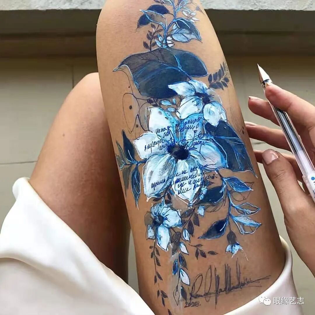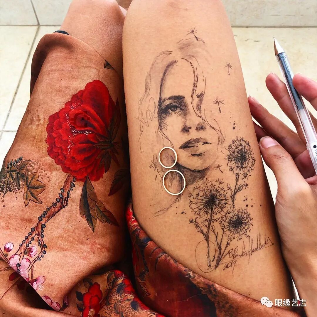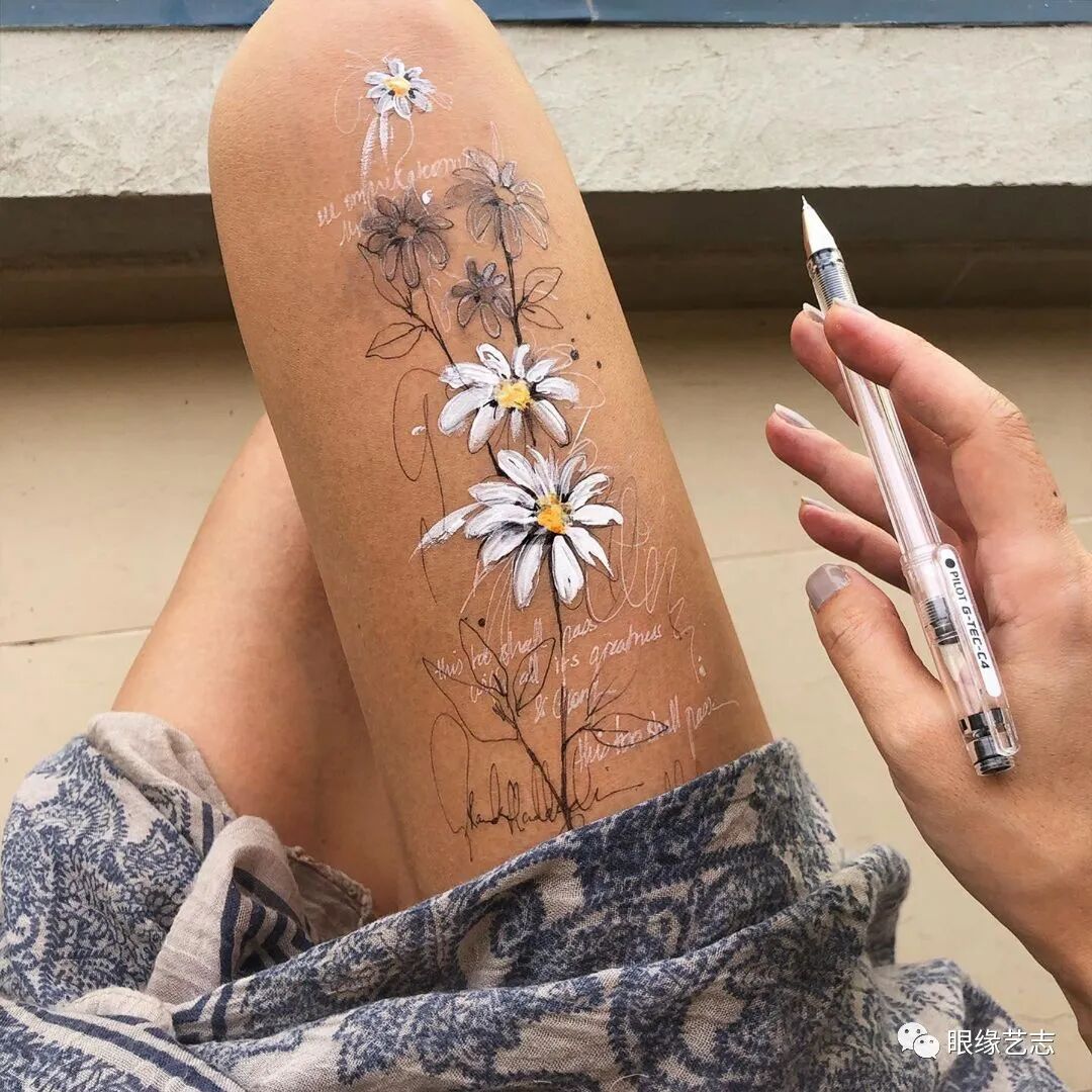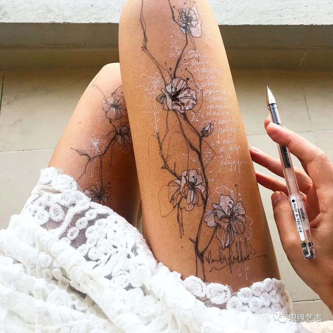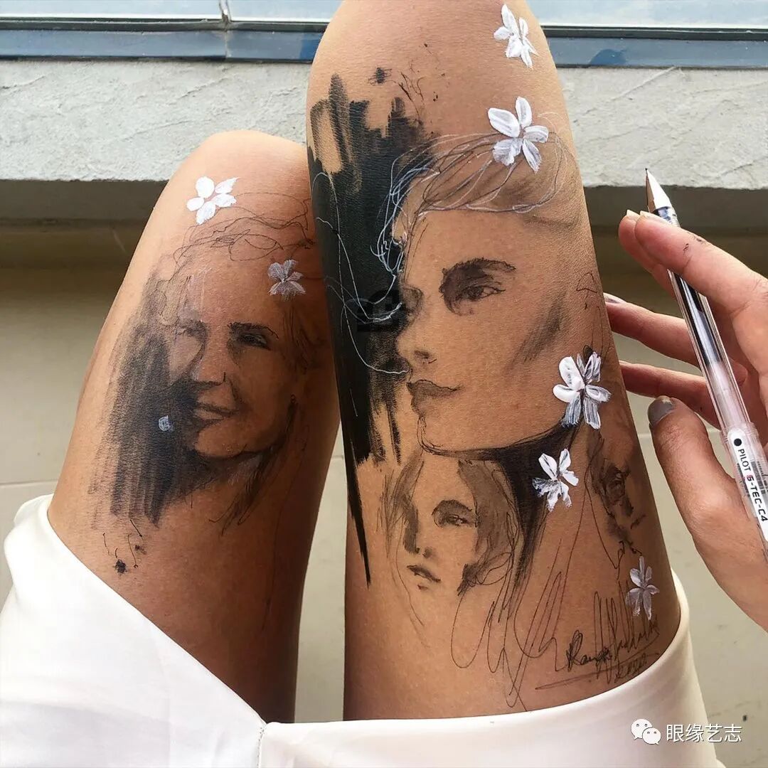 心魔与梦想、城市与环境、人物与时尚无时无刻不在启发着我,每一次在腿上的涂鸦都是一场自我发现的疗愈之旅。我能感受到落在我皮肤上的每一笔、每一划,这些转瞬而逝的作品就是我的视觉日记。