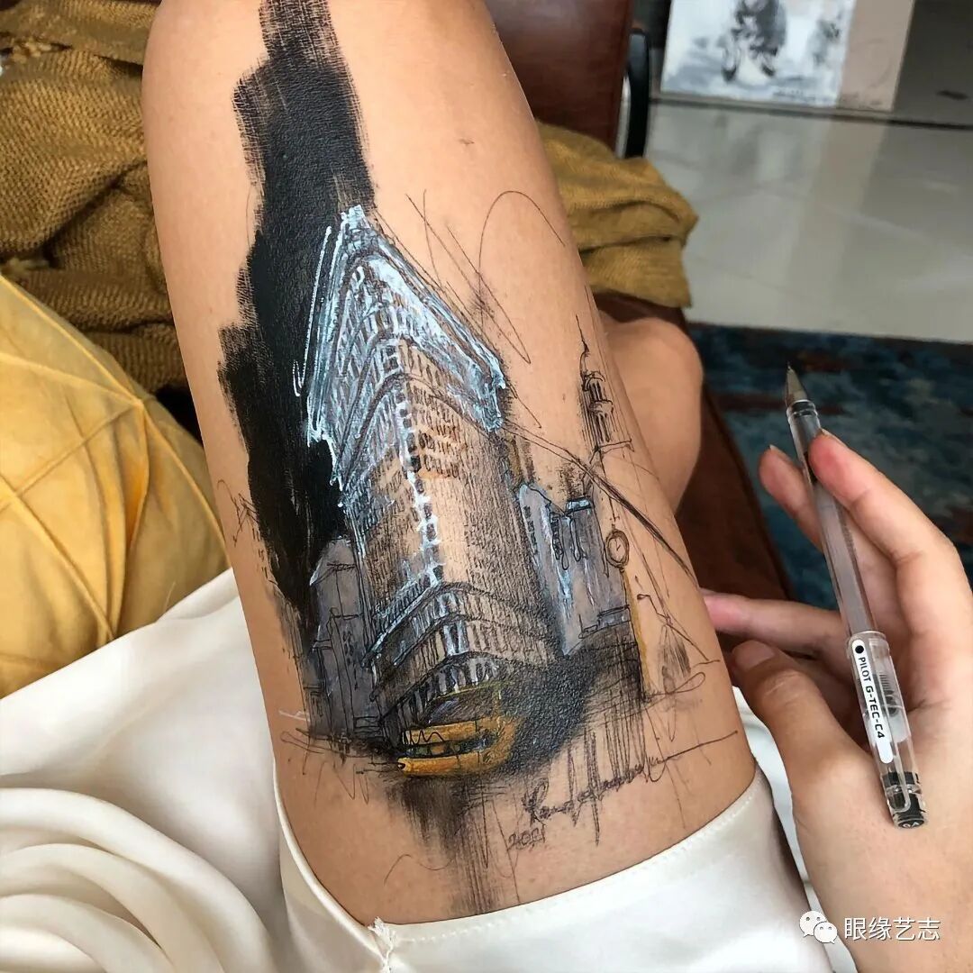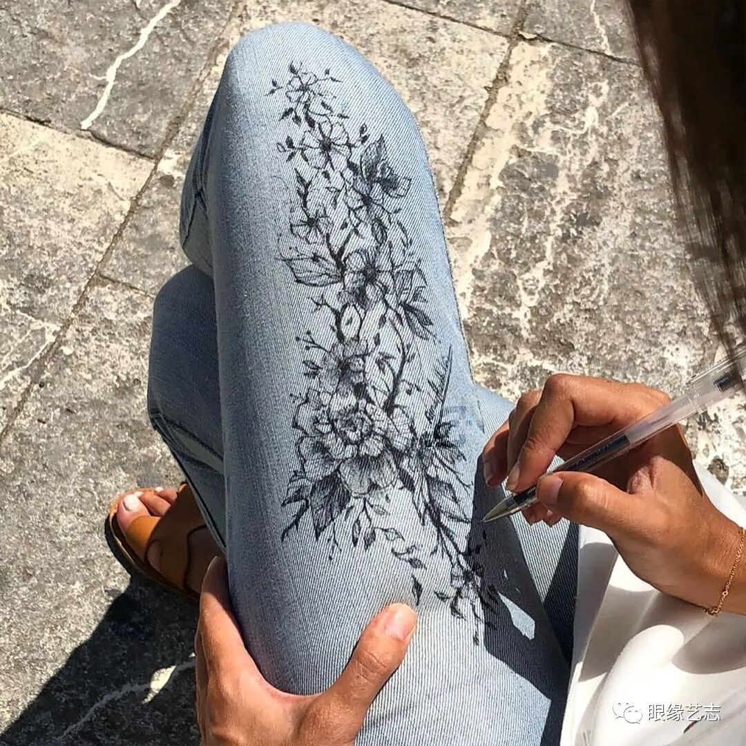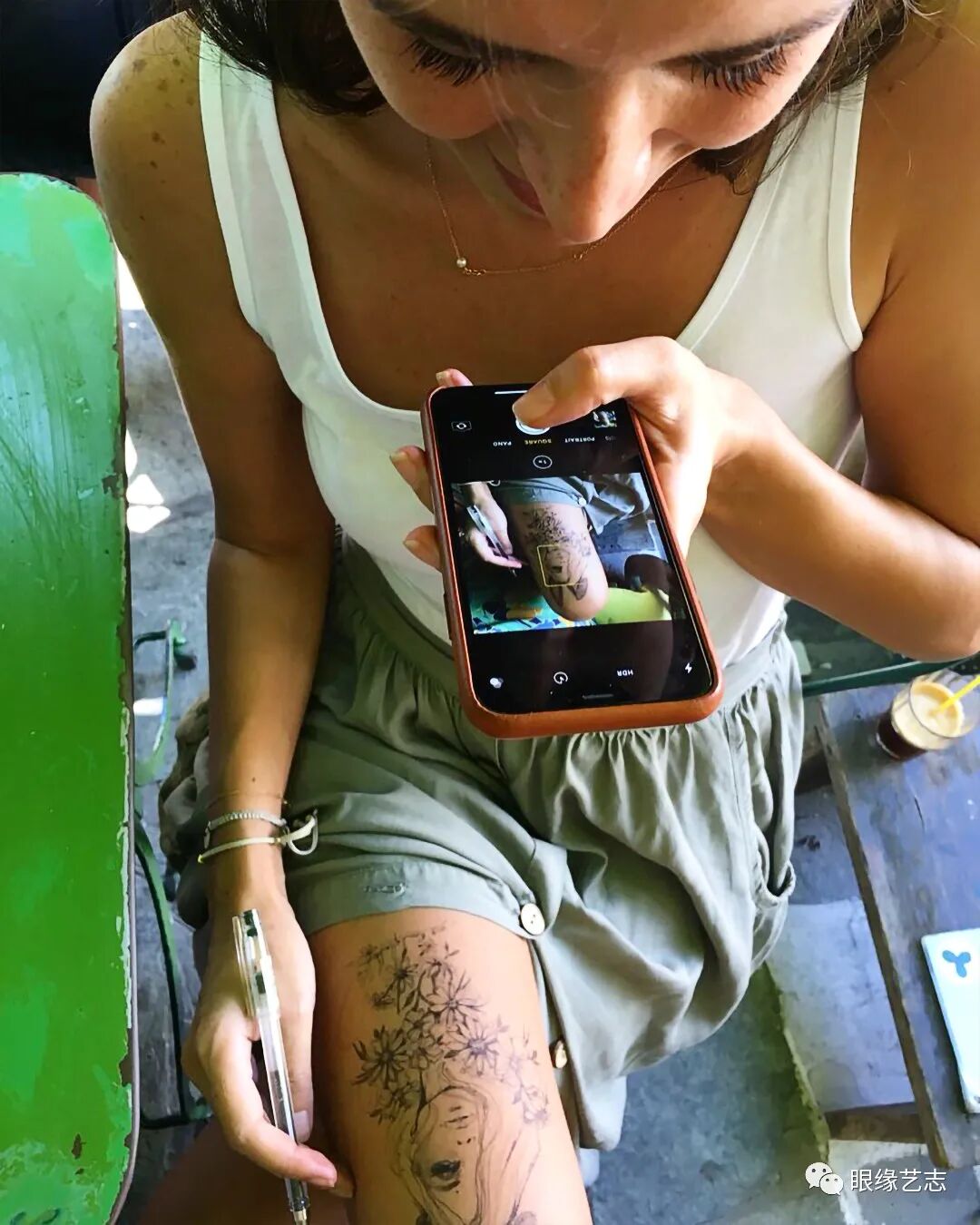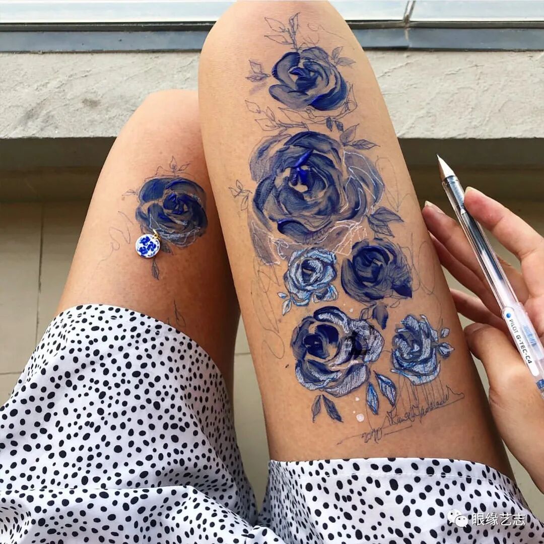 心魔与梦想、城市与环境、人物与时尚无时无刻不在启发着我,每一次在腿上的涂鸦都是一场自我发现的疗愈之旅。我能感受到落在我皮肤上的每一笔、每一划,这些转瞬而逝的作品就是我的视觉日记。